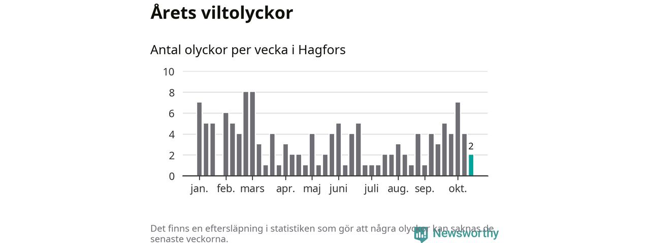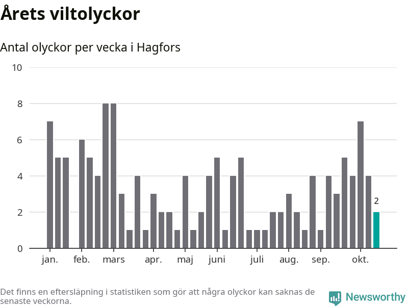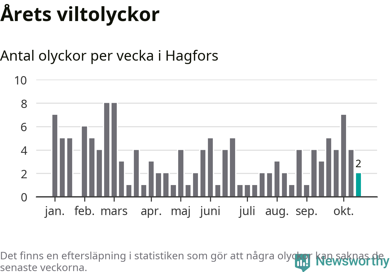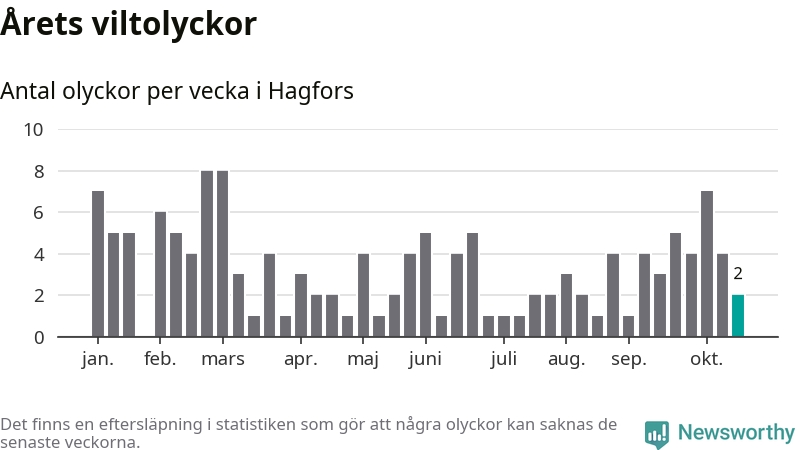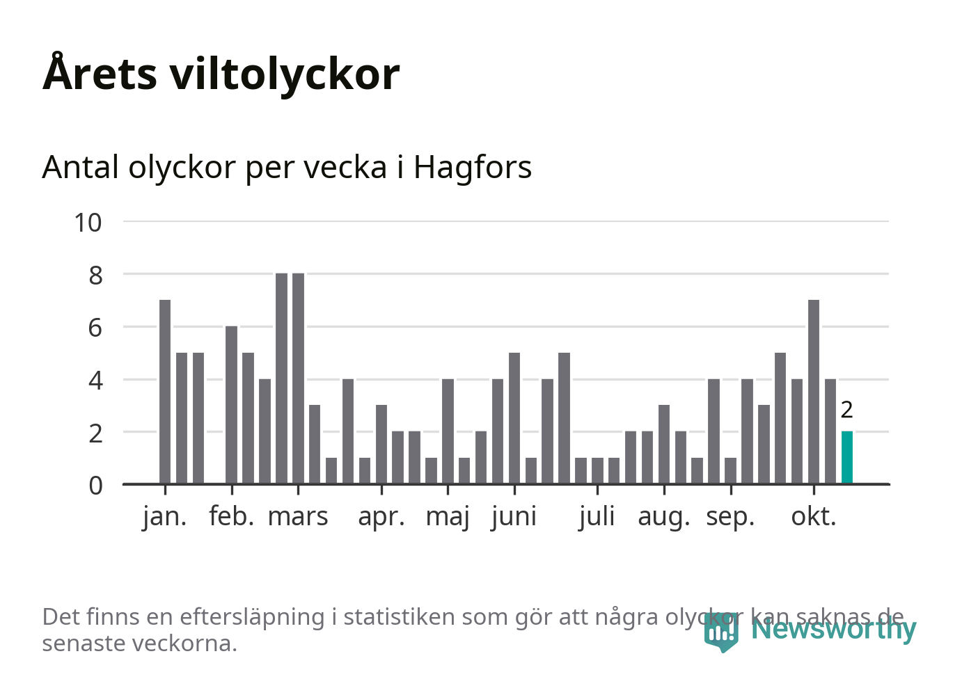 Hittills har två viltolyckor rapporterats in i Hagfors kommun från vecka 43. Se listan här.