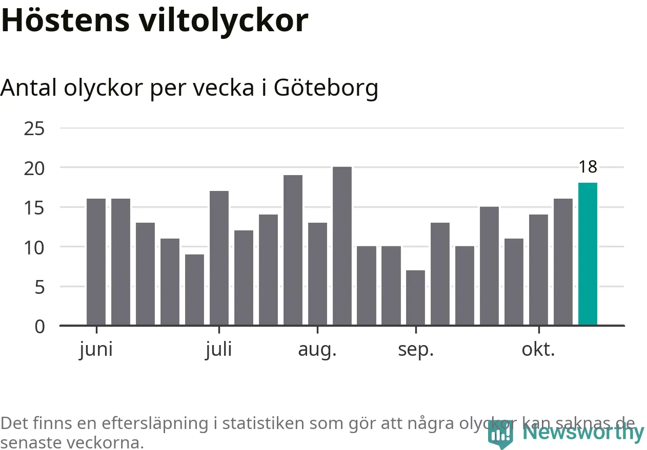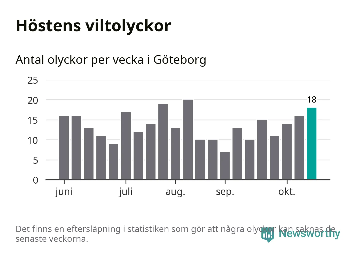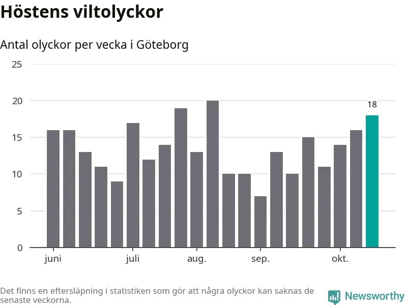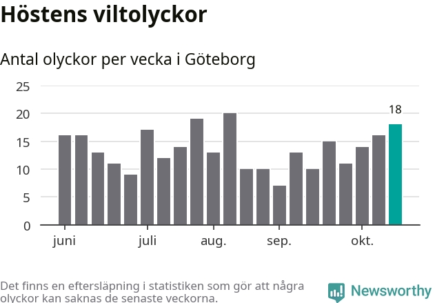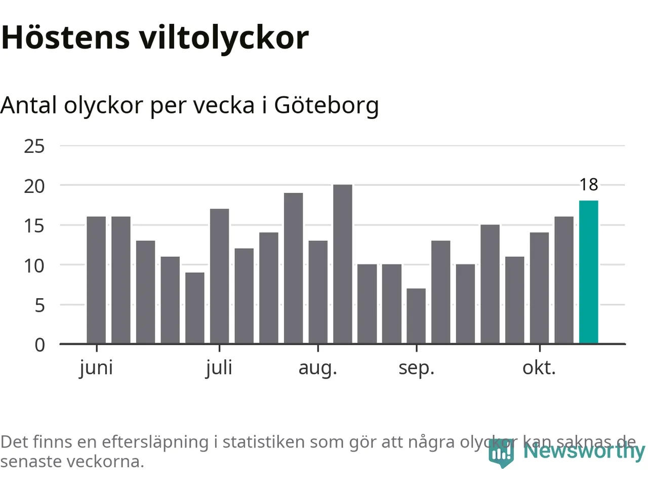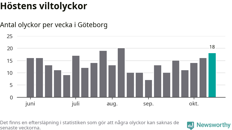 18 olyckor är ovanligt många för en höstvecka. Bara fyra gånger tidigare sedan 2015 har det skett
