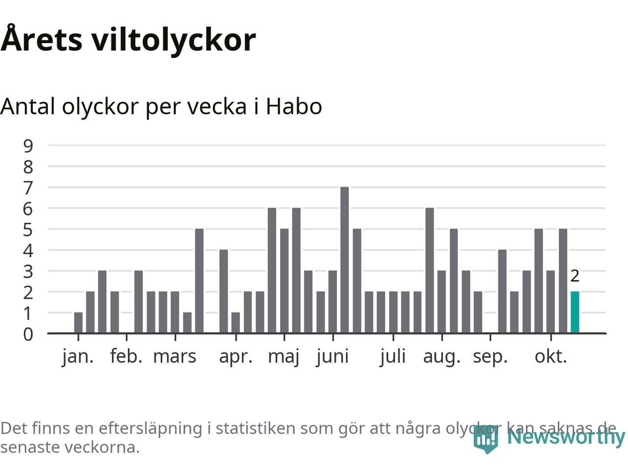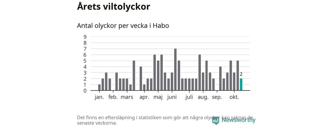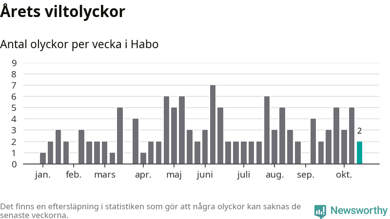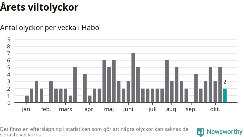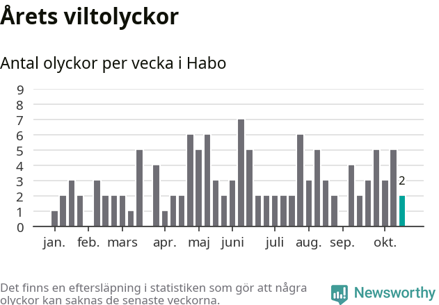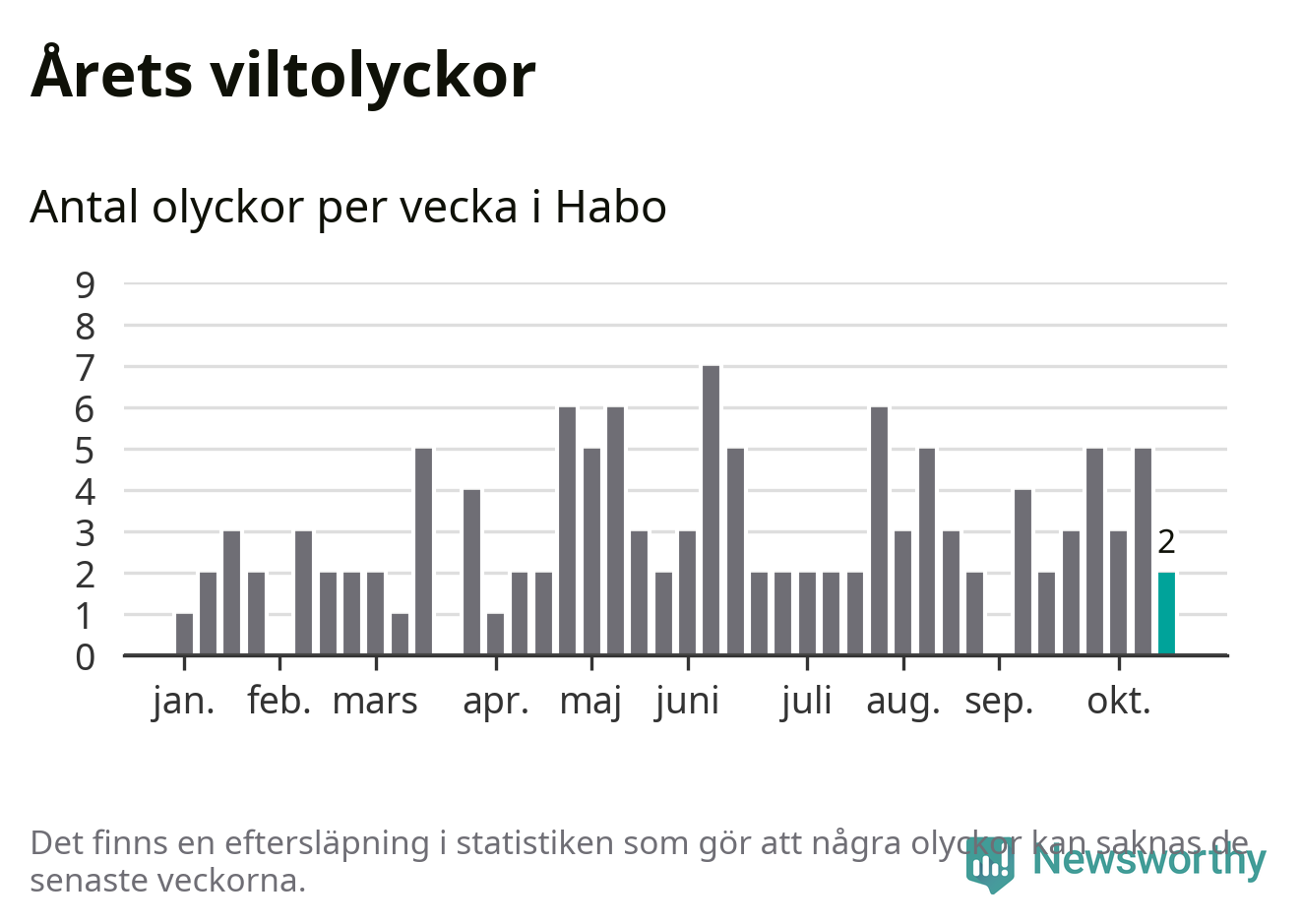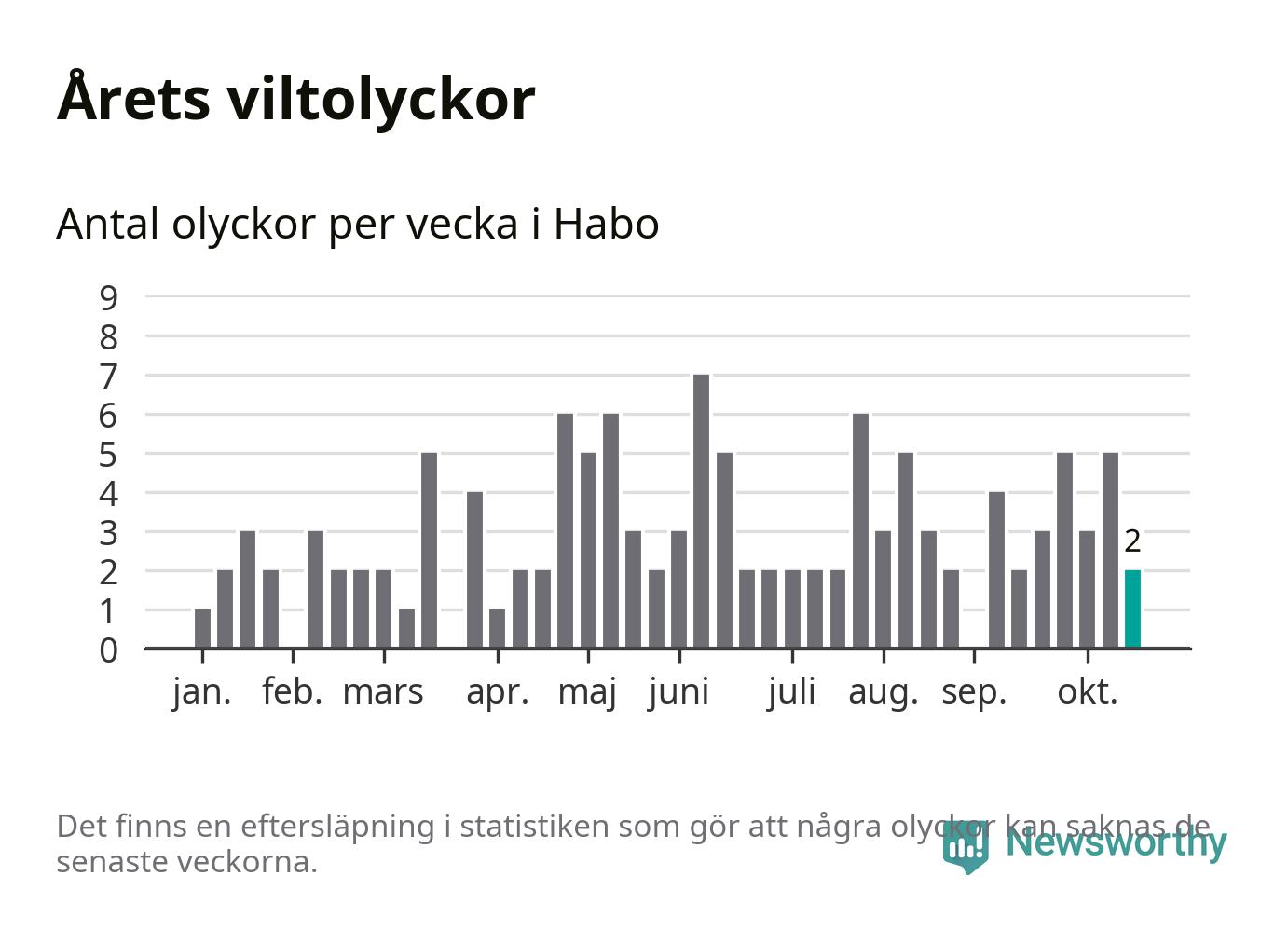 Hittills har två viltolyckor rapporterats in i Habo kommun från vecka 43. Se listan här.
