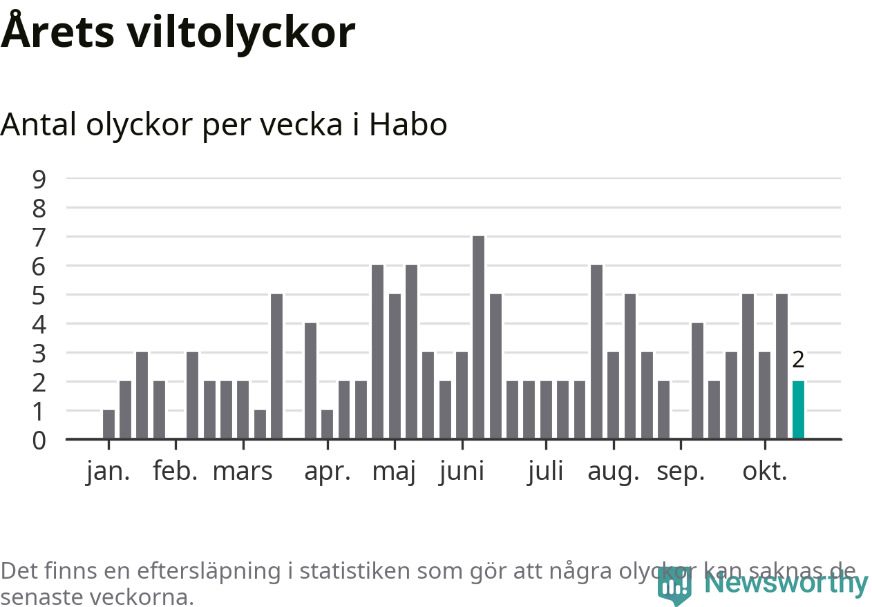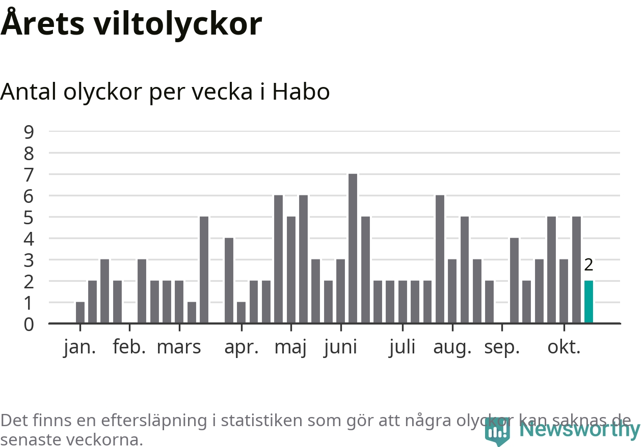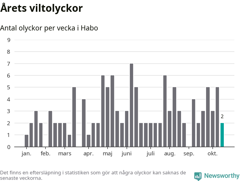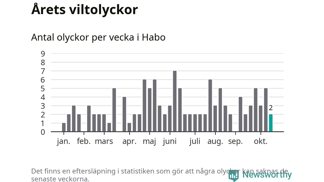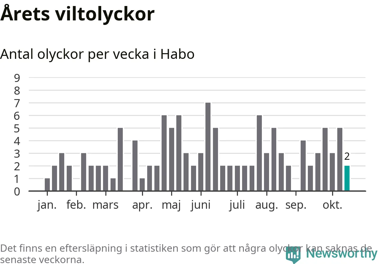Hittills har två viltolyckor rapporterats in i Habo kommun från vecka 43. Se listan här.