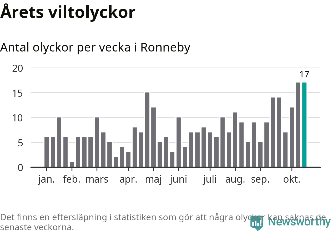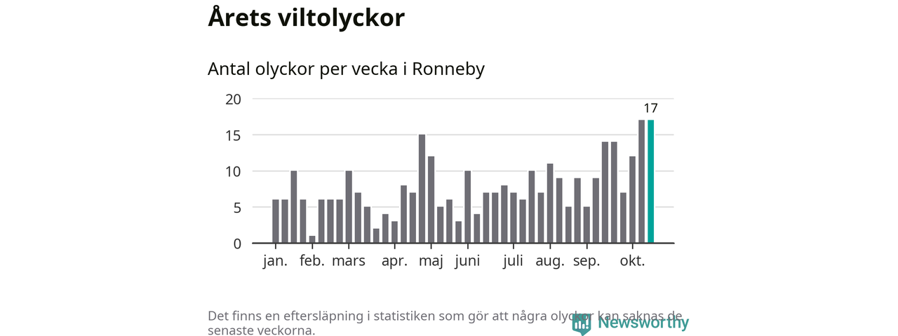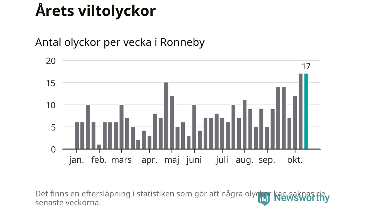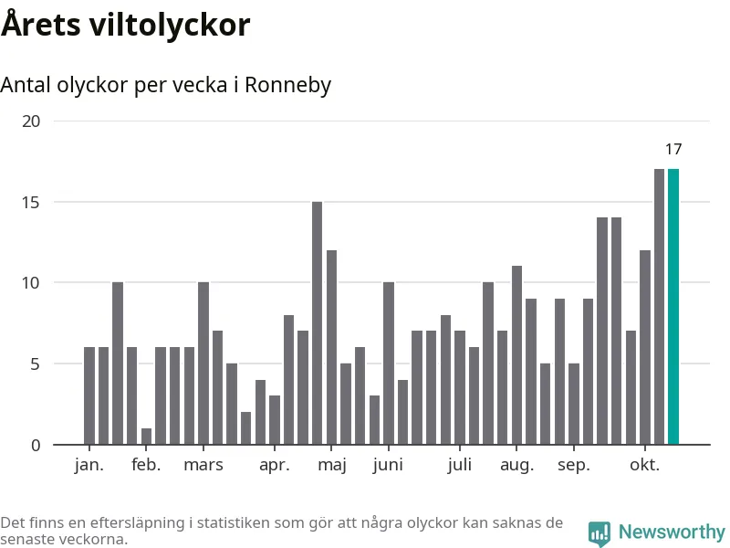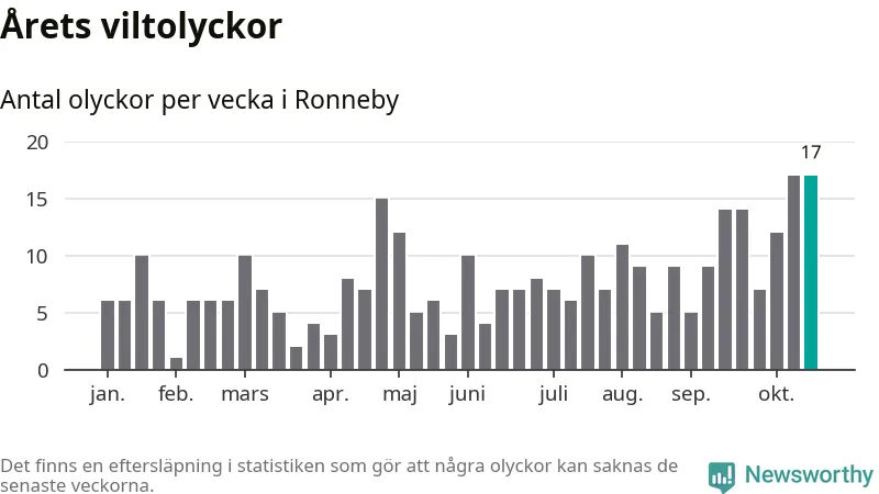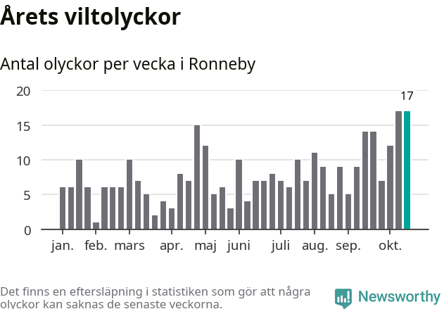 17 olyckor på en enda vecka är däremot ovanligt många. Bara fyra gånger tidigare sedan 2015 har det skett
