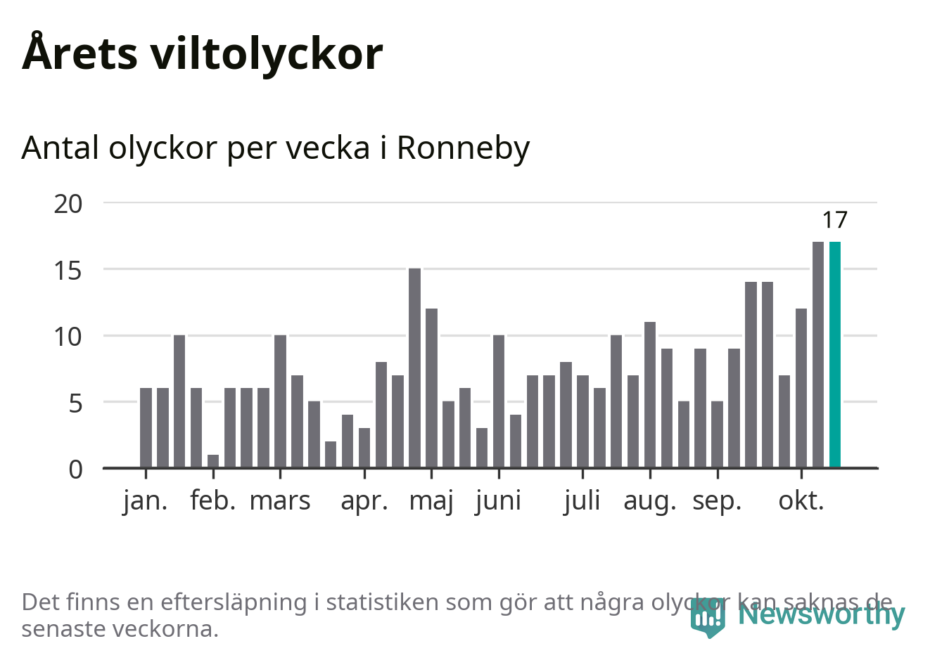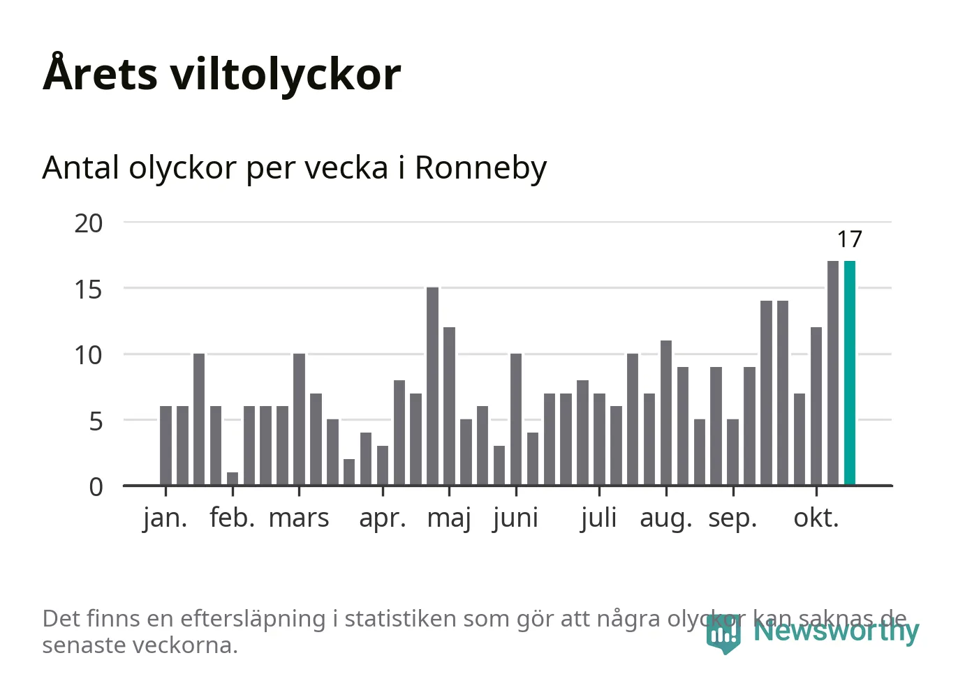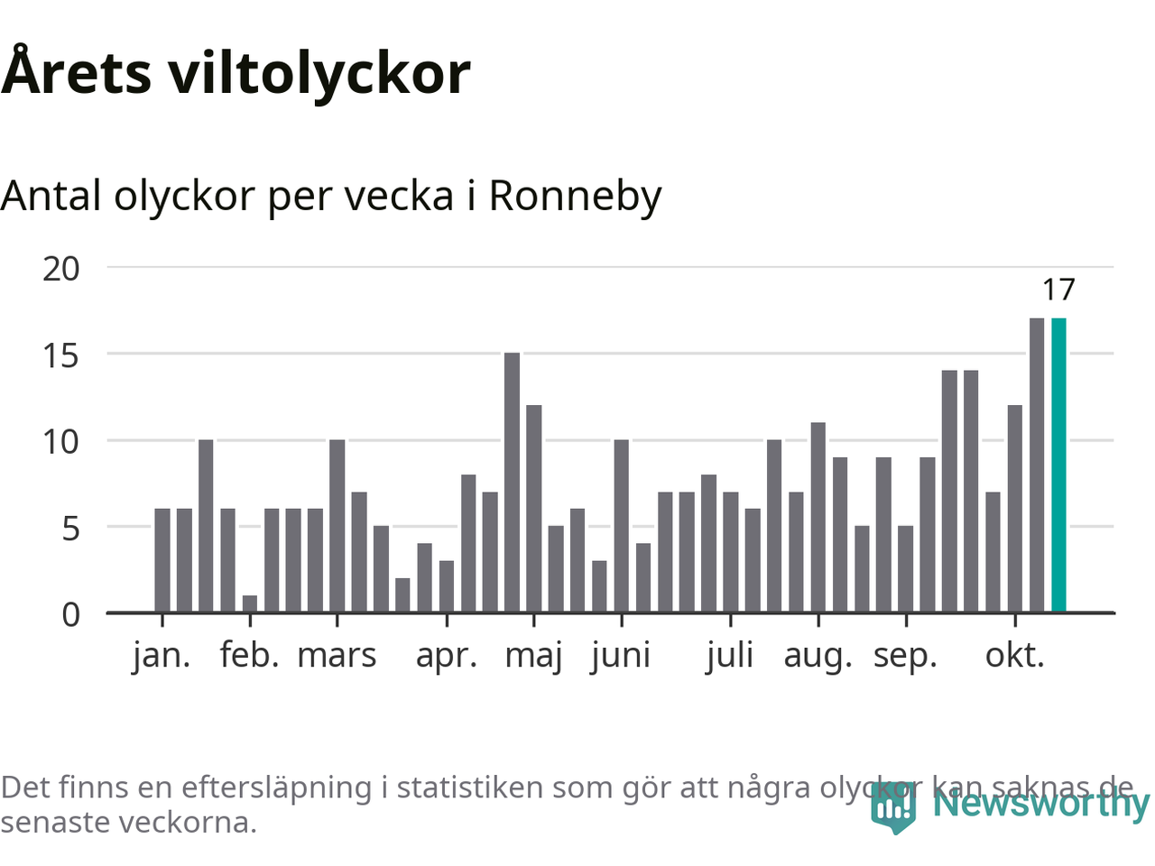 17 olyckor på en enda vecka är däremot ovanligt många. Bara fyra gånger tidigare sedan 2015 har det skett
