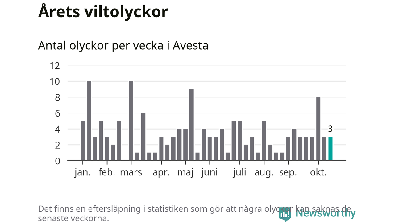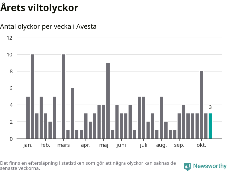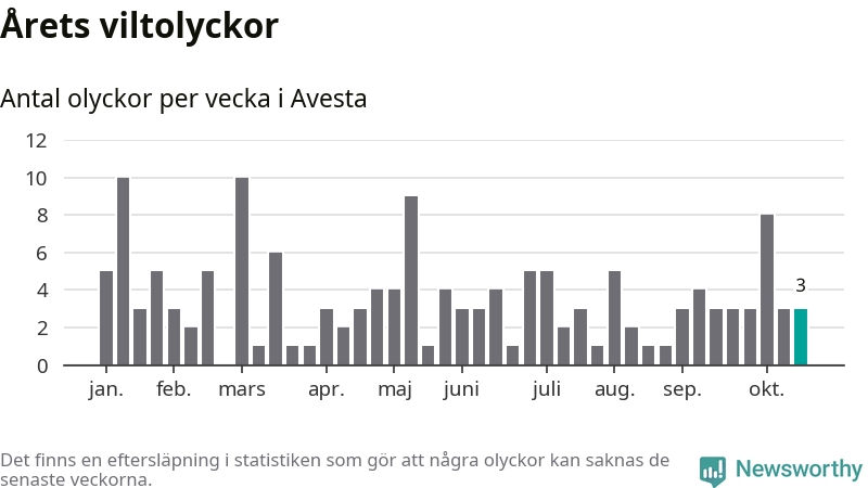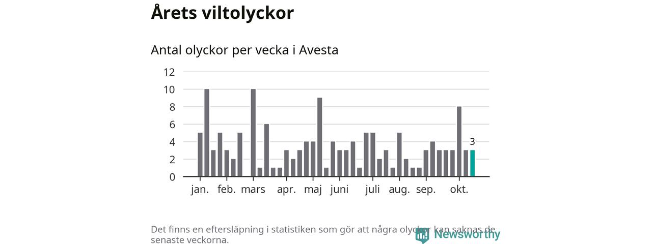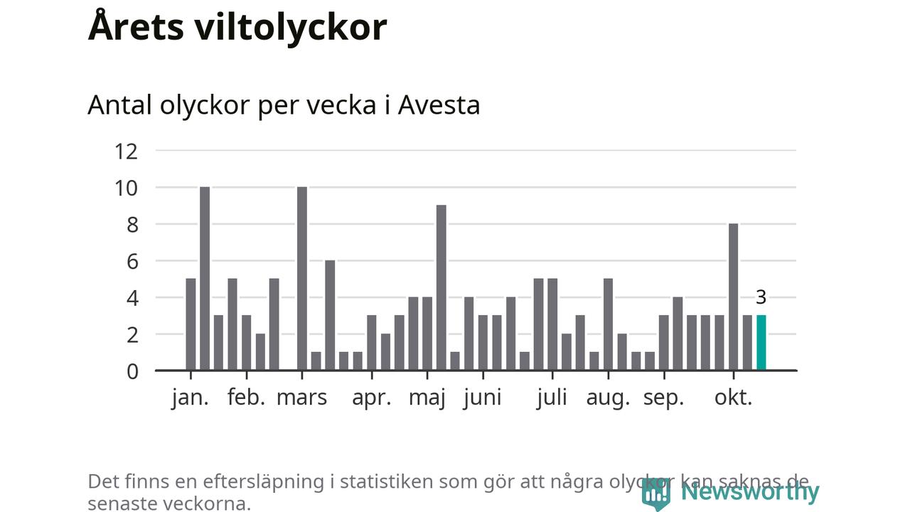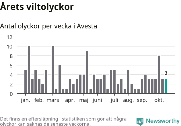 Hittills har tre viltolyckor rapporterats in i Avesta kommun från vecka 43. Se listan här.