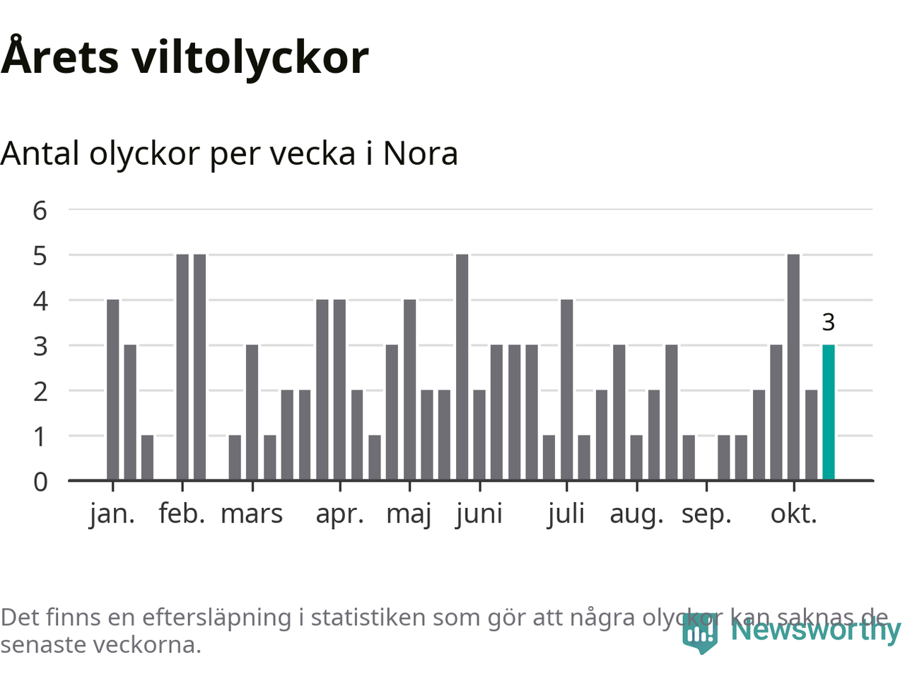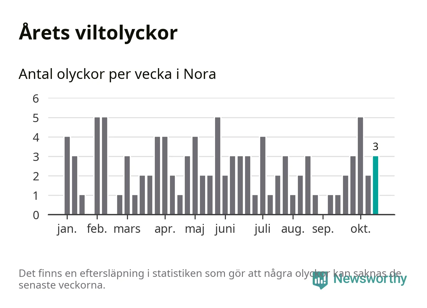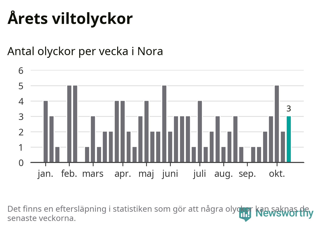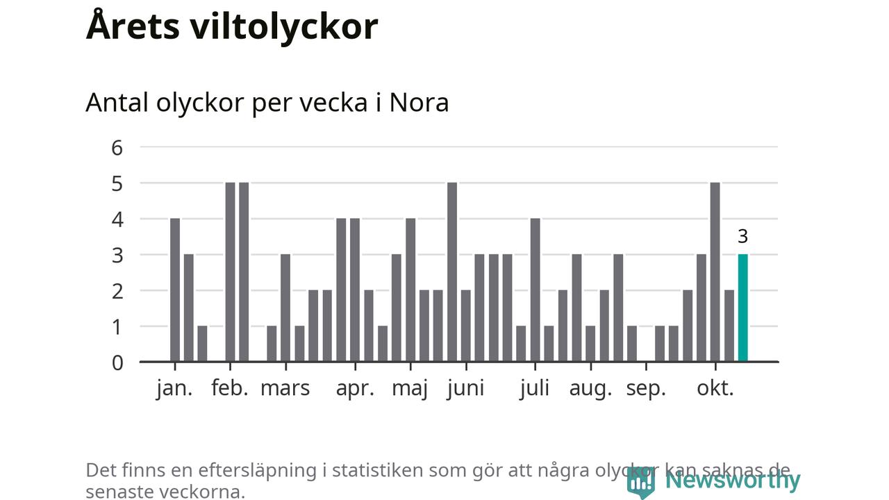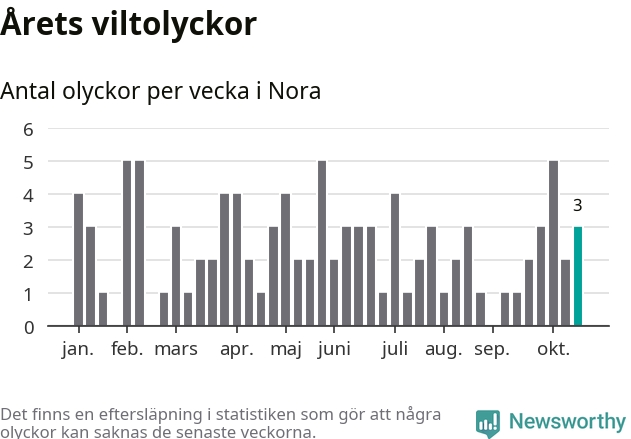 Hittills har tre viltolyckor rapporterats in i Nora kommun från vecka 43. Se listan här.