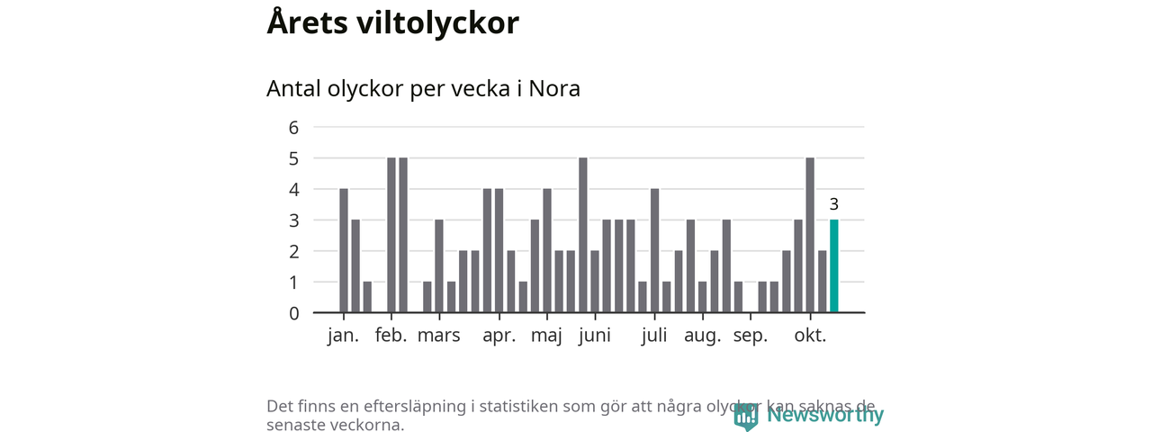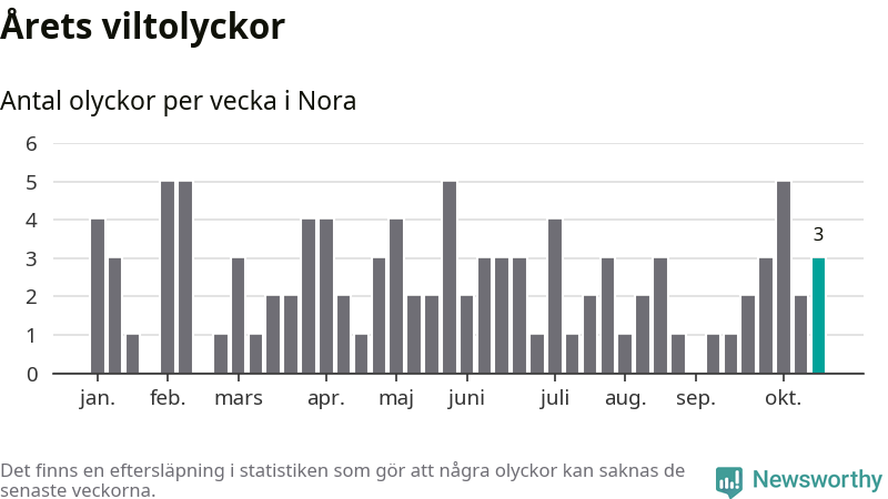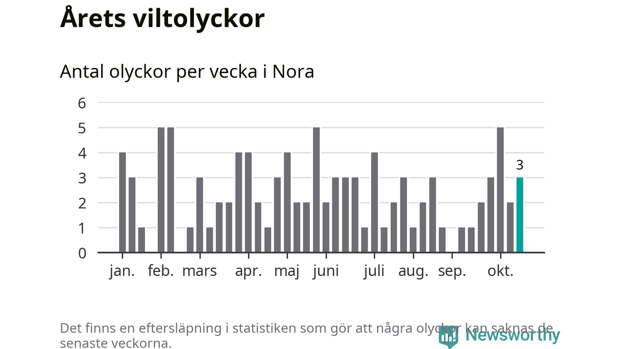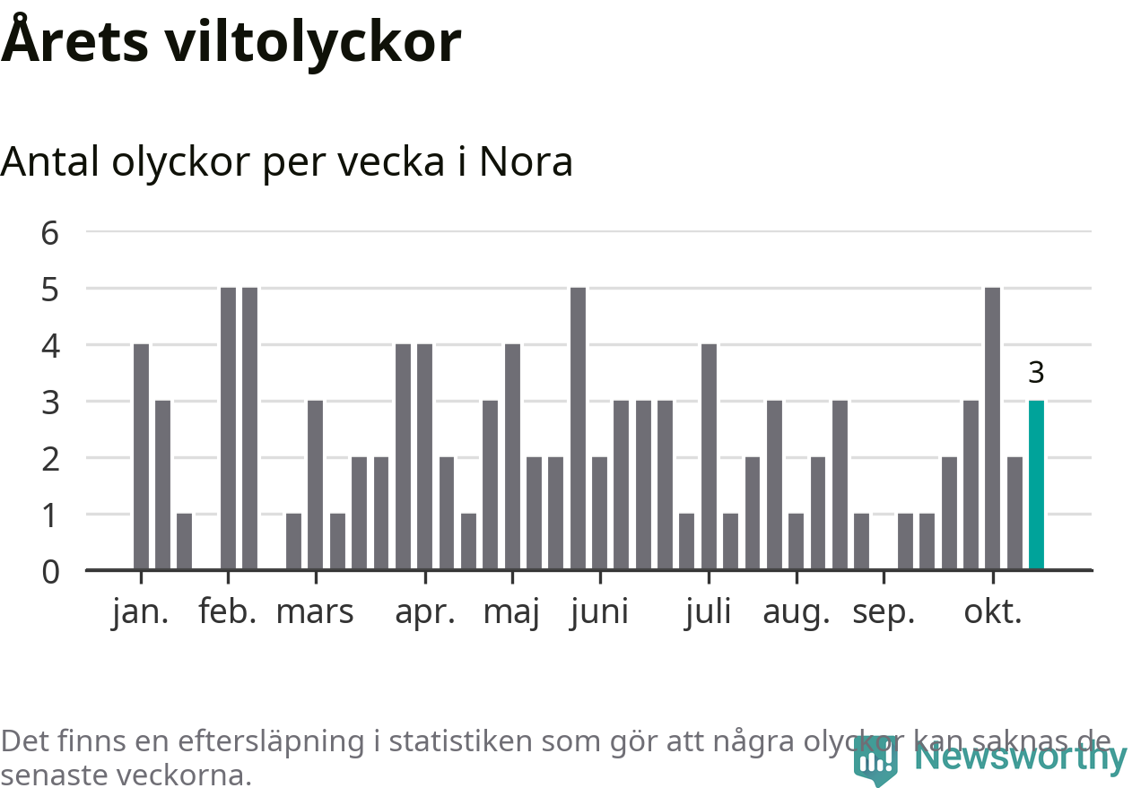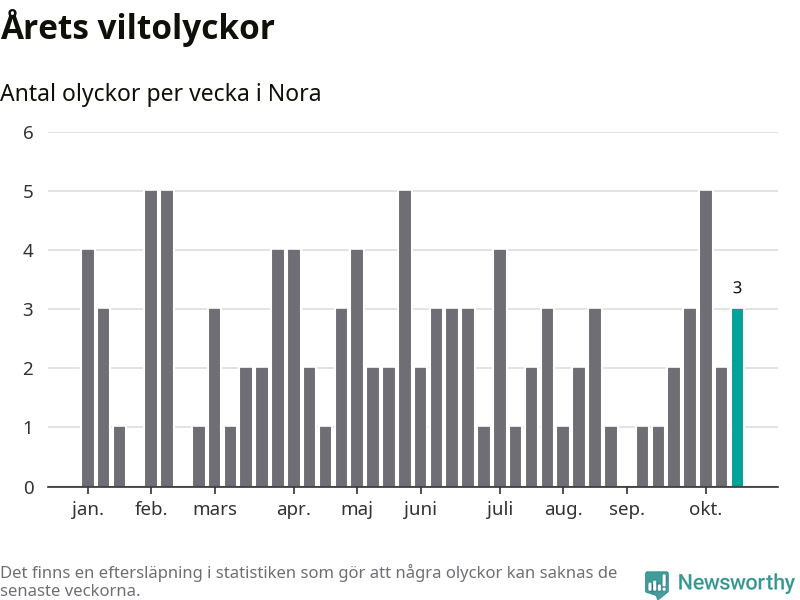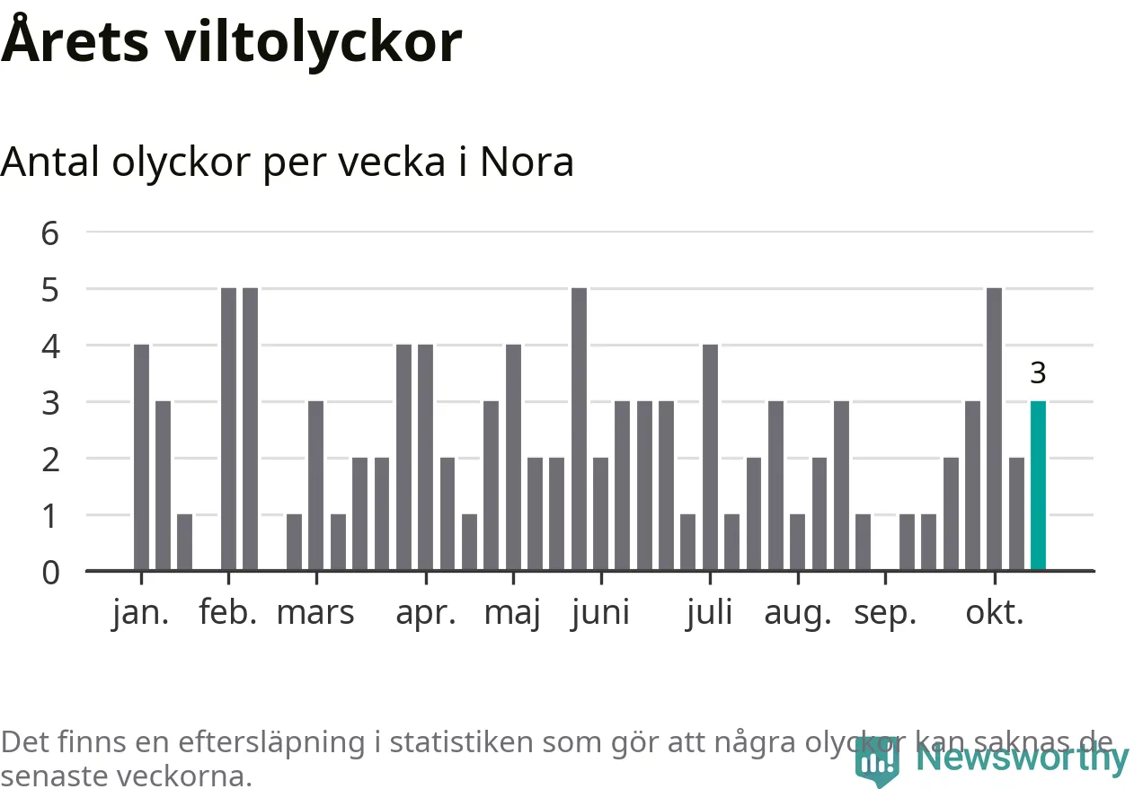Hittills har tre viltolyckor rapporterats in i Nora kommun från vecka 43. Se listan här.