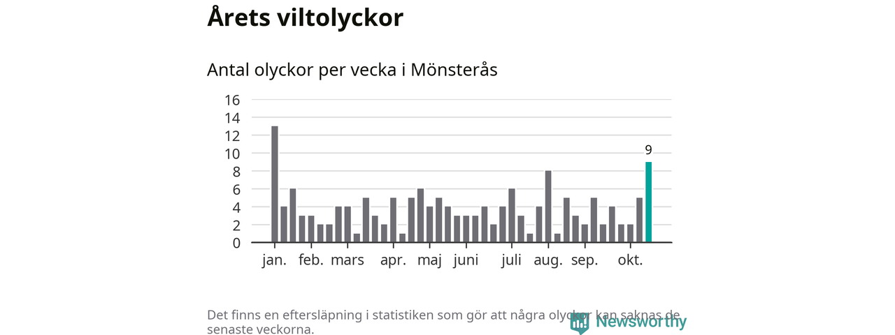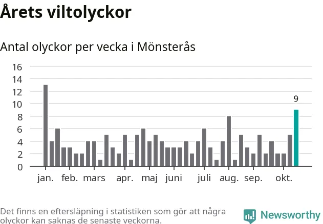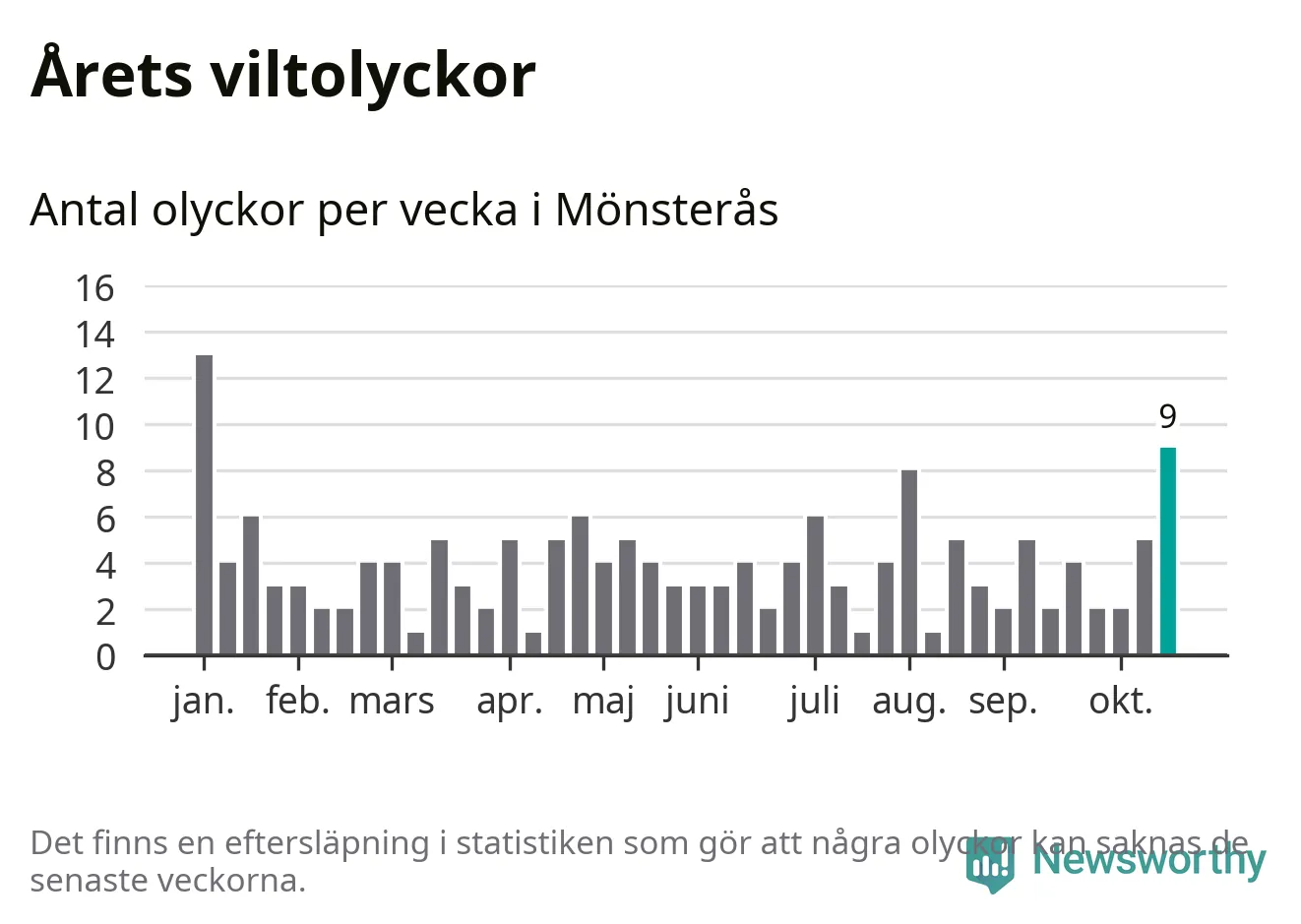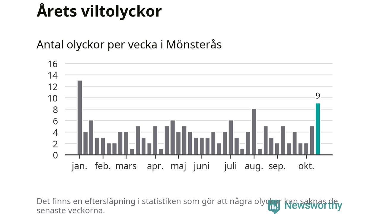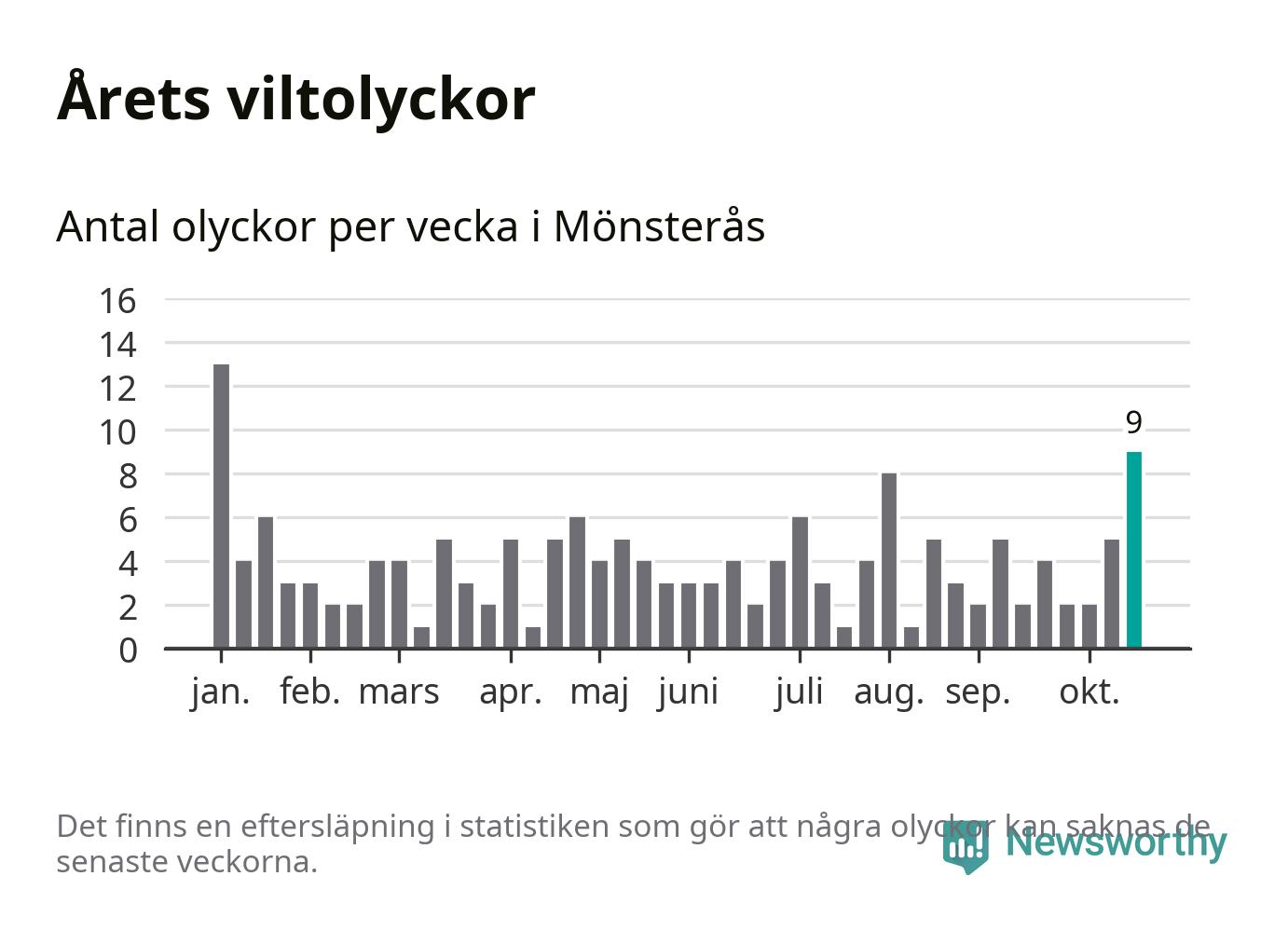 Hittills har nio viltolyckor rapporterats in i Mönsterås kommun från vecka 43. Se listan här.