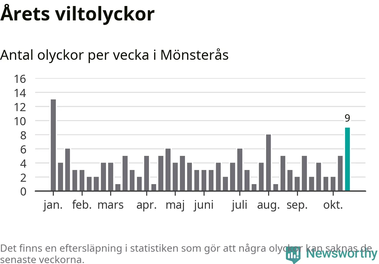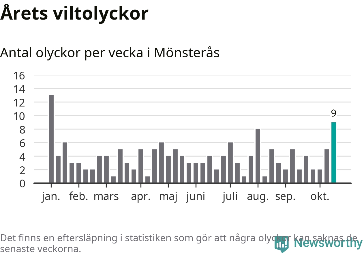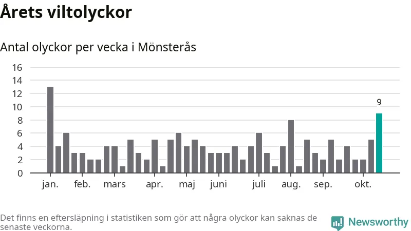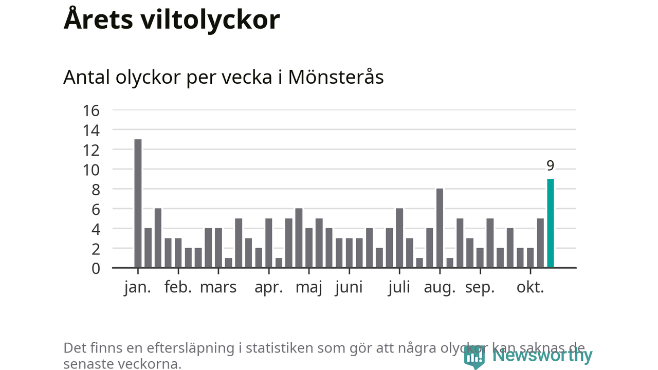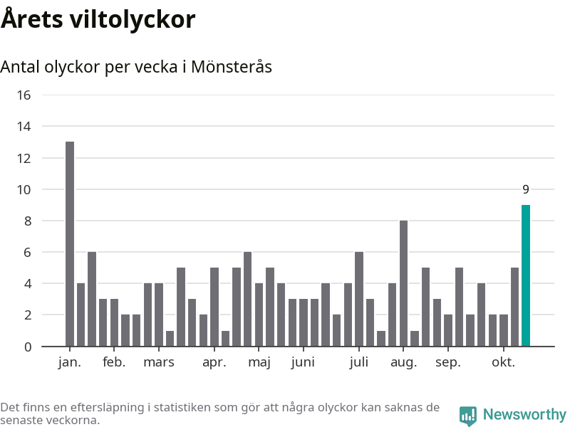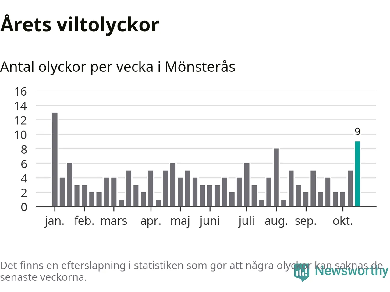 Hittills har nio viltolyckor rapporterats in i Mönsterås kommun från vecka 43. Se listan här.