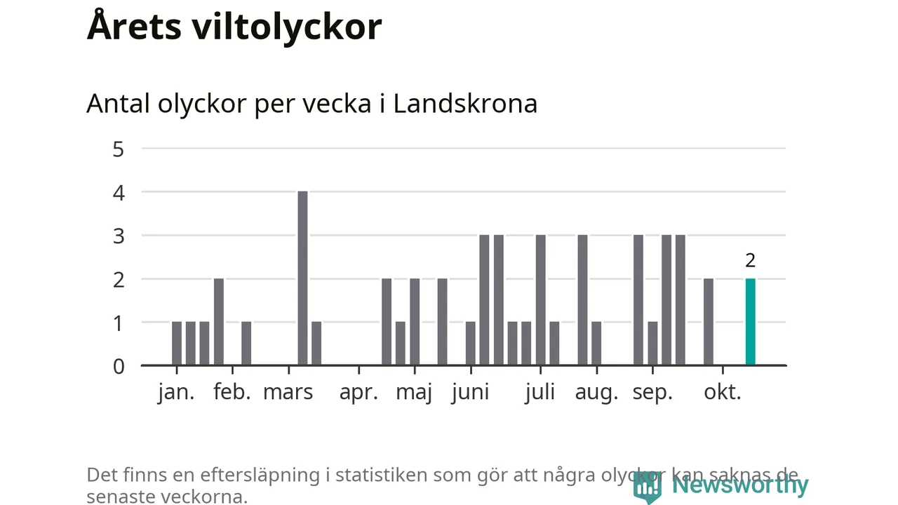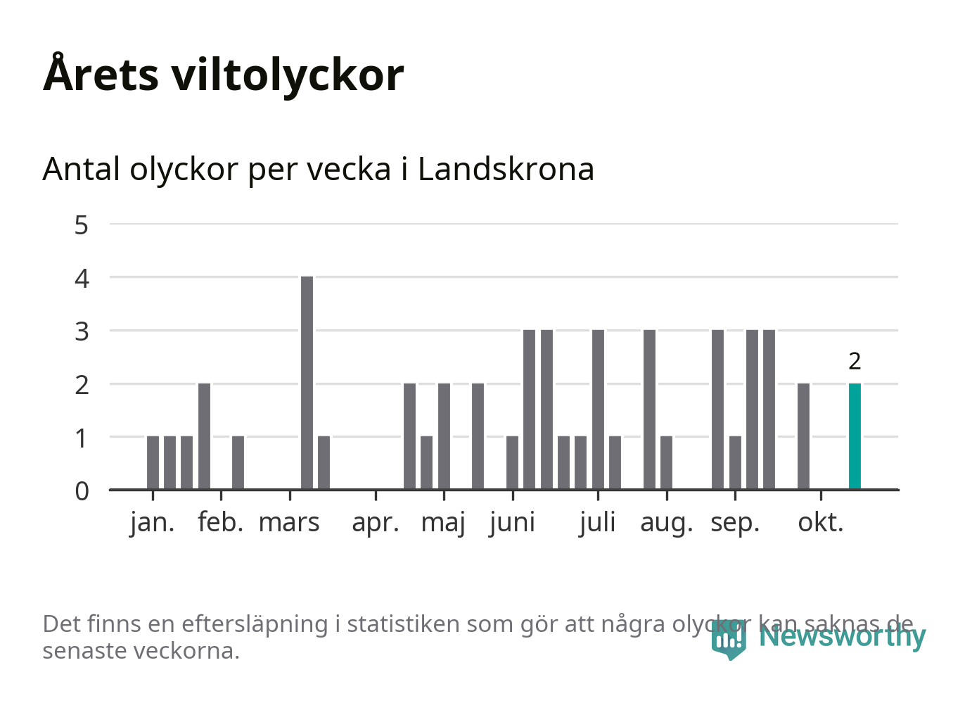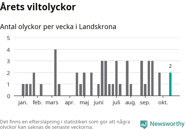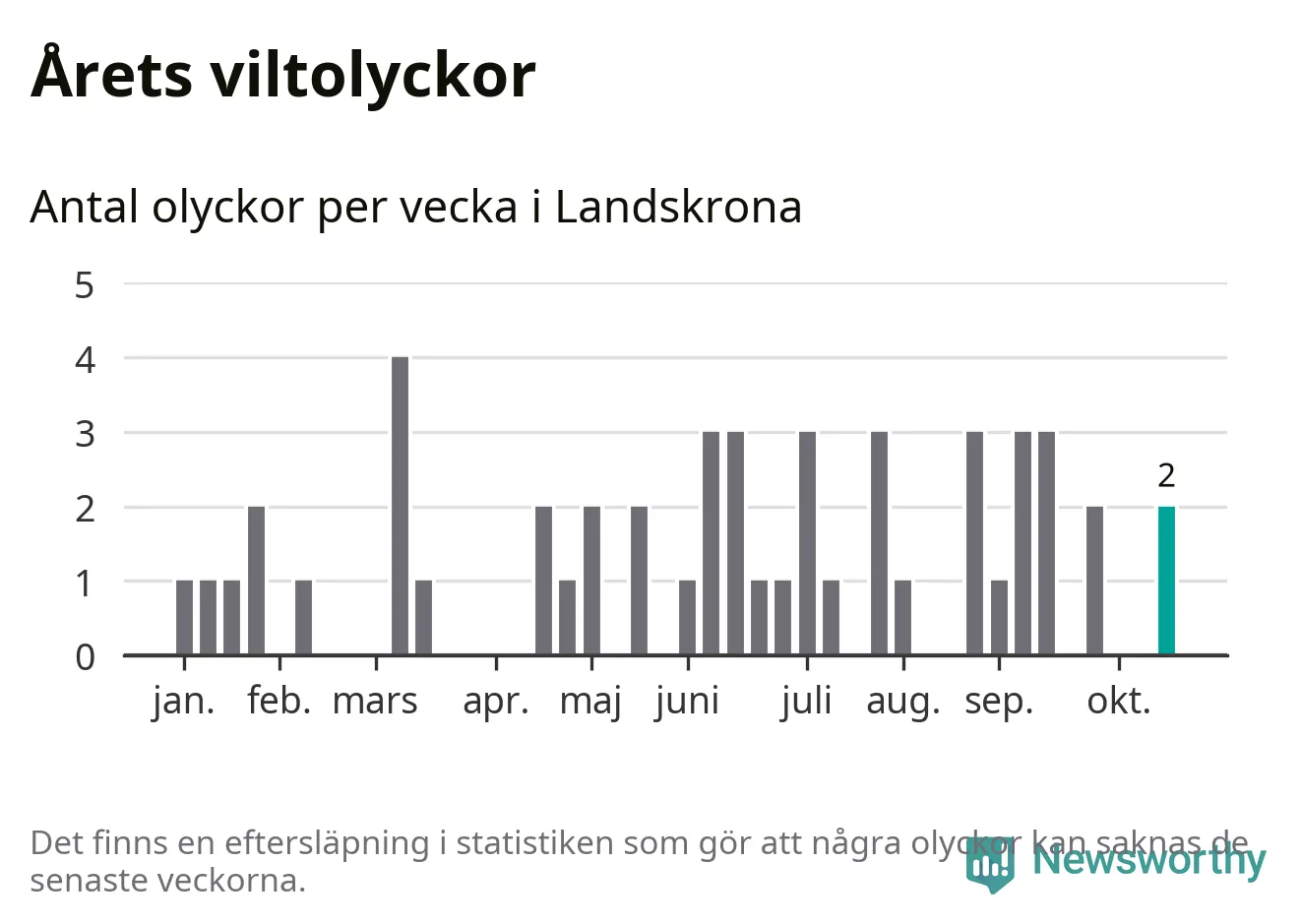 Hittills har två viltolyckor rapporterats in i Landskrona kommun från vecka 43. Se listan här.