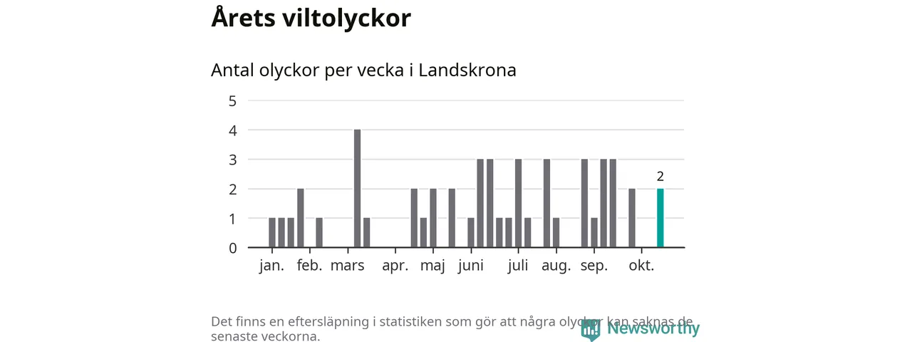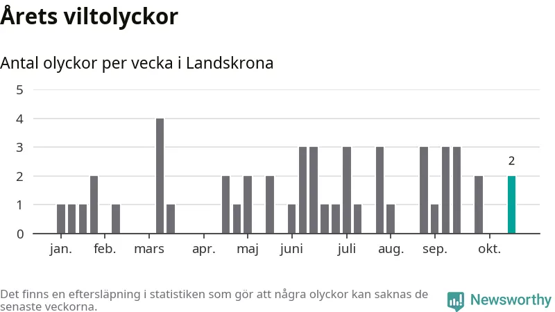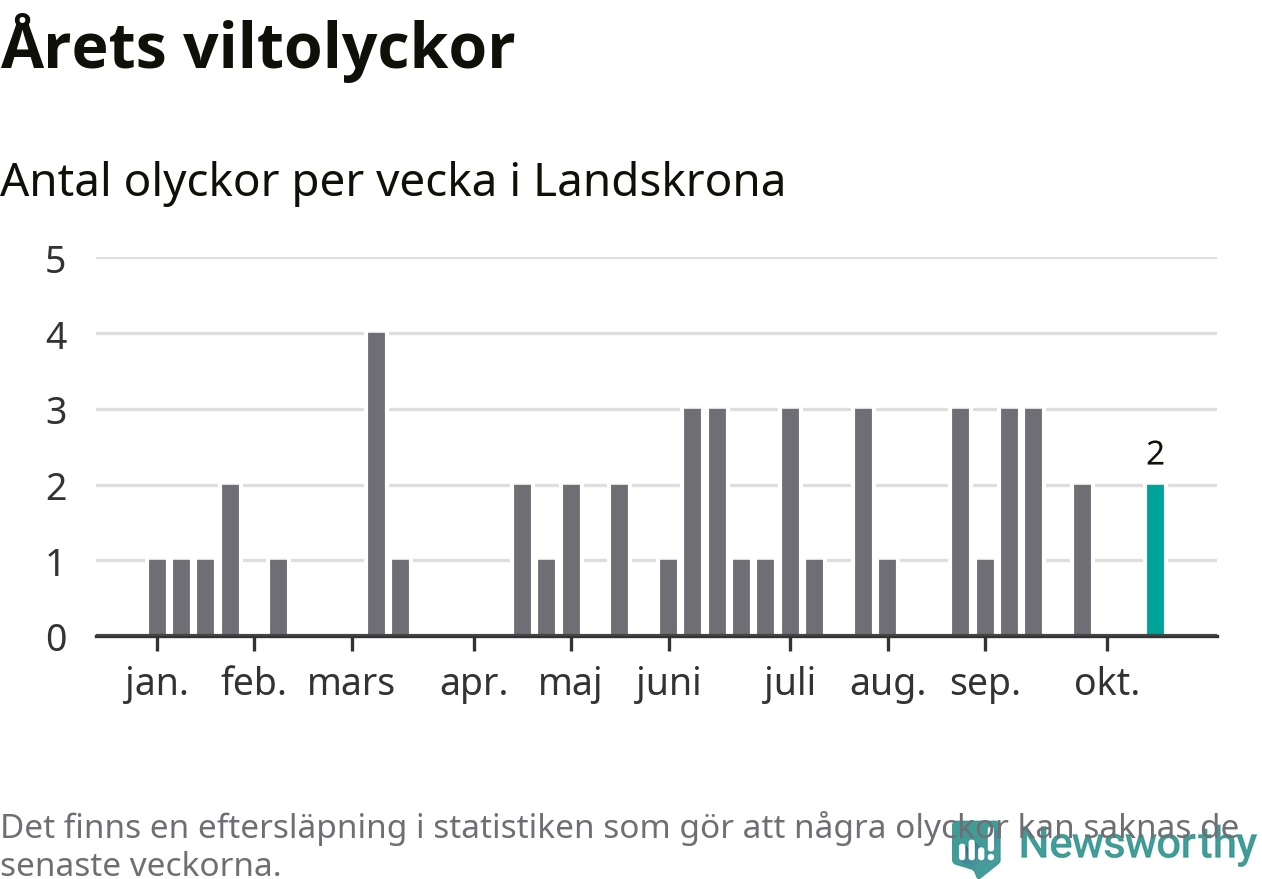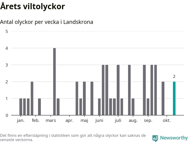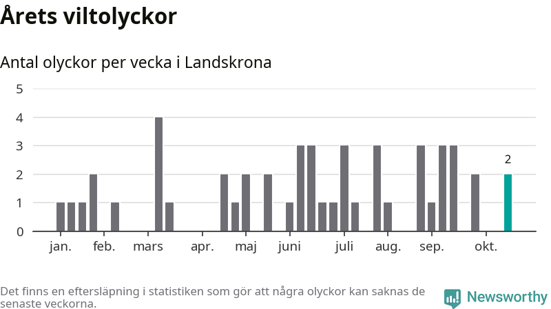 Hittills har två viltolyckor rapporterats in i Landskrona kommun från vecka 43. Se listan här.