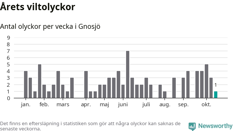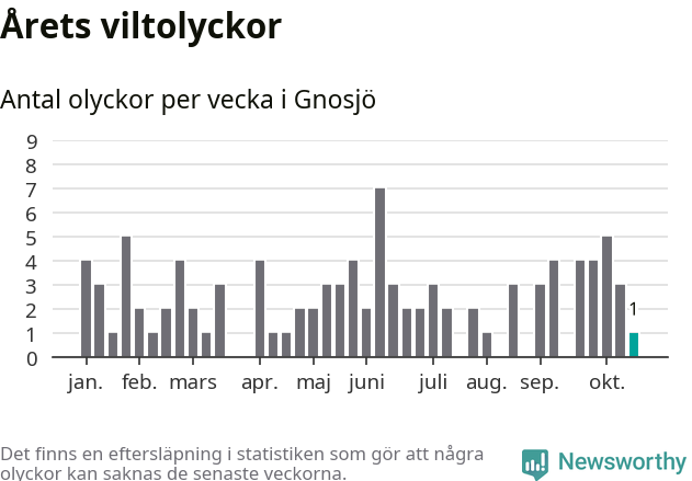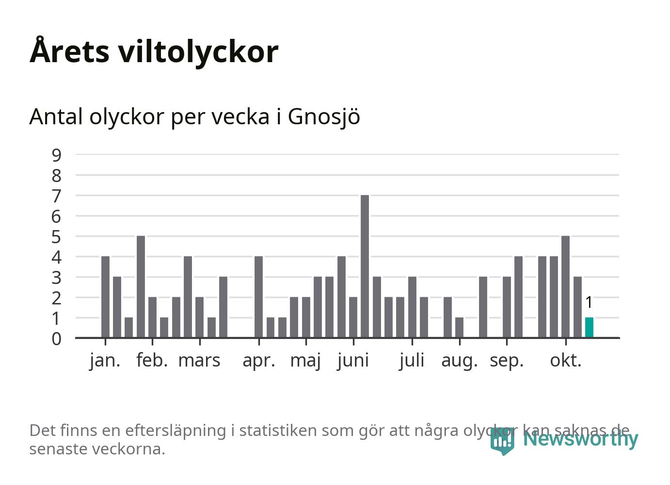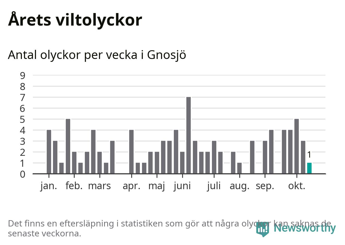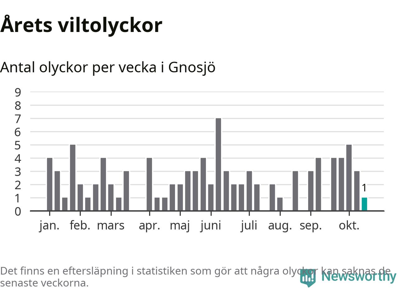 Från förra veckan (vecka 43) har hittills en viltolycka rapporterats in i Gnosjö kommun.
