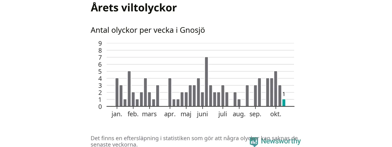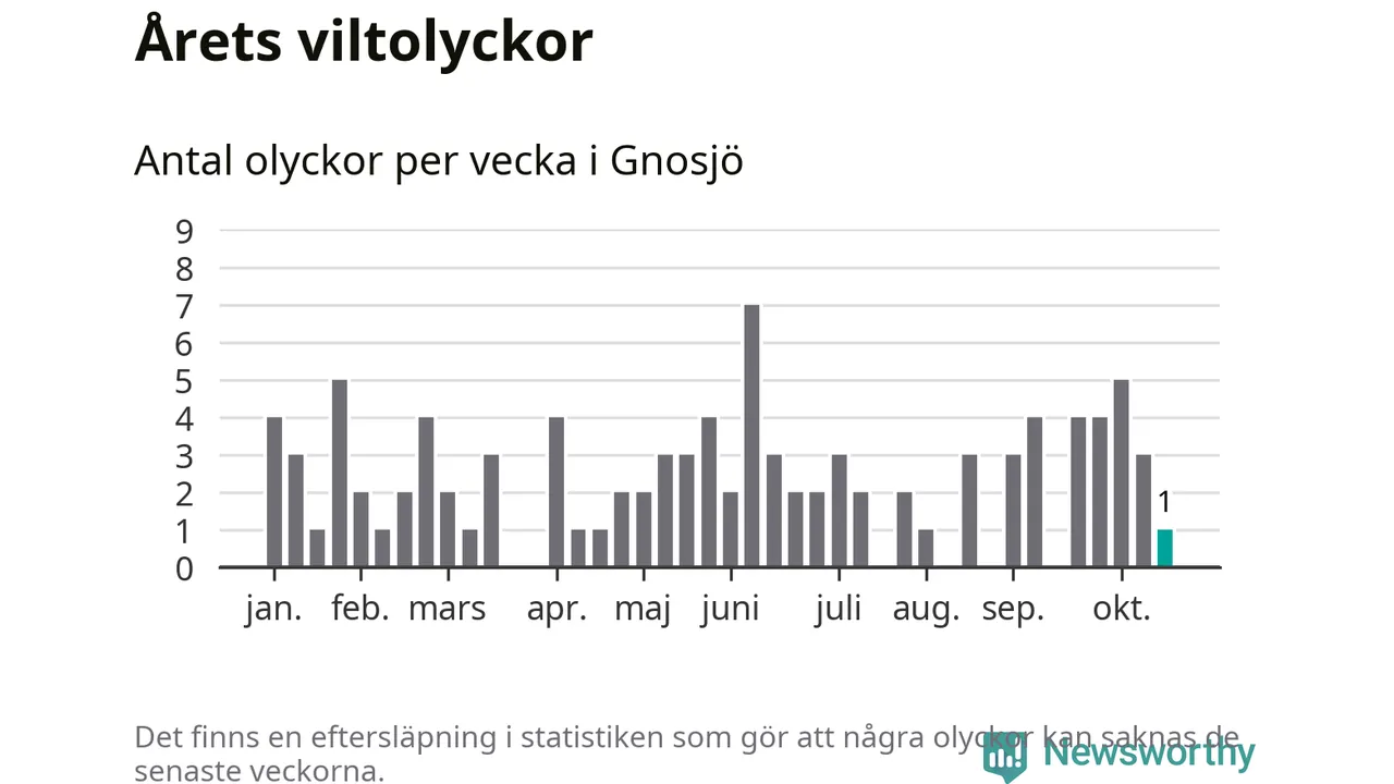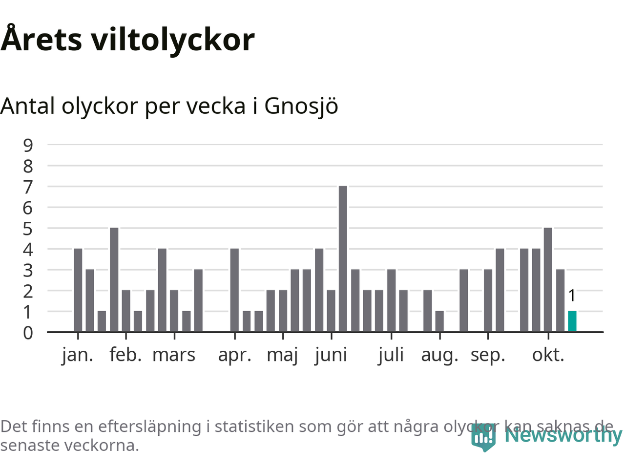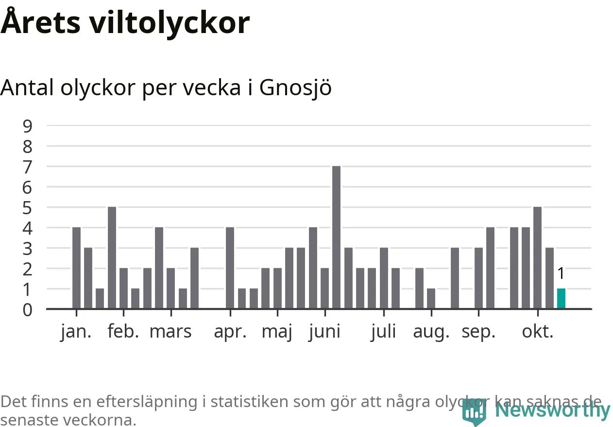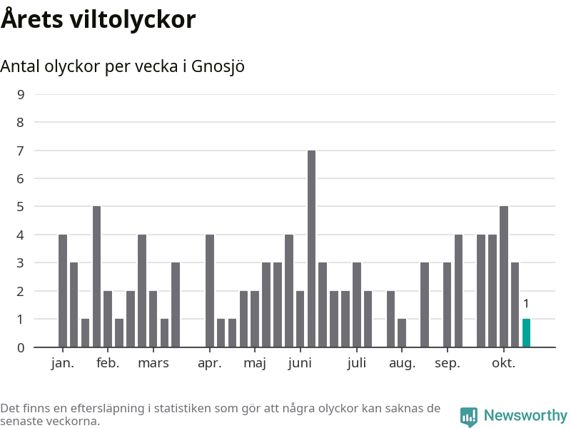Från förra veckan (vecka 43) har hittills en viltolycka rapporterats in i Gnosjö kommun.