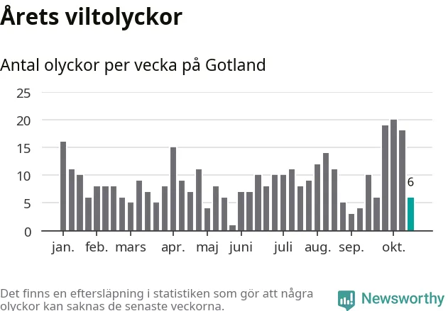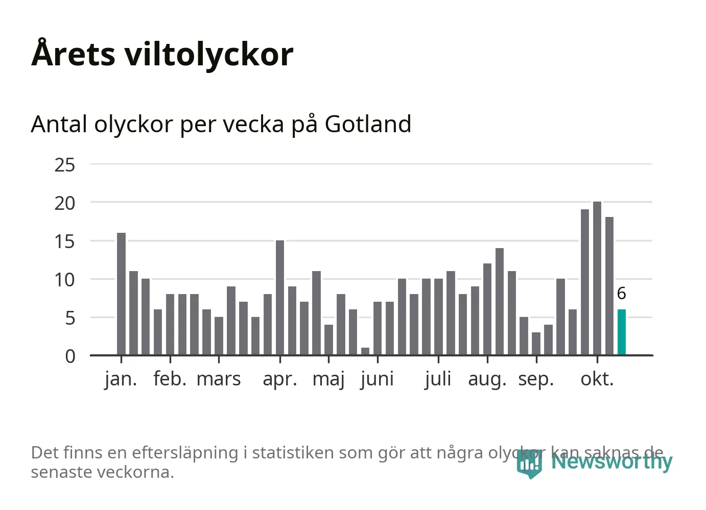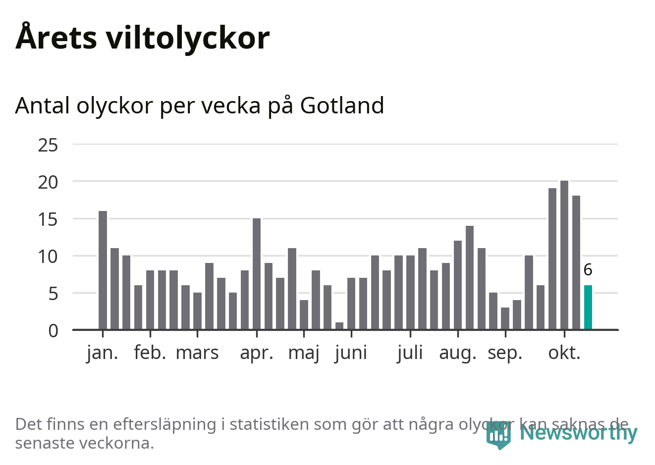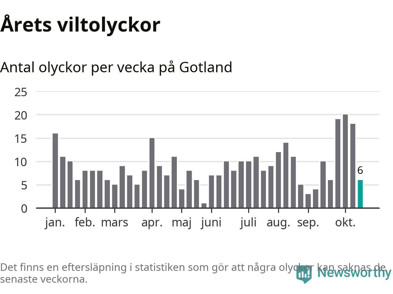 Hittills har sex viltolyckor rapporterats in i Gotlands kommun från vecka 43. Se listan här.