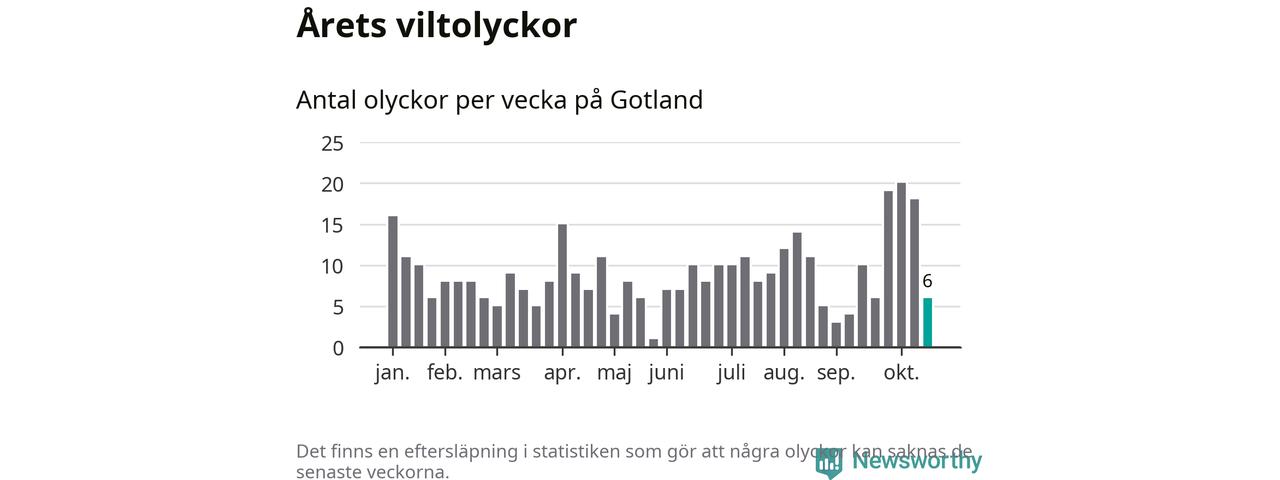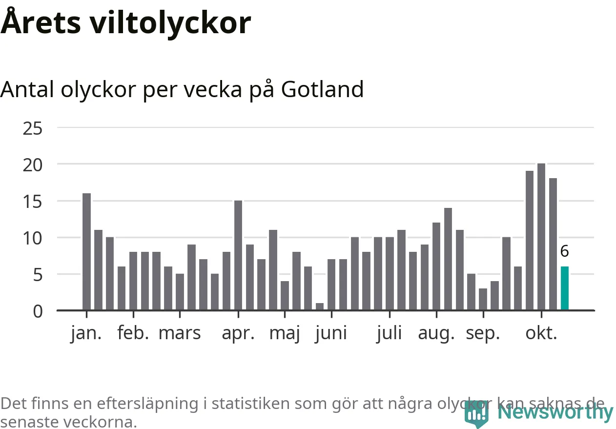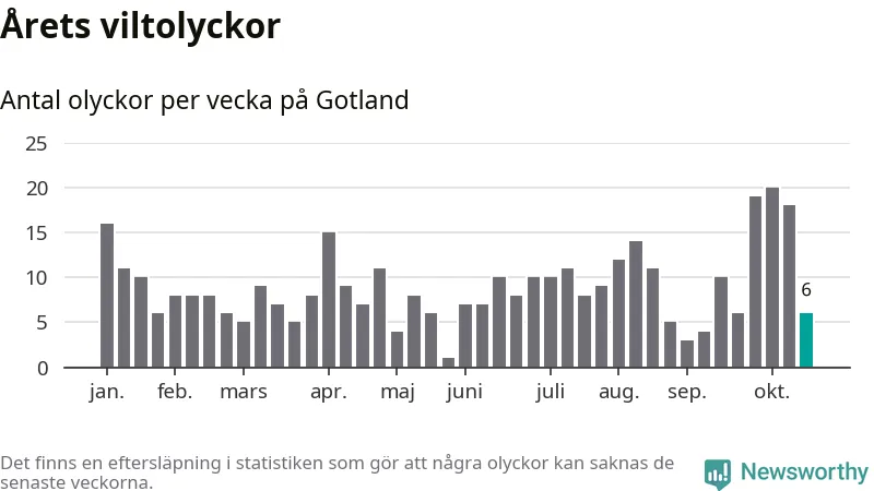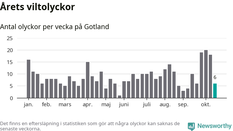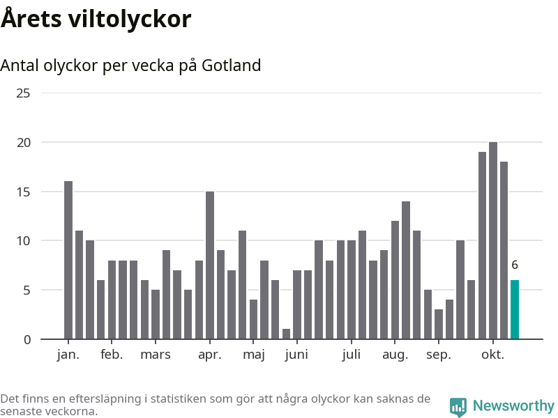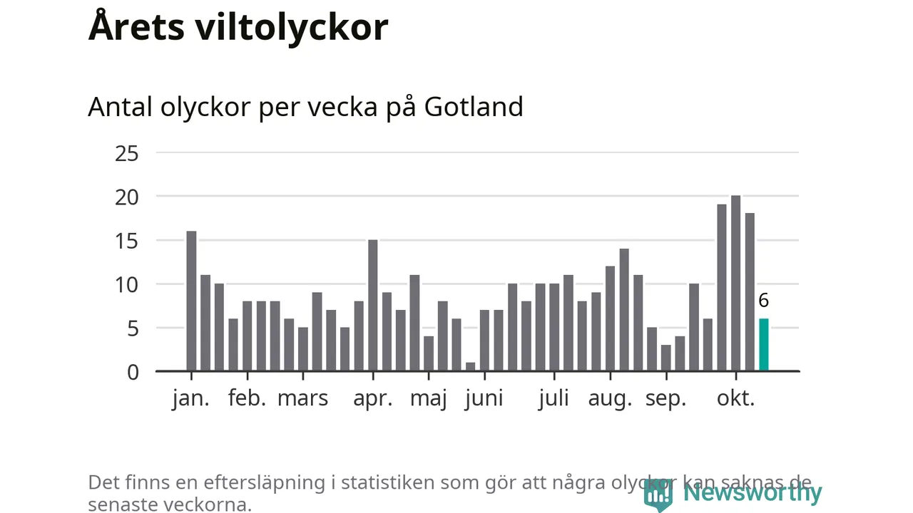 Hittills har sex viltolyckor rapporterats in i Gotlands kommun från vecka 43. Se listan här.