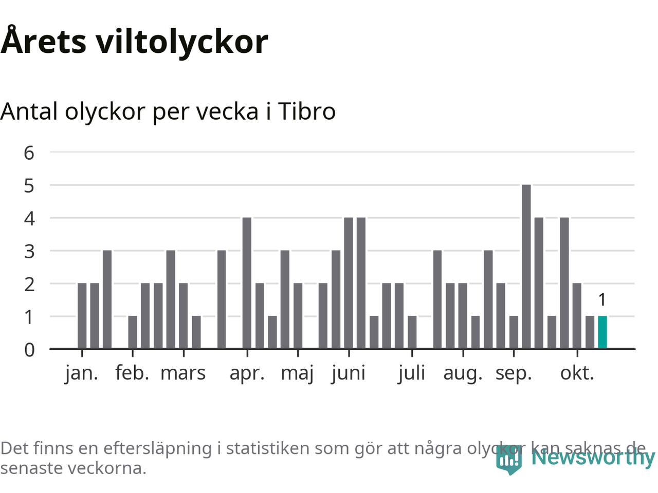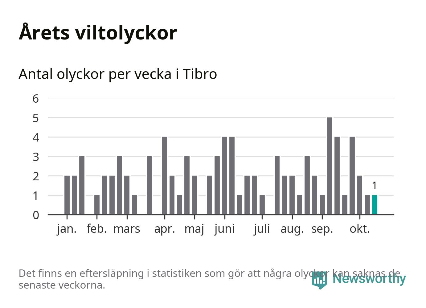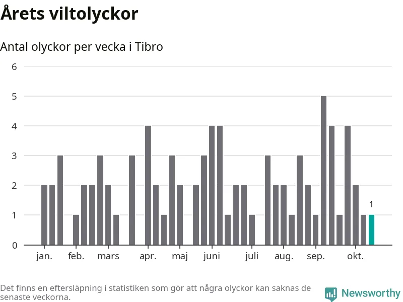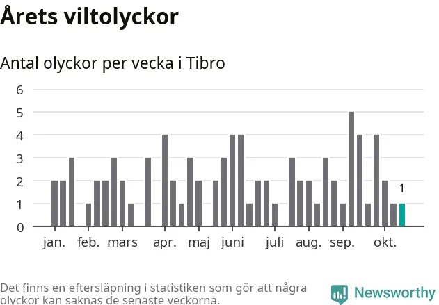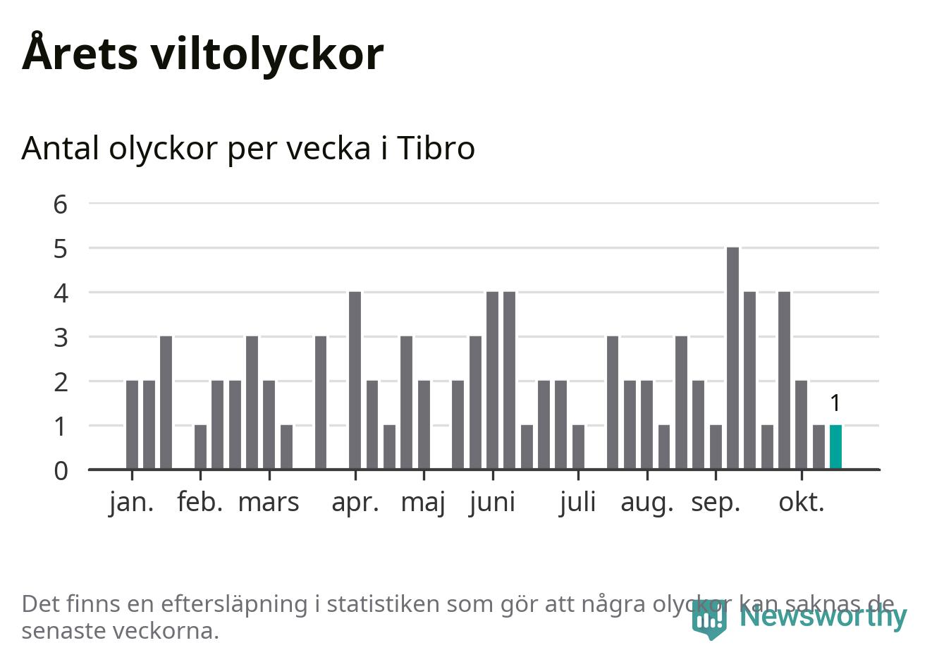 Från förra veckan (vecka 43) har hittills en viltolycka rapporterats in i Tibro kommun.