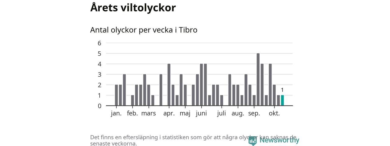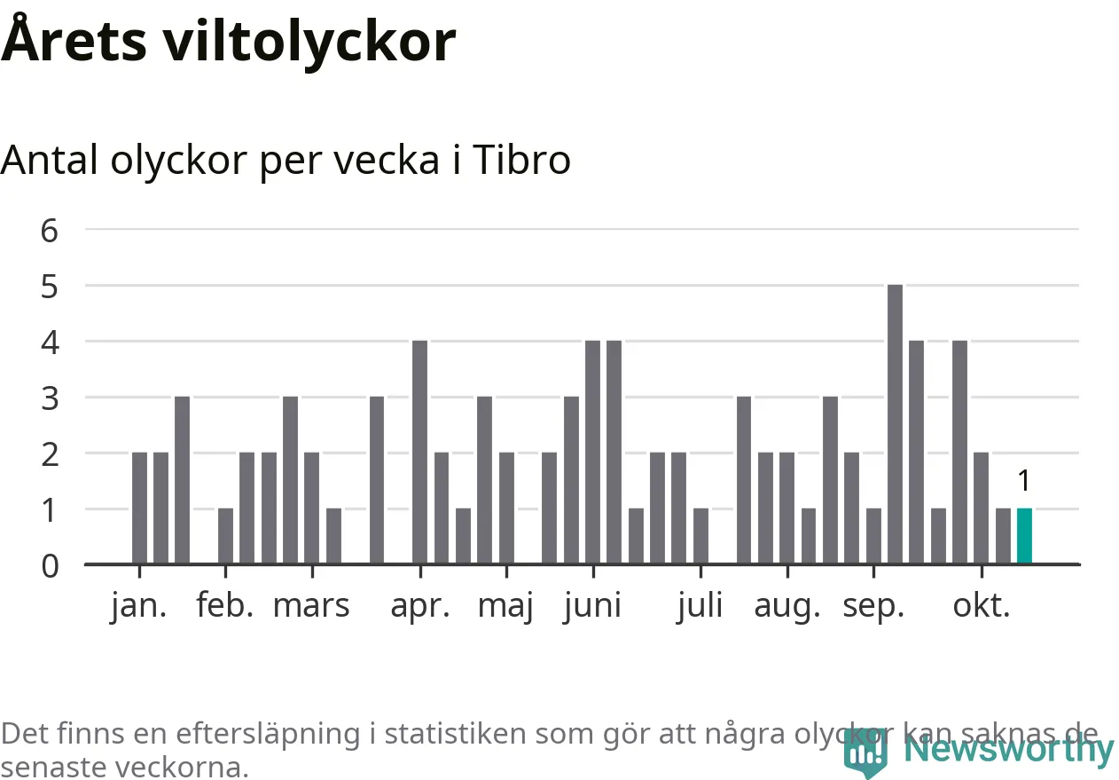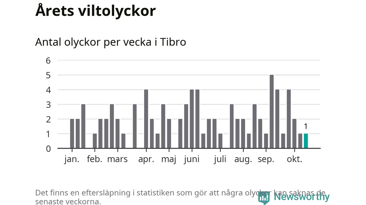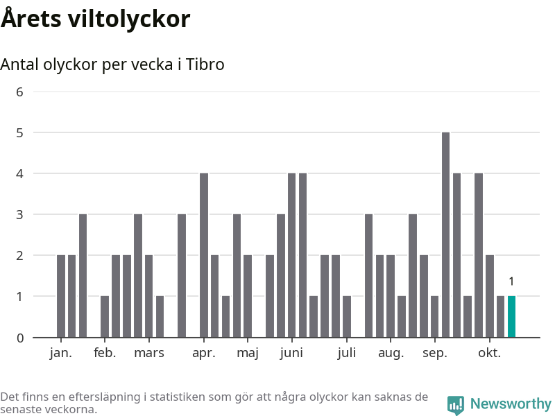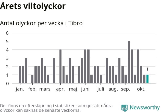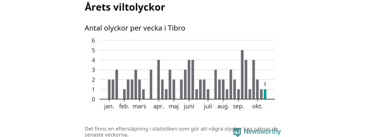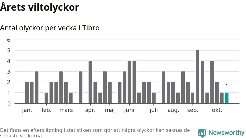 Från förra veckan (vecka 43) har hittills en viltolycka rapporterats in i Tibro kommun.