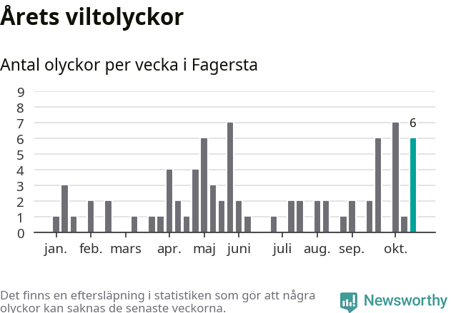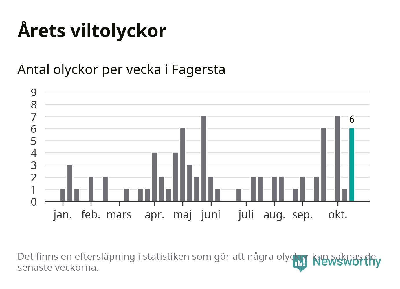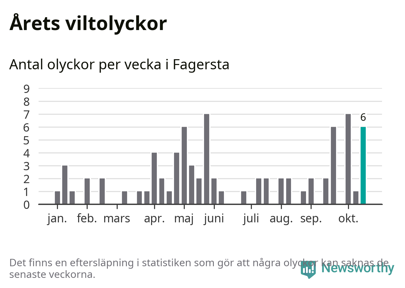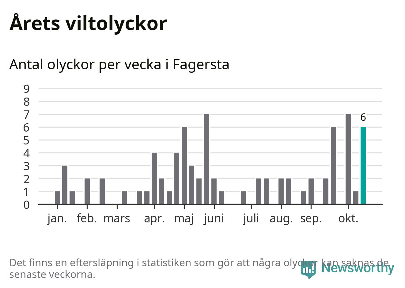 Hittills har sex viltolyckor rapporterats in i Fagersta kommun från vecka 43. Se listan här.
