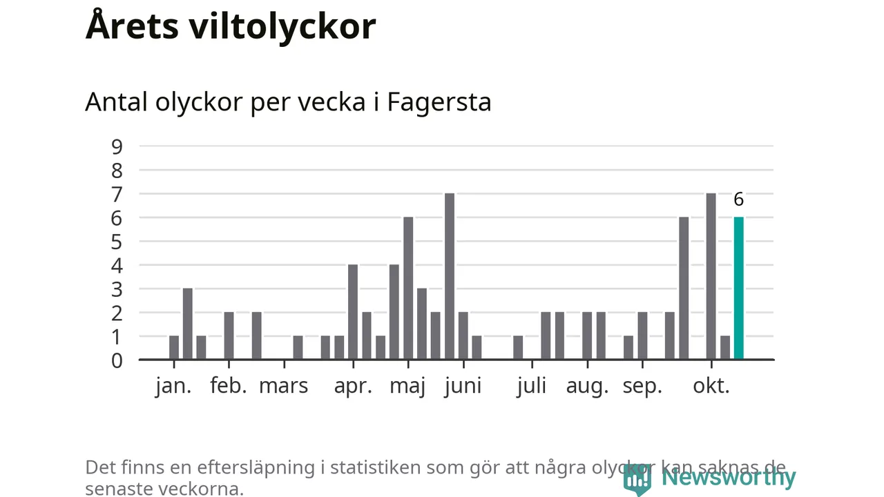 Totalt det här året har det inträffat 80 viltolyckor i kommunen. Det är mer än genomsnittet för motsvarande period (omkring 56) de senaste tio åren.