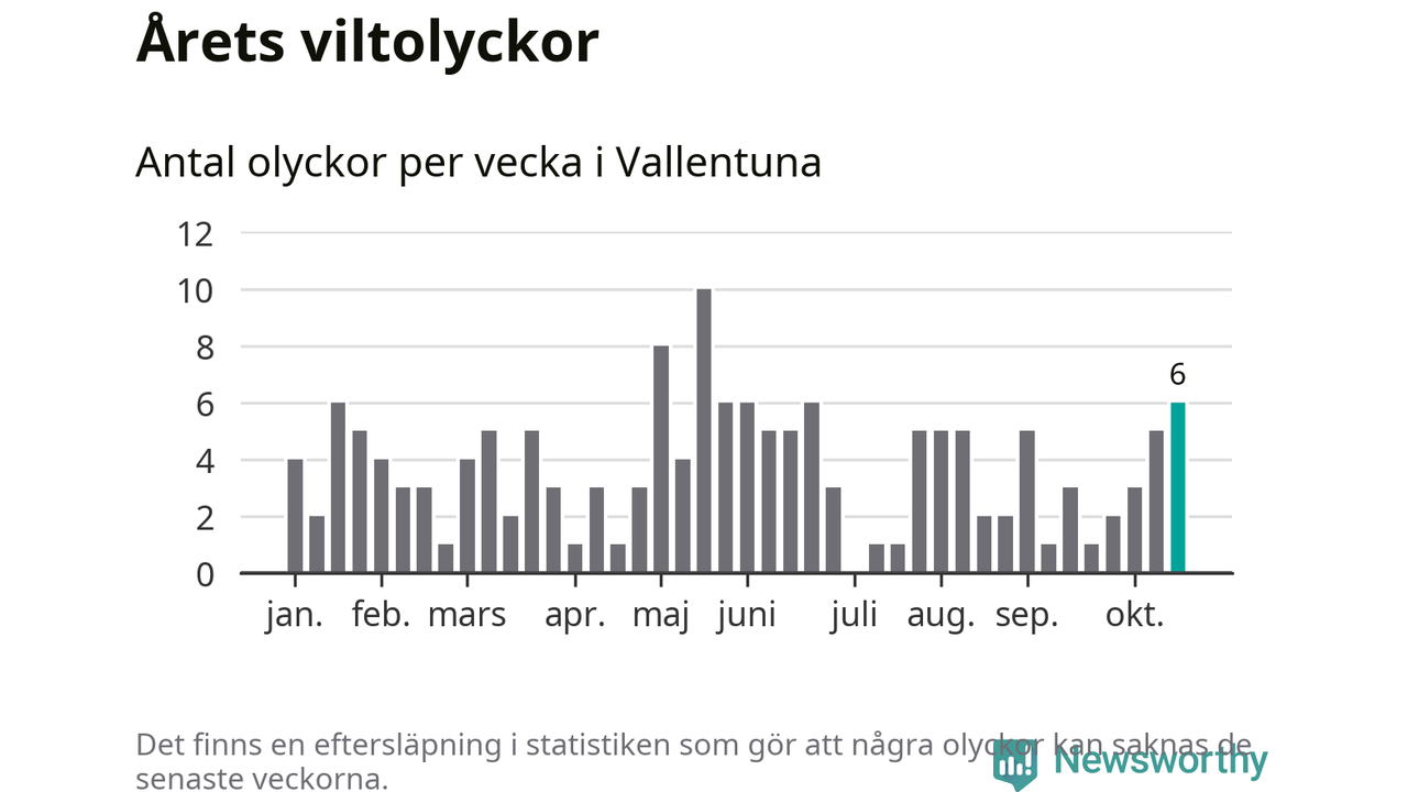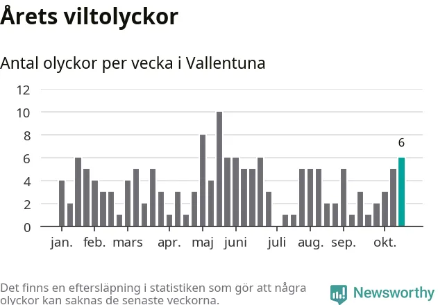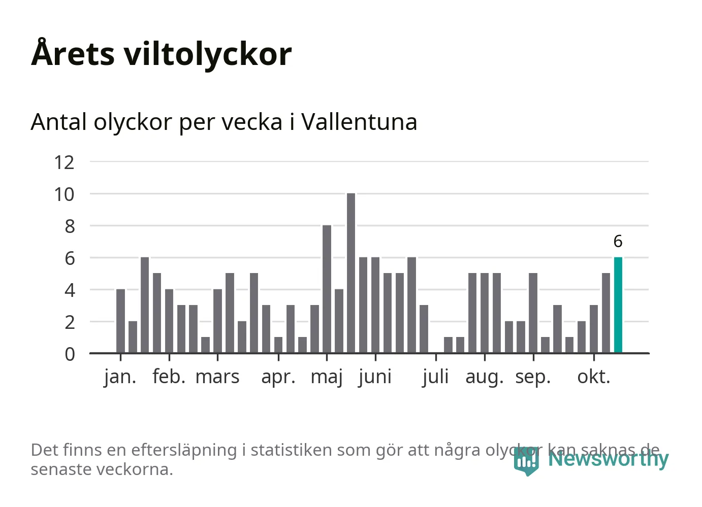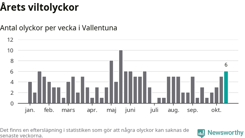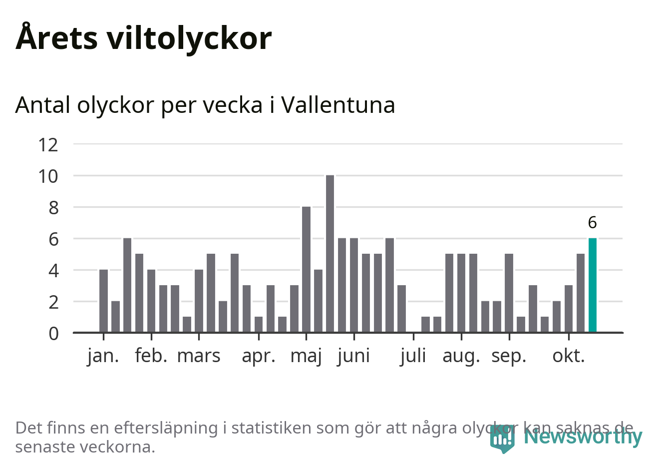 Hittills har sex viltolyckor rapporterats in i Vallentuna kommun från vecka 43. Se listan här.