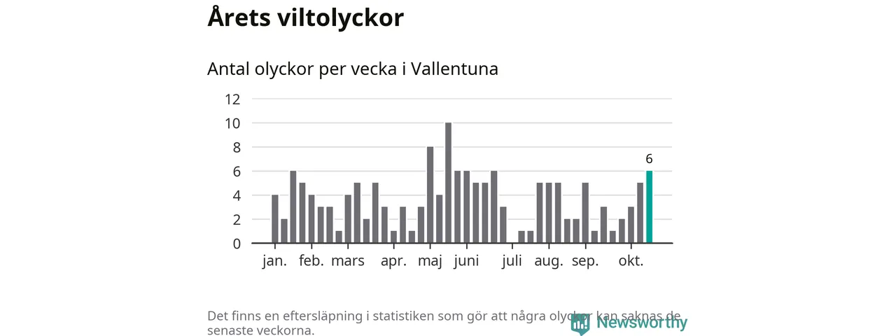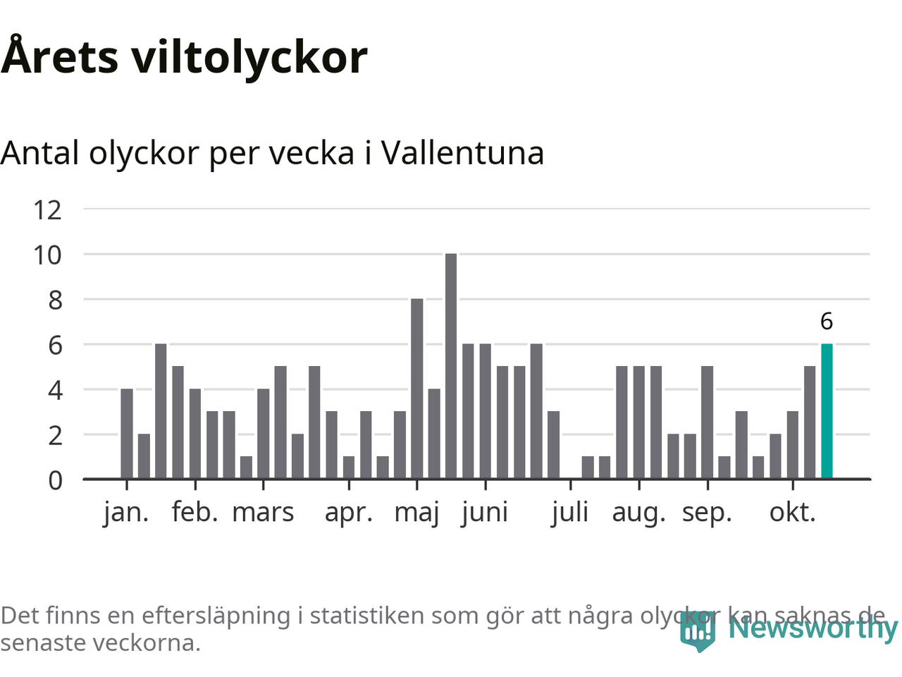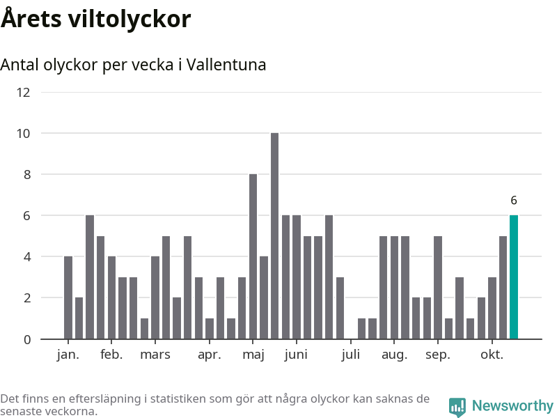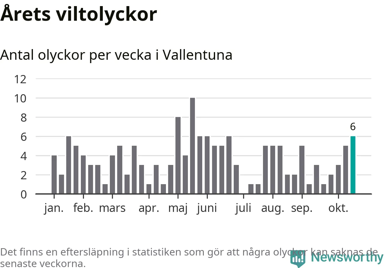 Hittills har sex viltolyckor rapporterats in i Vallentuna kommun från vecka 43. Se listan här.