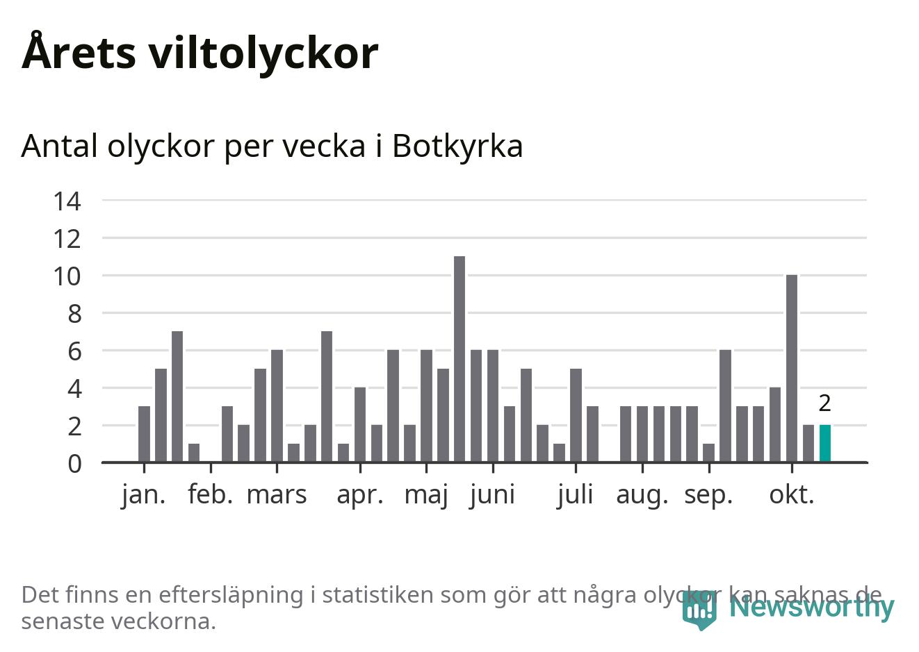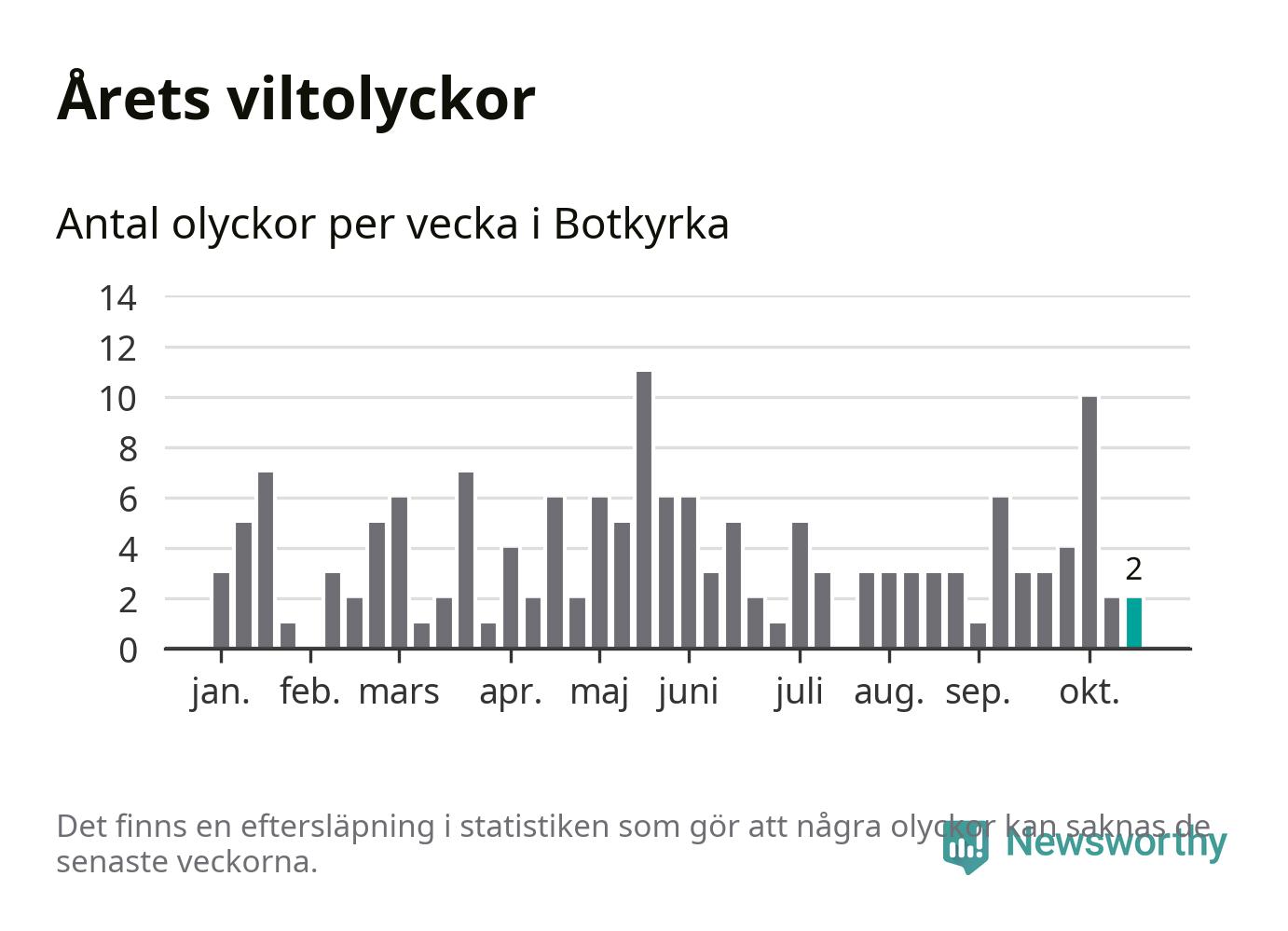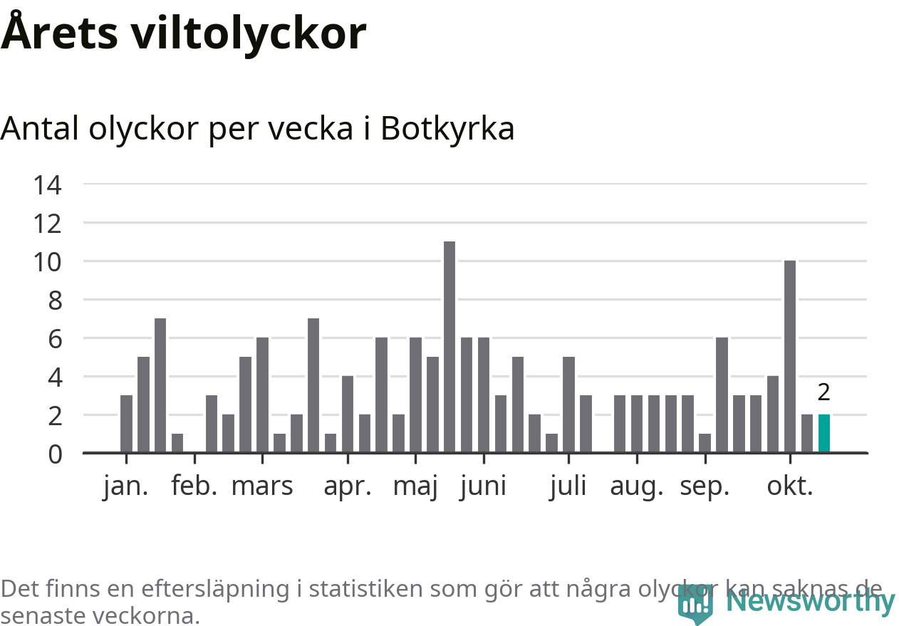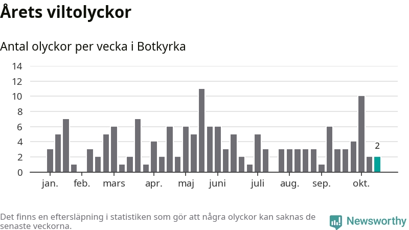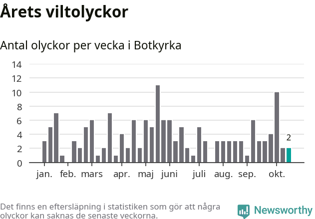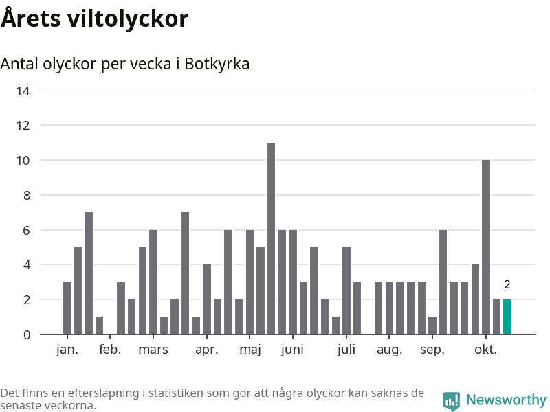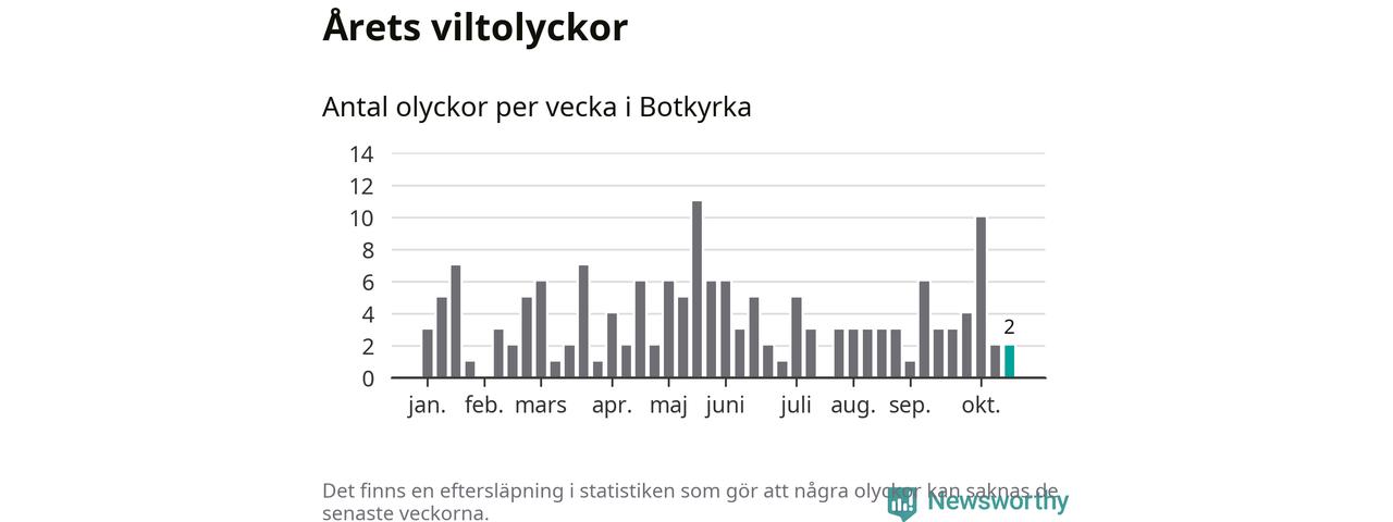 Hittills har två viltolyckor rapporterats in i Botkyrka kommun från vecka 43. Se listan här.