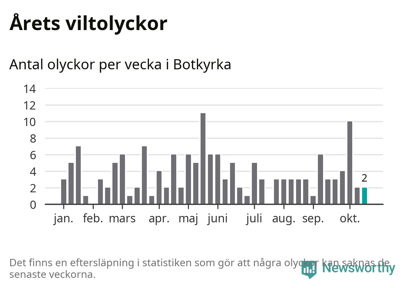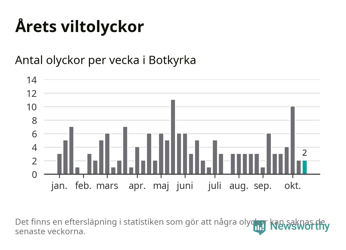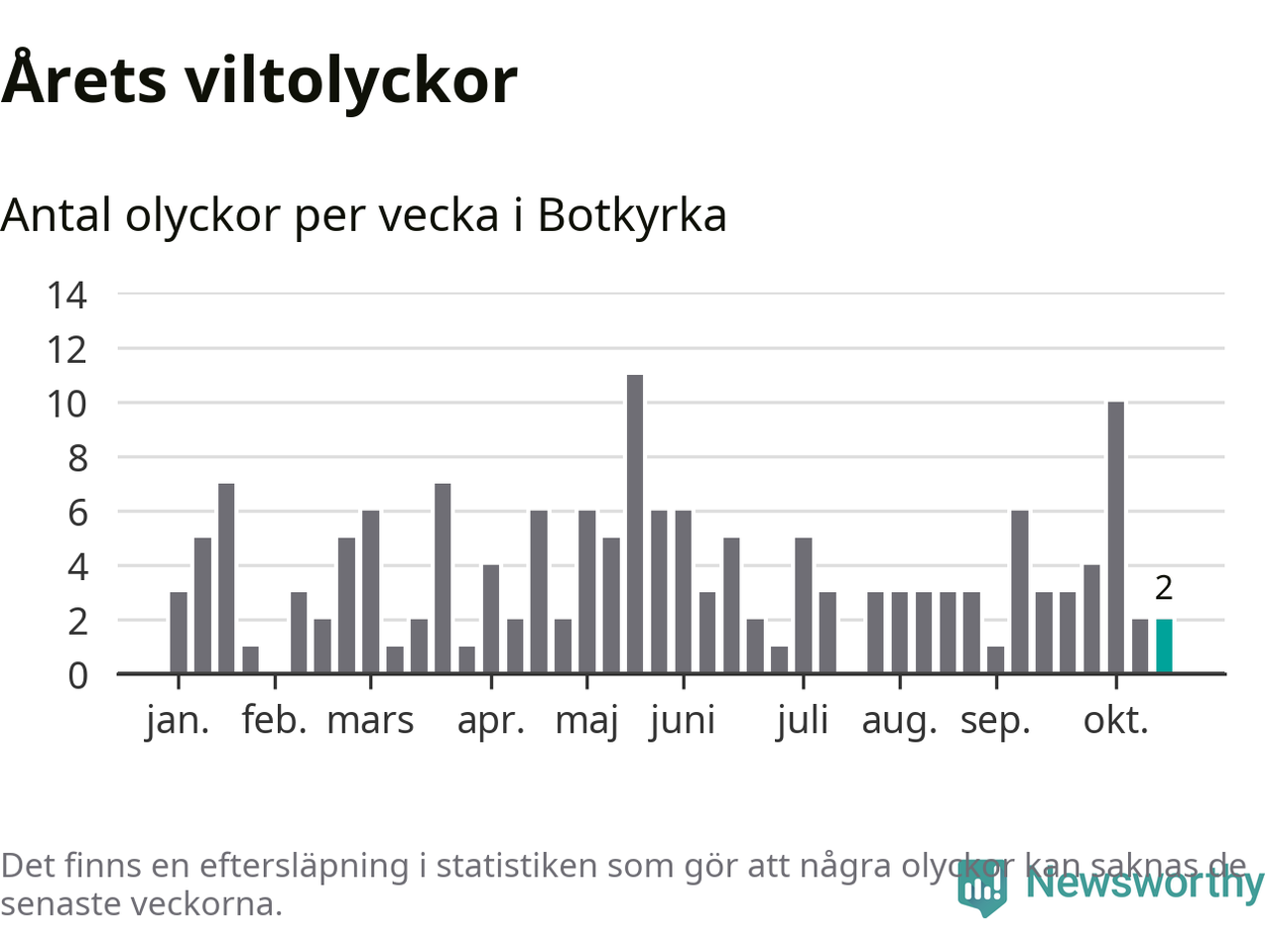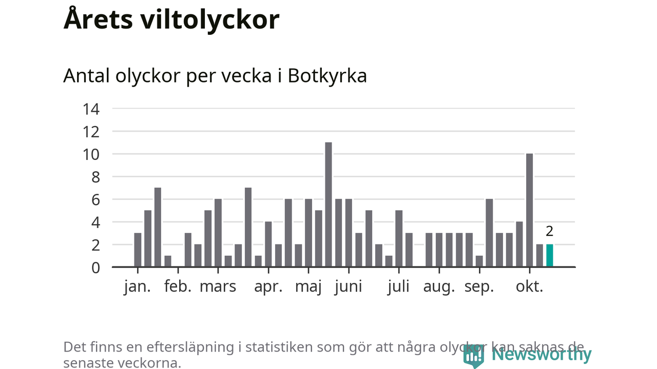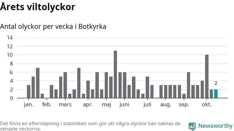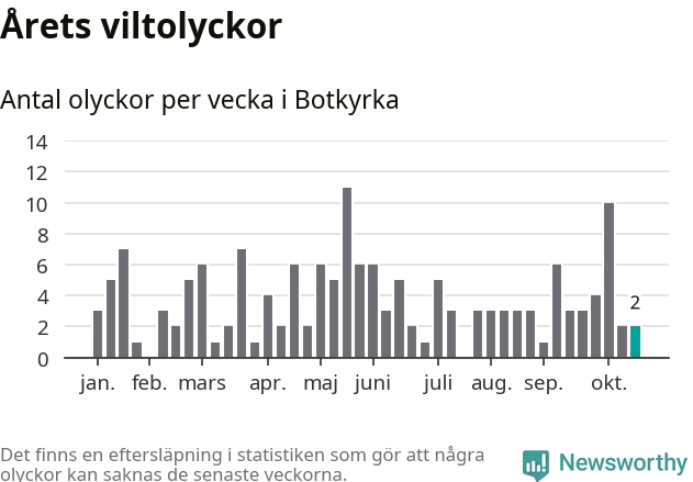 Totalt det här året har det inträffat 156 viltolyckor i kommunen. Det är mer än genomsnittet för motsvarande period (omkring 112) de senaste tio åren.