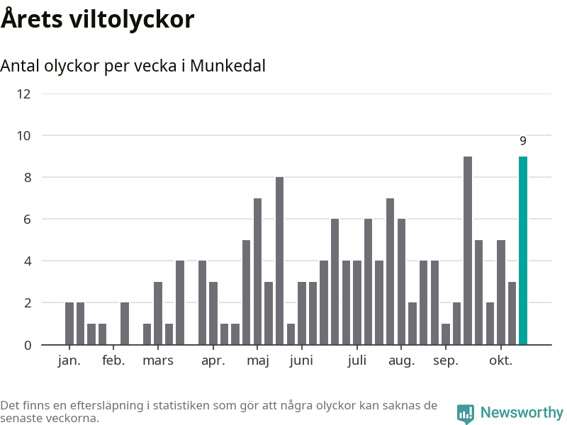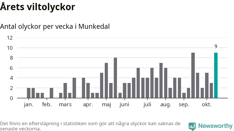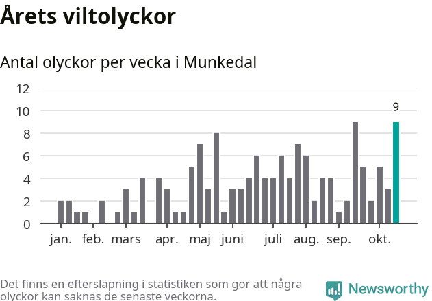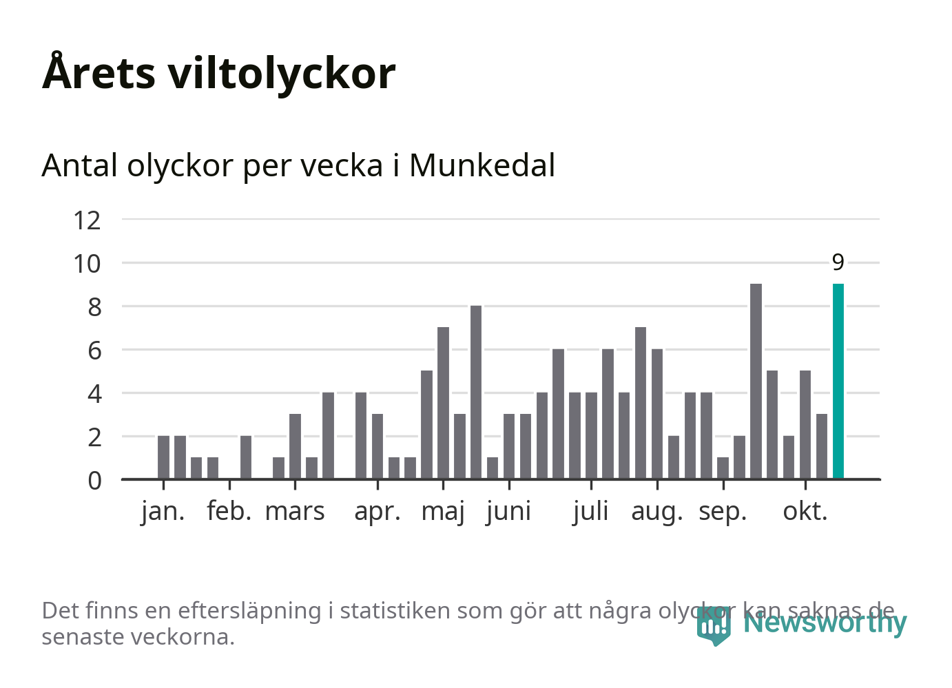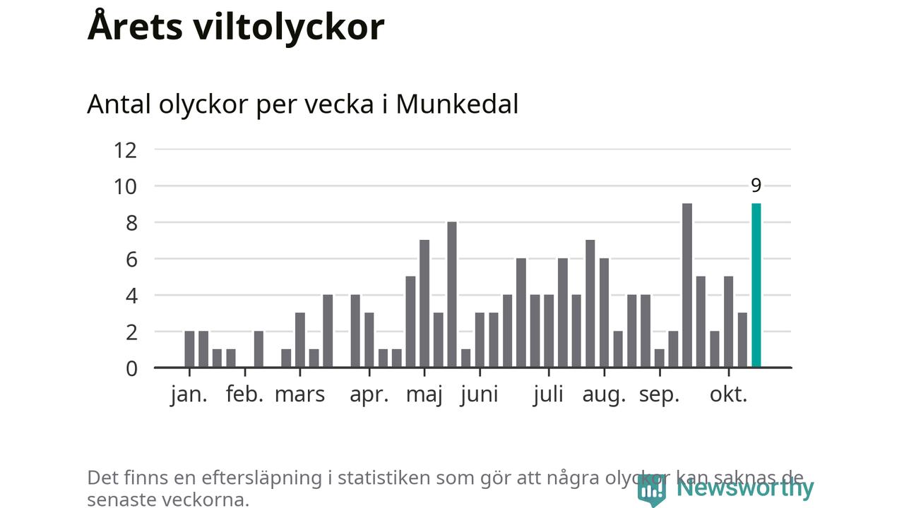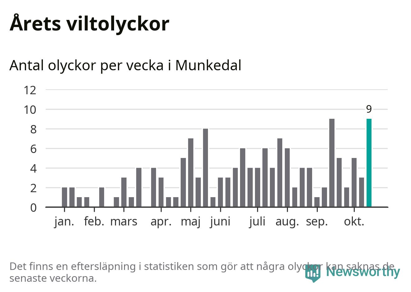 143 viltolyckor i kommunen. Det är mer än genomsnittet för motsvarande period (omkring 101) de senaste tio åren.