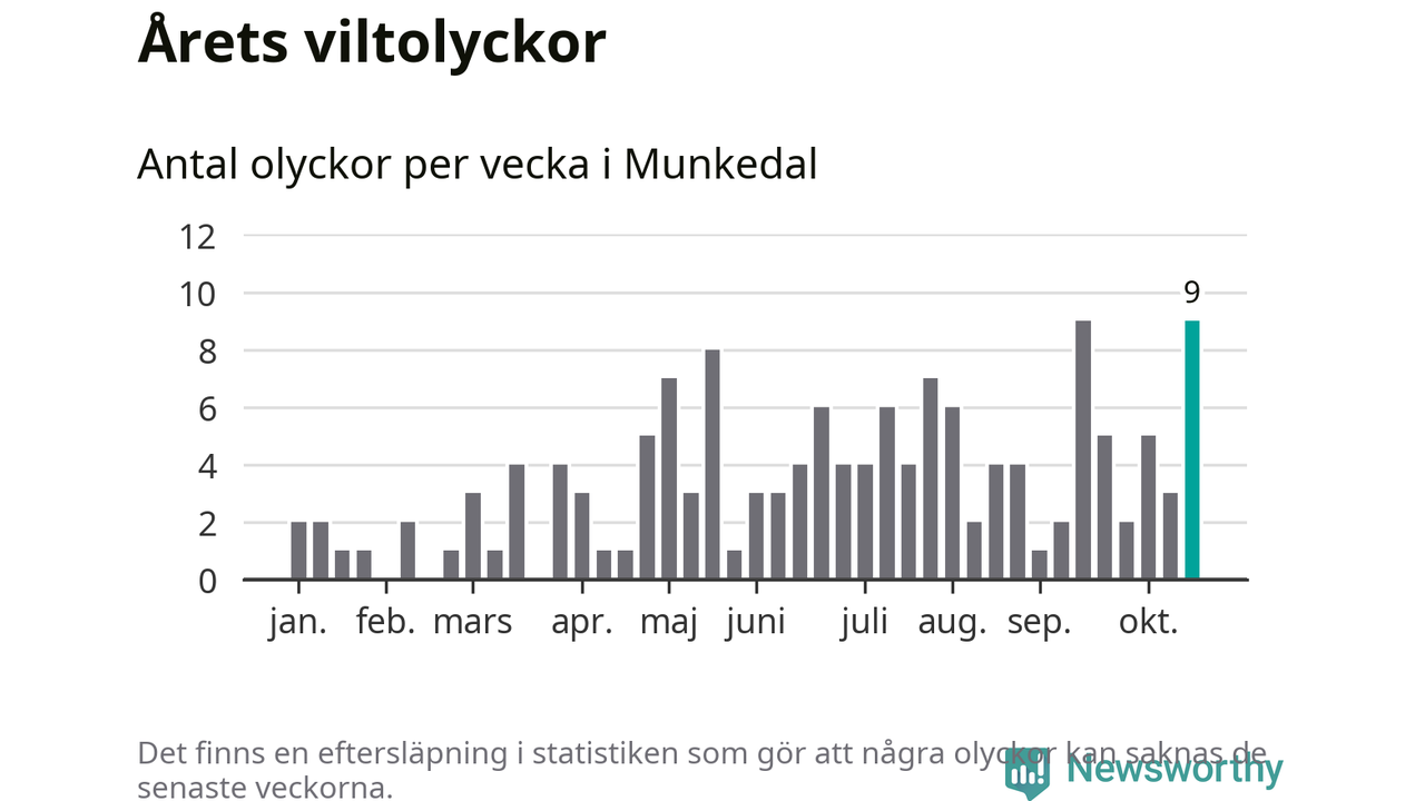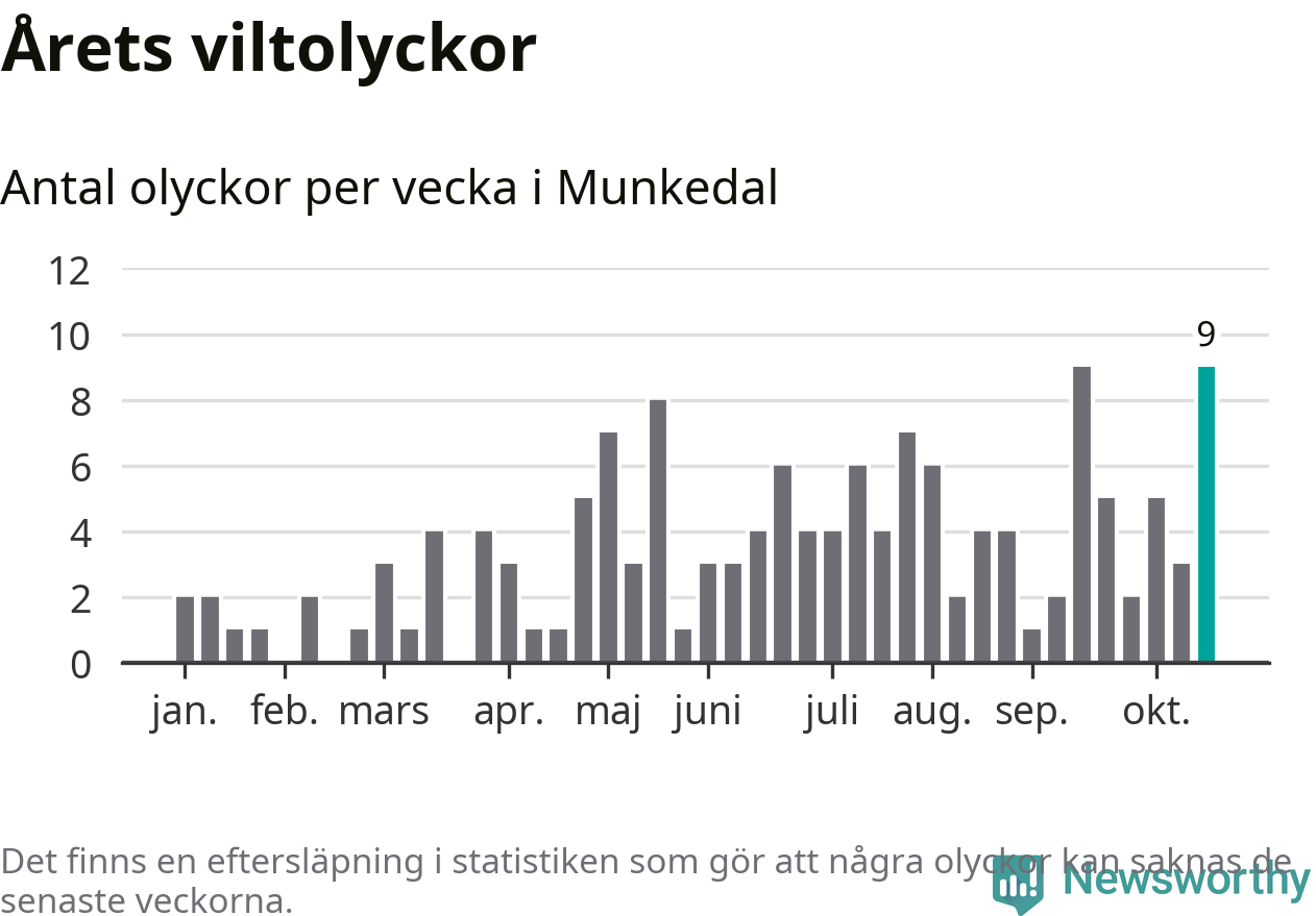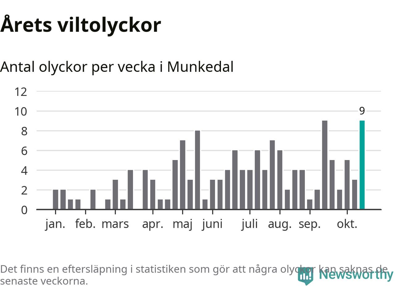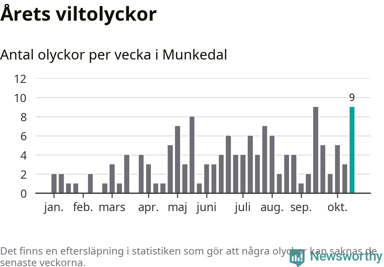 143 viltolyckor i kommunen. Det är mer än genomsnittet för motsvarande period (omkring 101) de senaste tio åren.