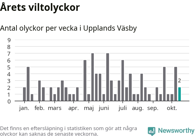 Hittills har två viltolyckor rapporterats in i Upplands Väsby kommun från vecka 43. Se listan här.