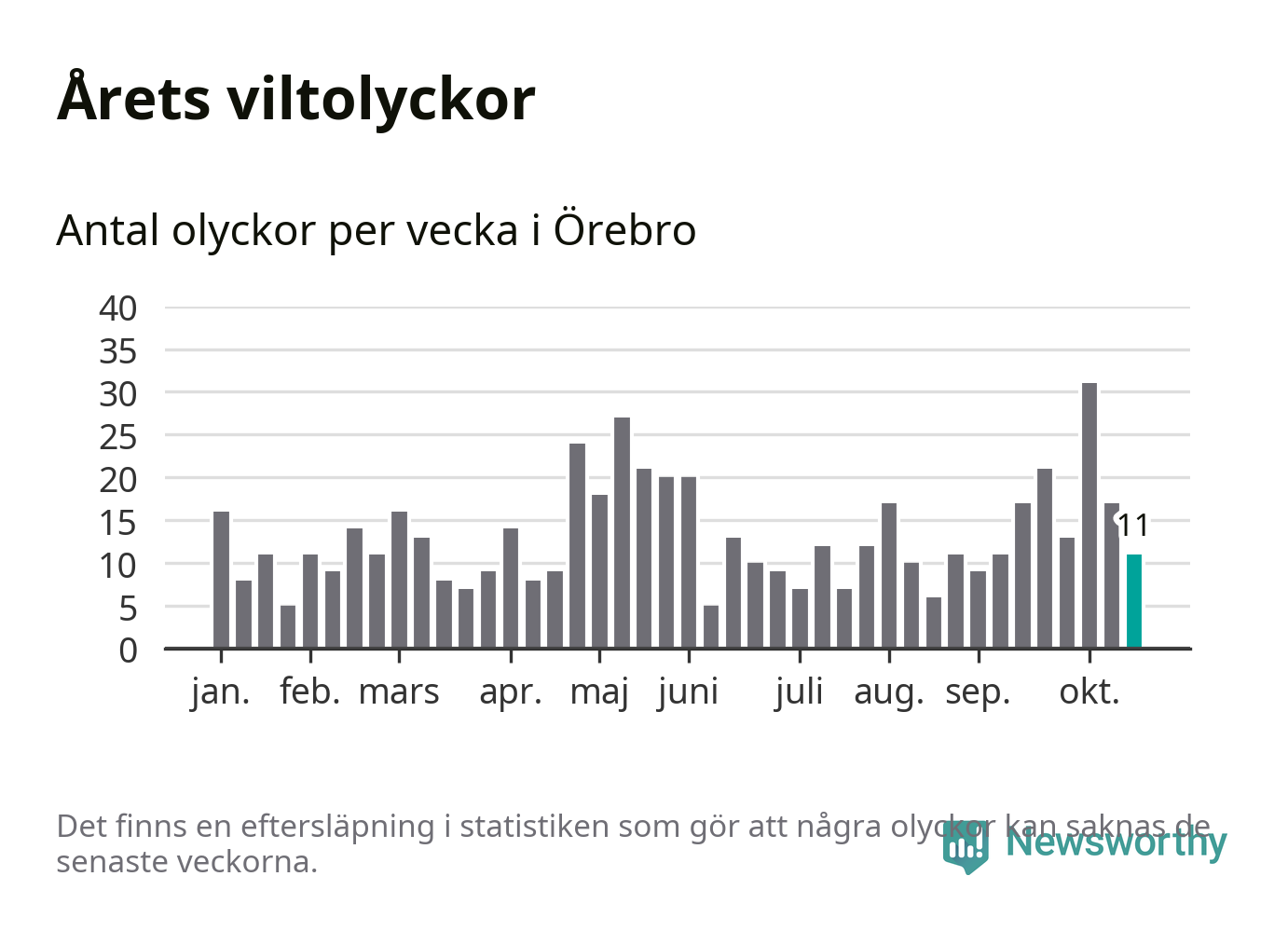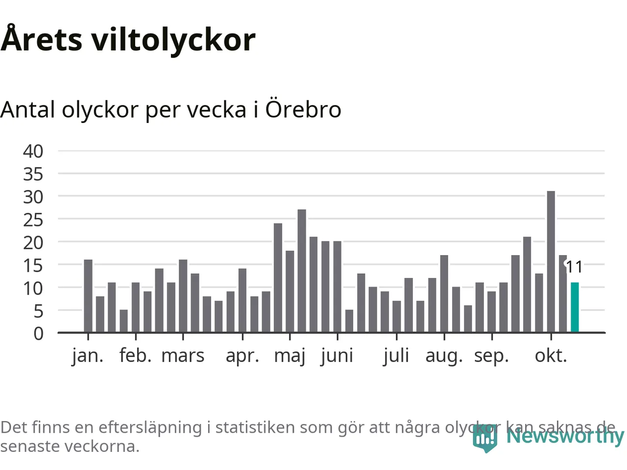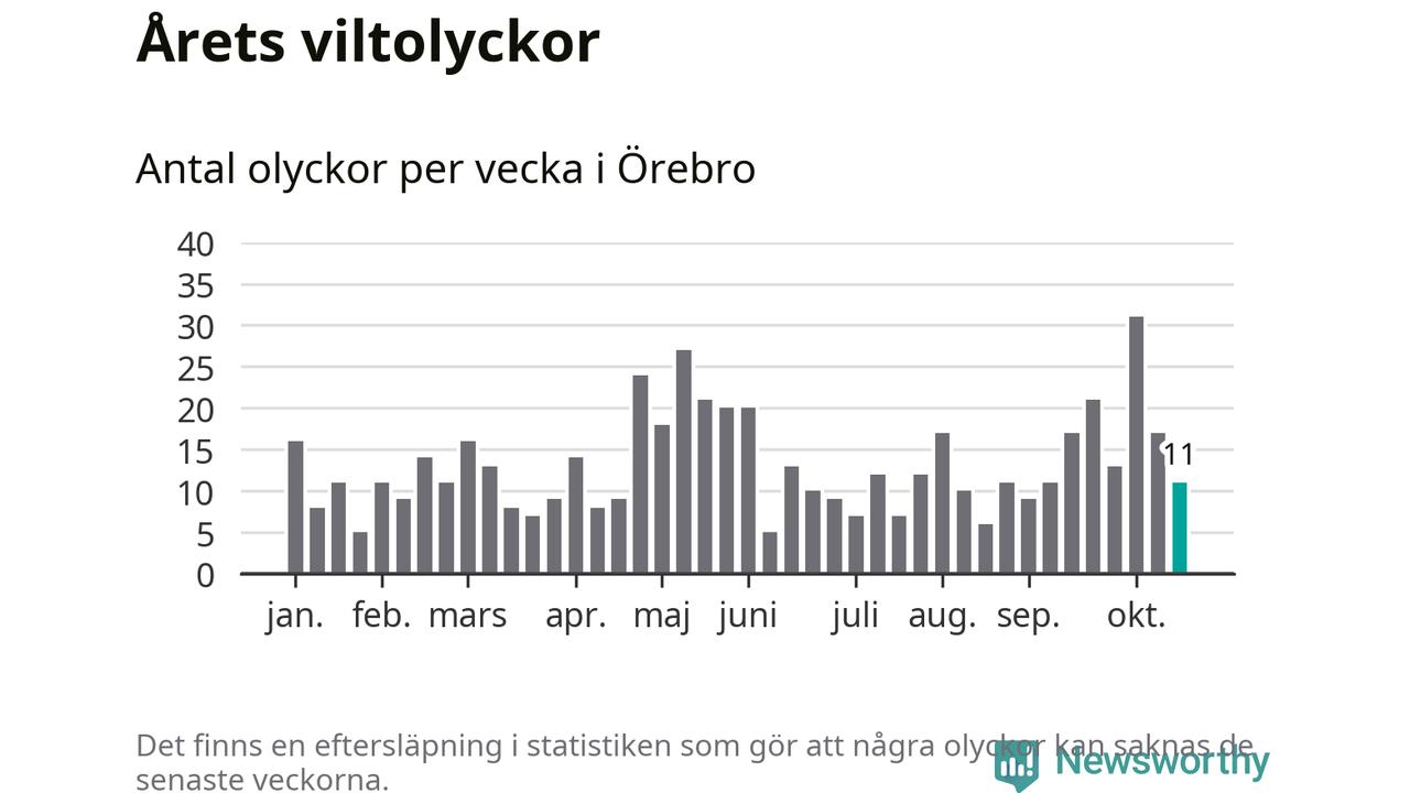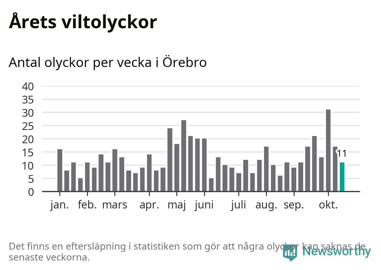 Hittills har elva viltolyckor rapporterats in i Örebro kommun från vecka 43. Se listan här.