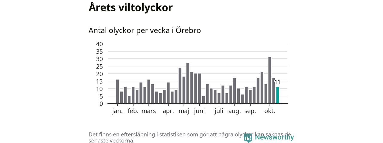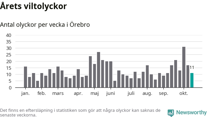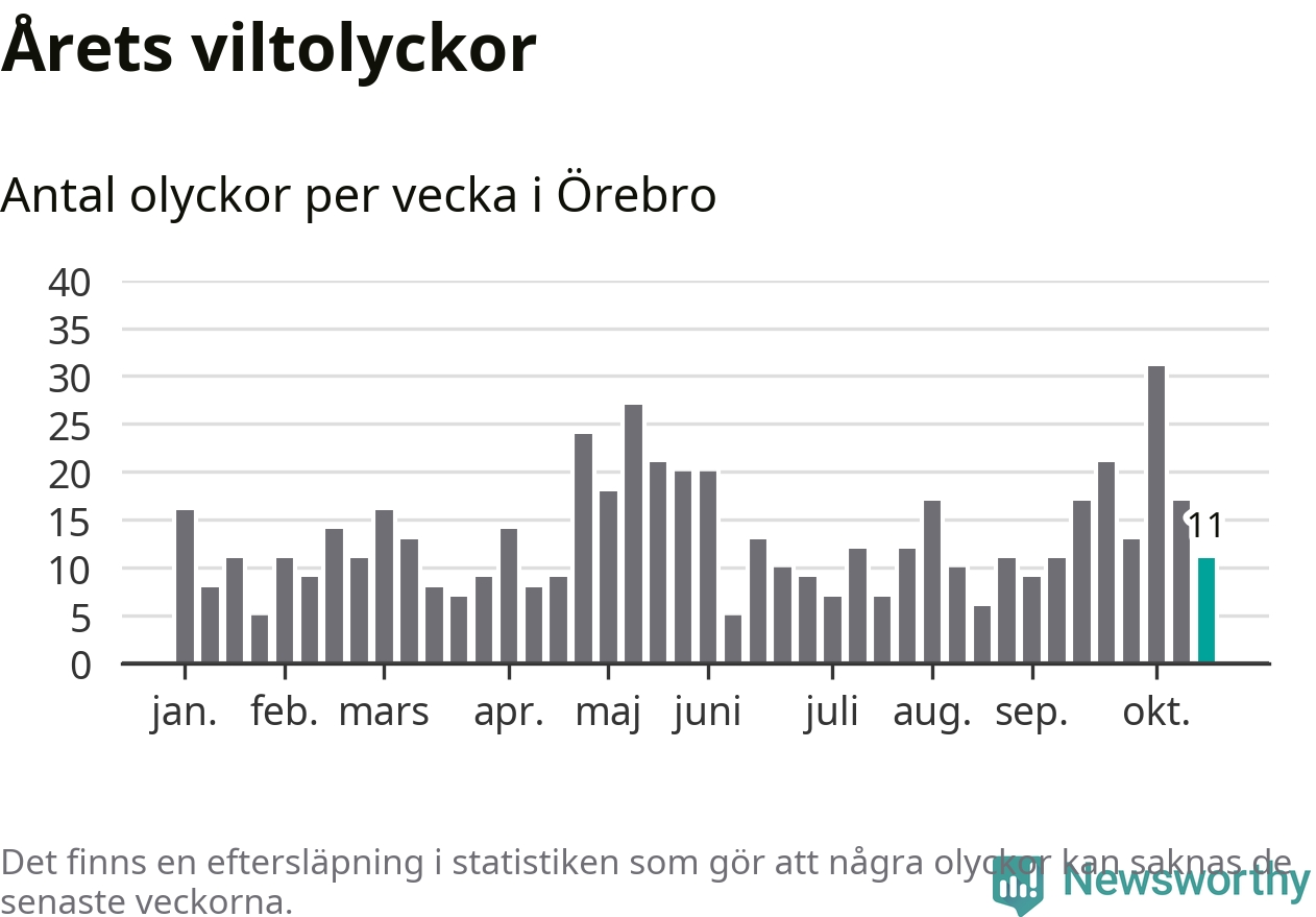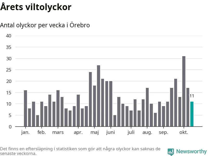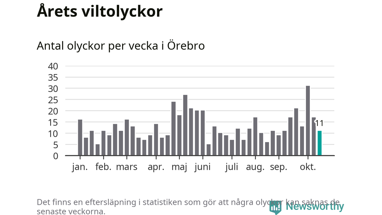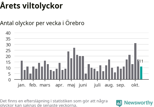 Hittills har elva viltolyckor rapporterats in i Örebro kommun från vecka 43. Se listan här.
