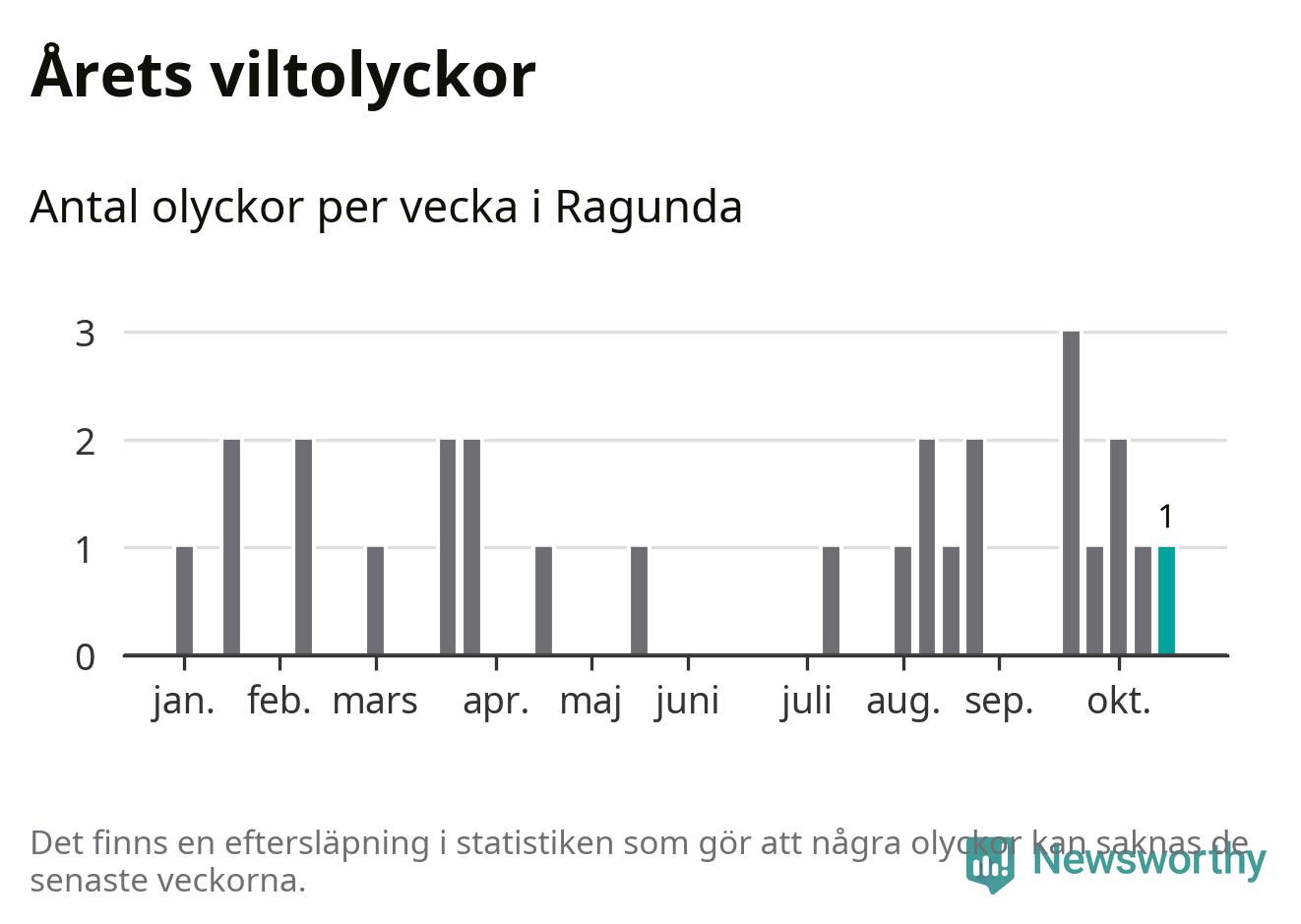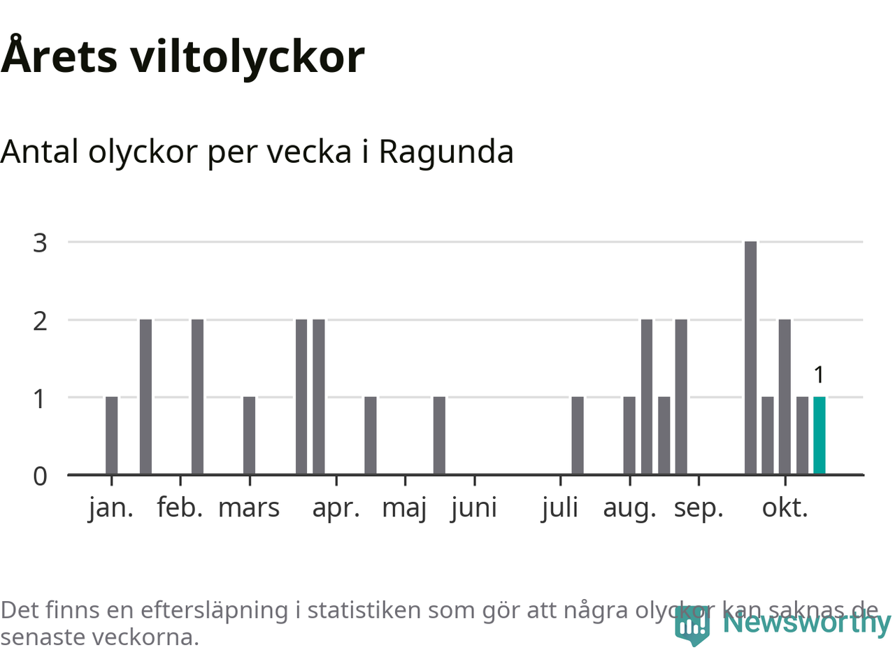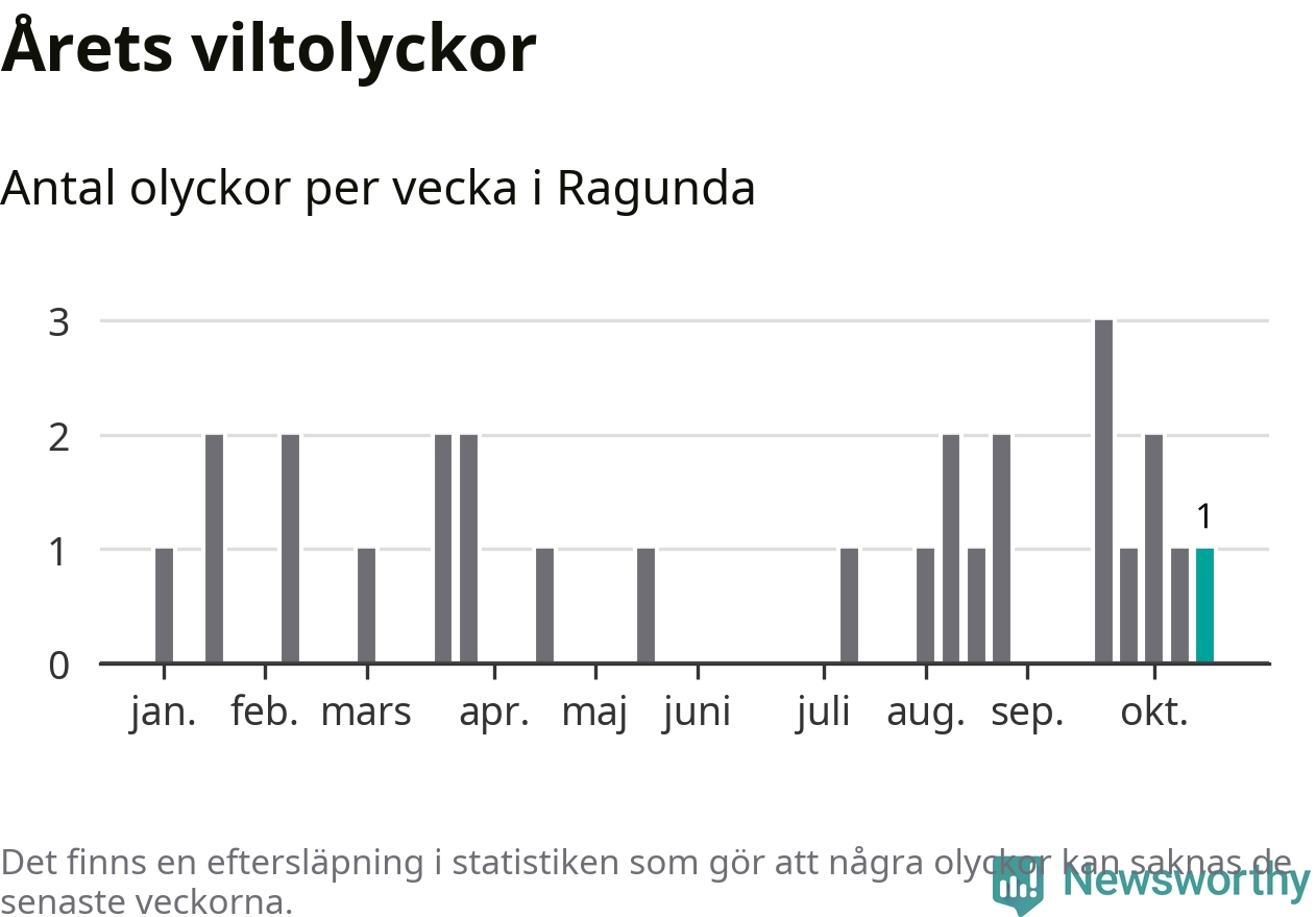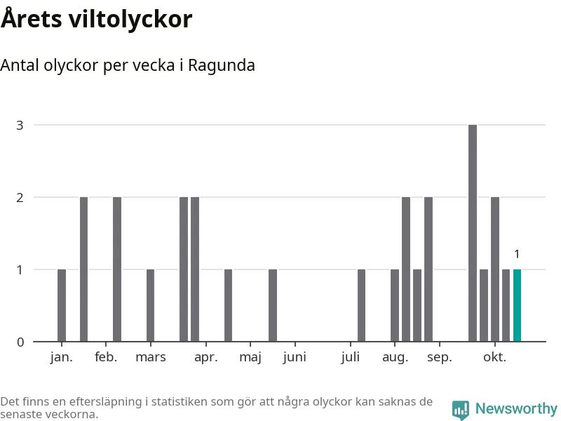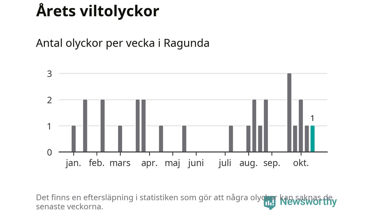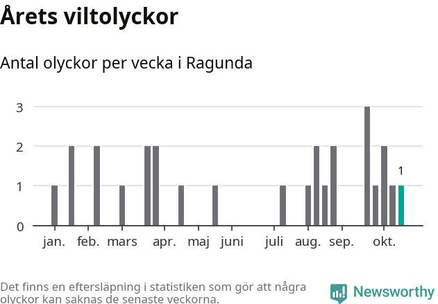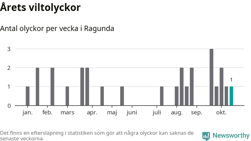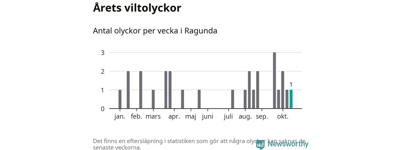 Från förra veckan (vecka 43) har hittills en viltolycka rapporterats in i Ragunda kommun.