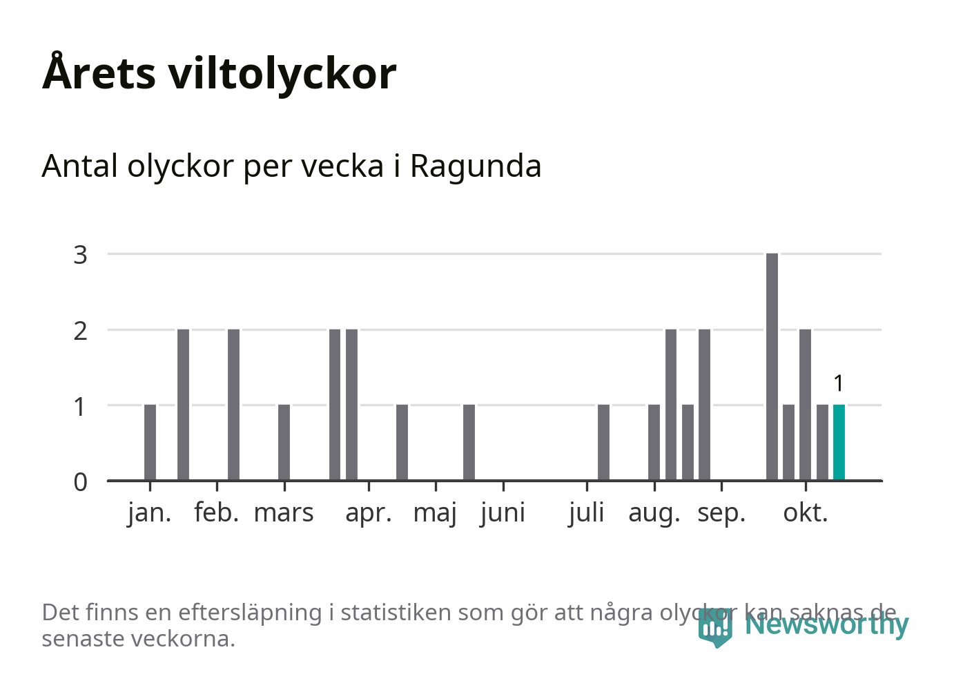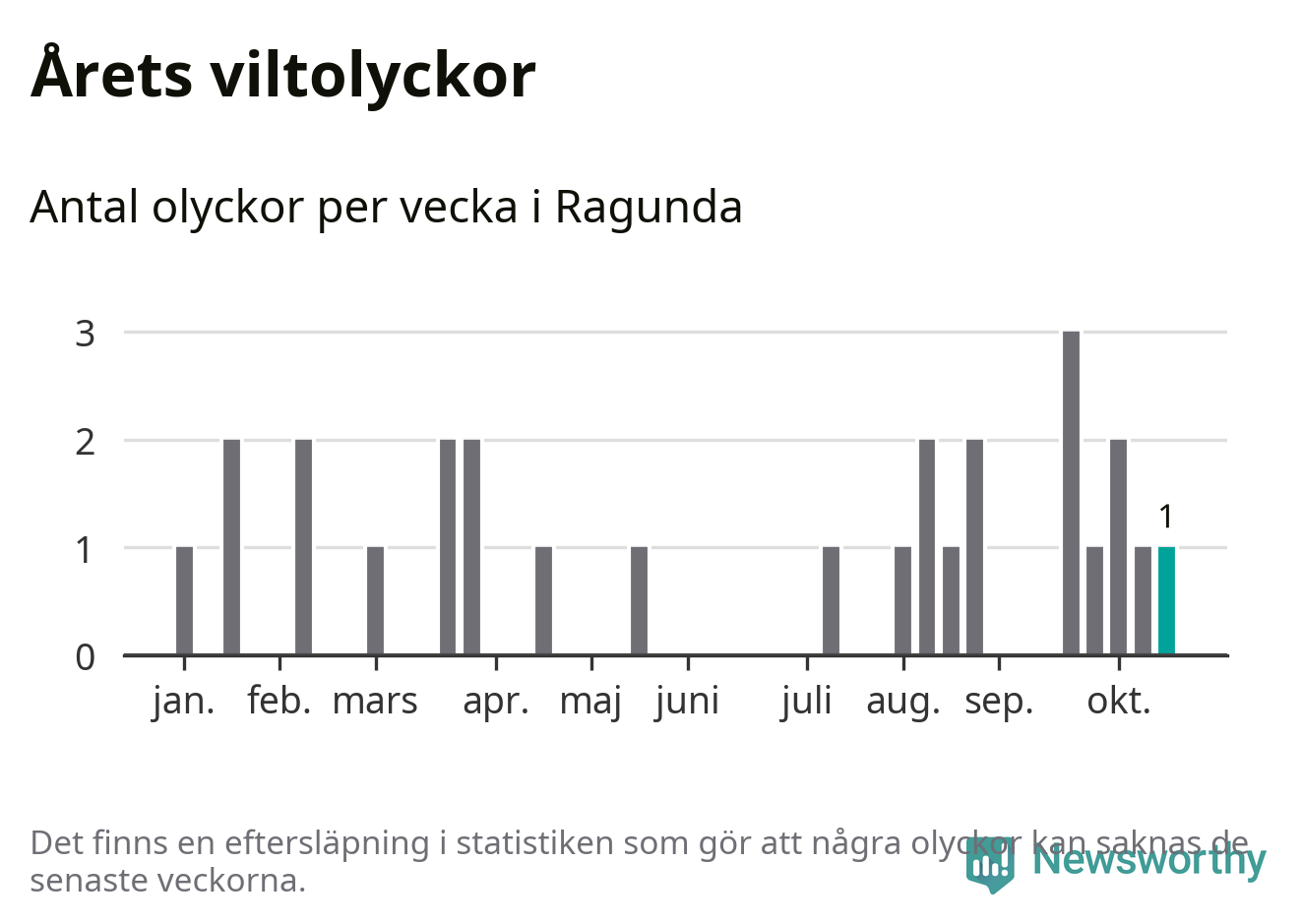 Totalt det här året har det inträffat 27 viltolyckor i kommunen. Det är mindre än genomsnittet för motsvarande period (omkring 32) de senaste tio åren.