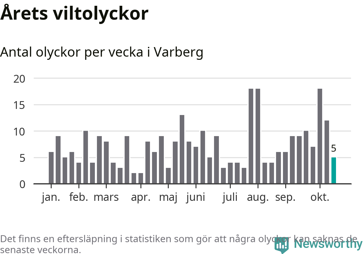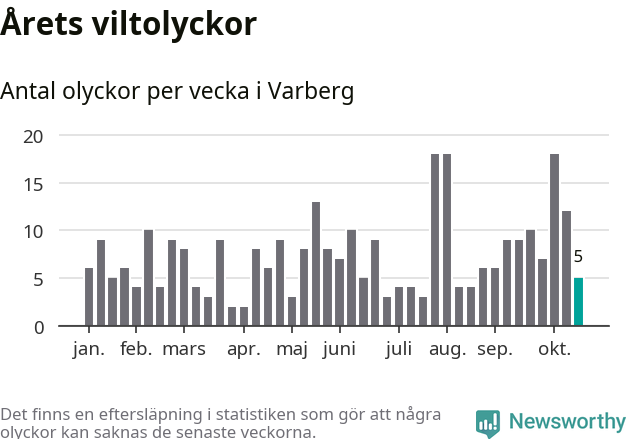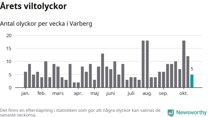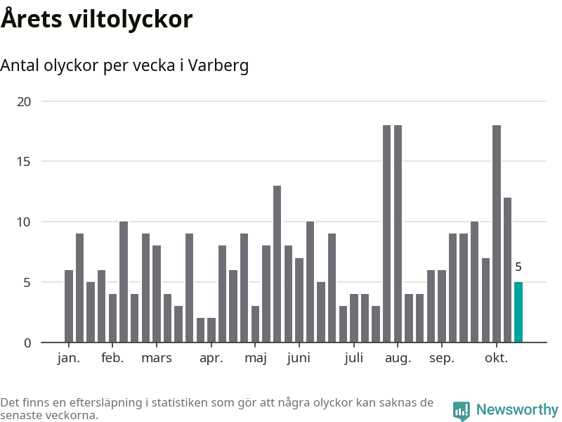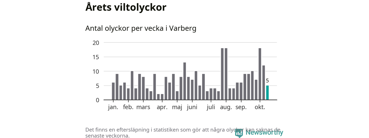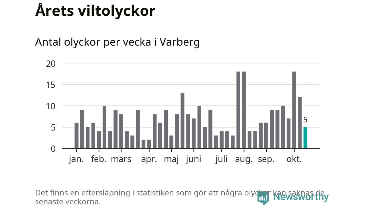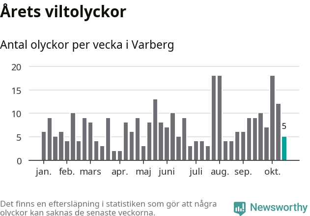 Hittills har fem viltolyckor rapporterats in i Varbergs kommun från vecka 43. Se listan här.