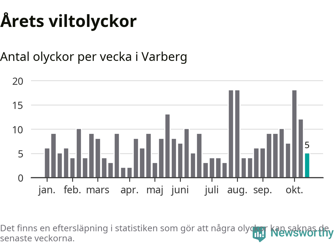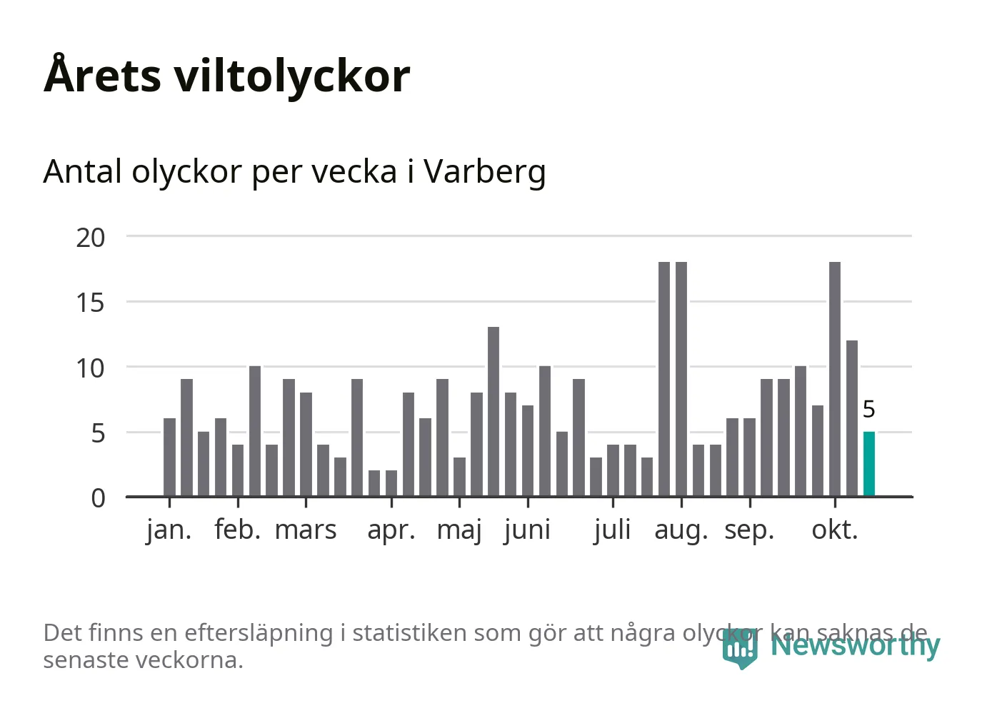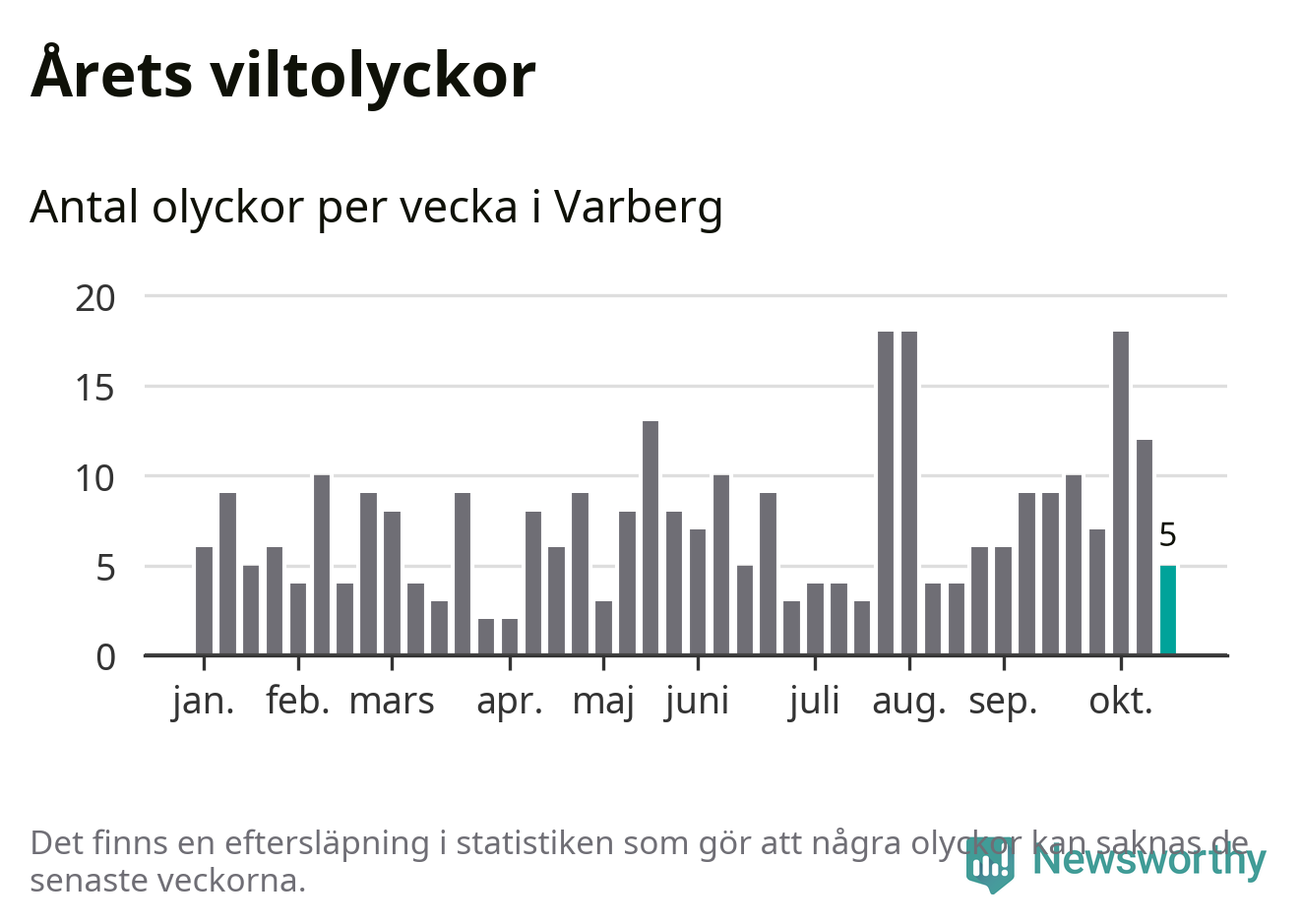 Hittills har fem viltolyckor rapporterats in i Varbergs kommun från vecka 43. Se listan här.