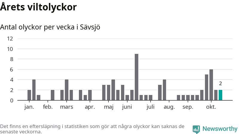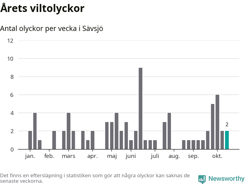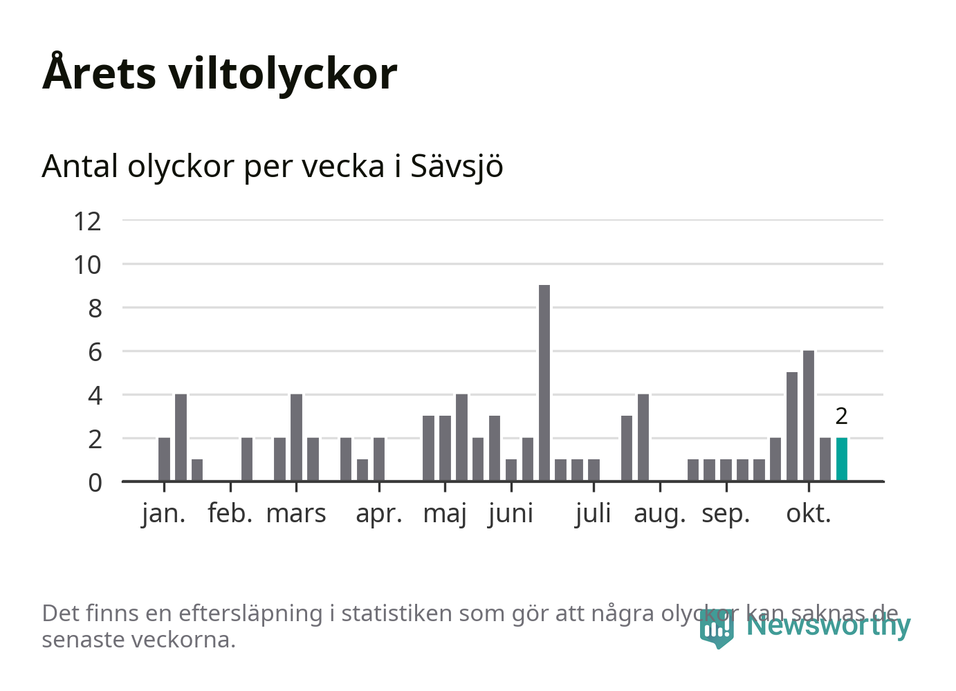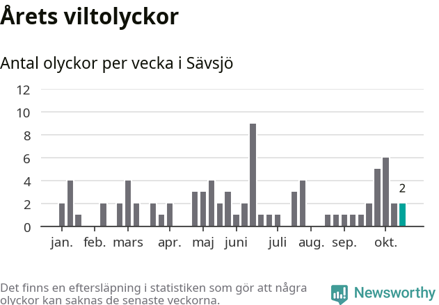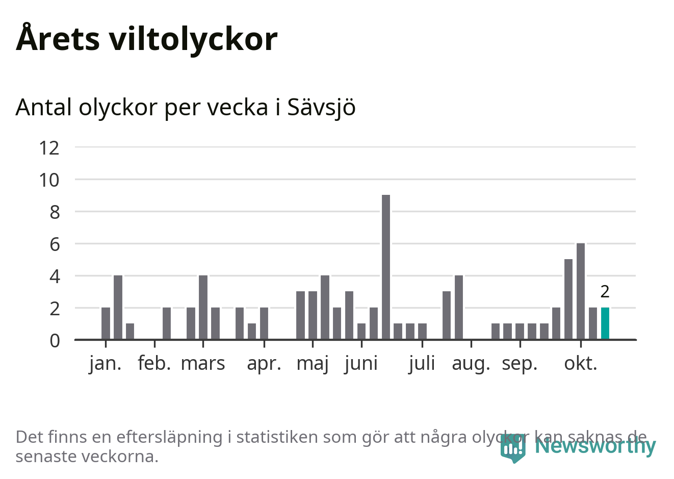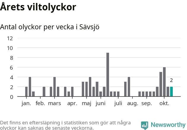 Hittills har två viltolyckor rapporterats in i Sävsjö kommun från vecka 43. Se listan här.