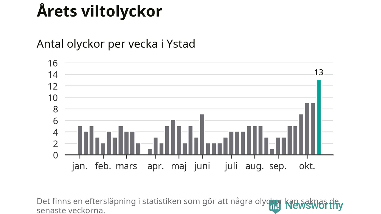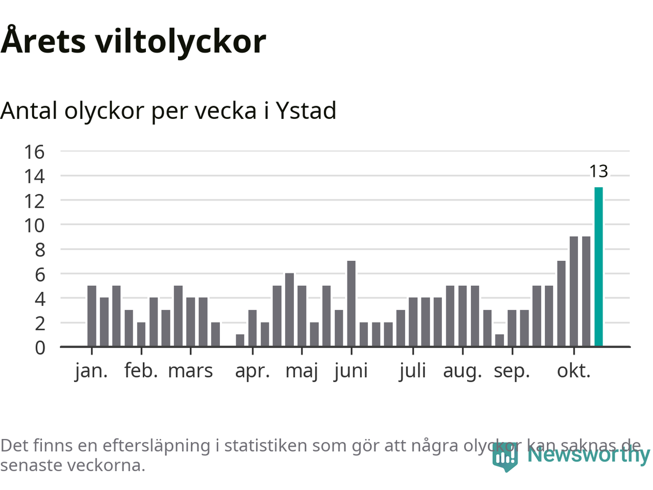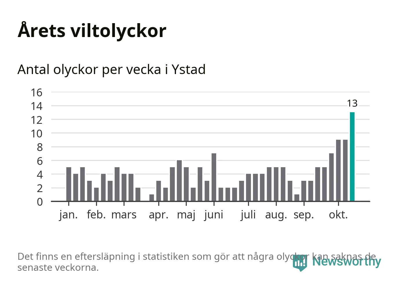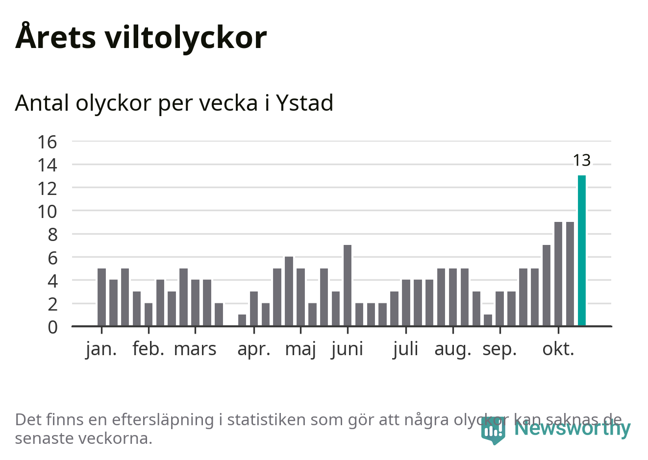 Under vecka 43 rapporterades 13 viltolyckor in i Ystads kommun. Det är det största antalet på en enskild vecka hittills i år.