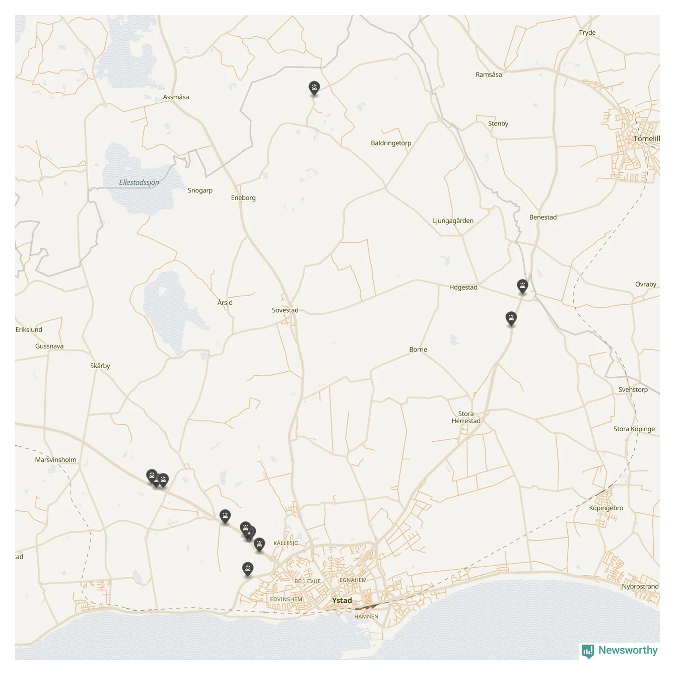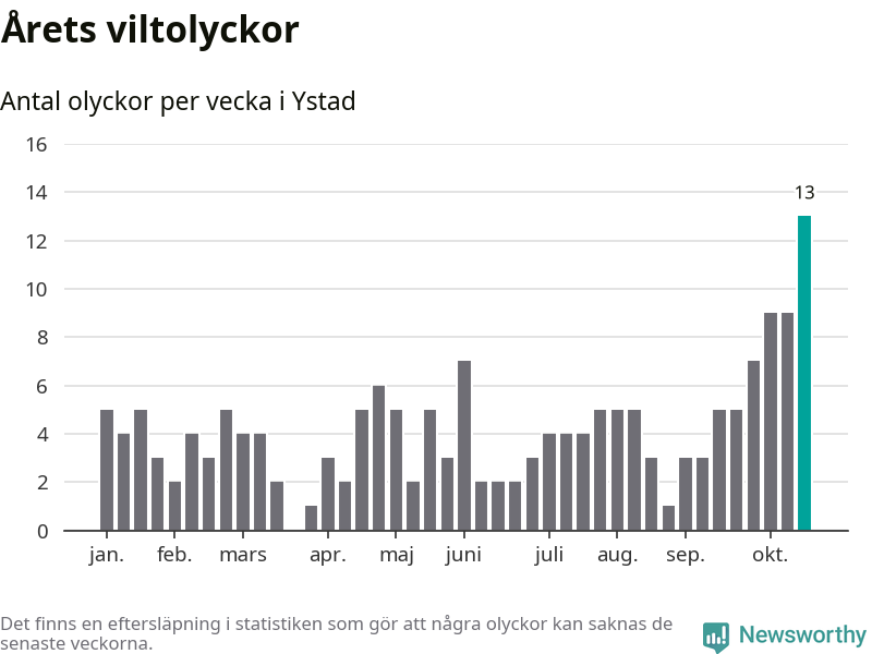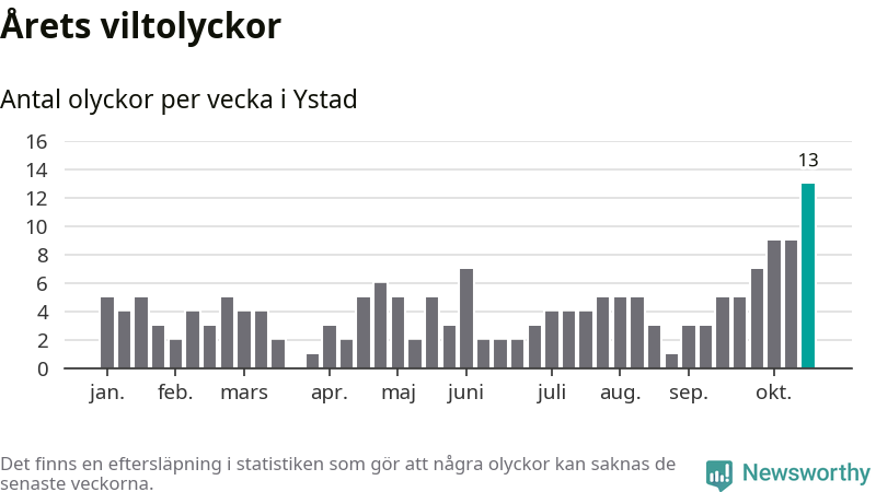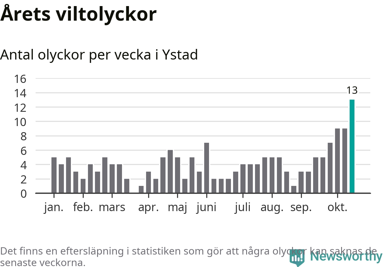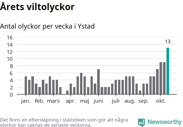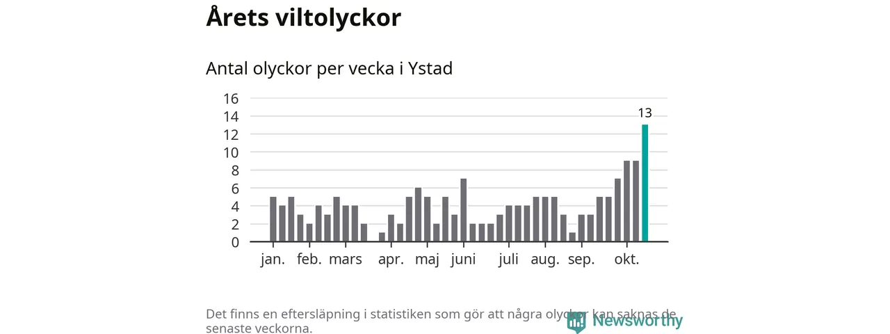 Under vecka 43 rapporterades 13 viltolyckor in i Ystads kommun. Det är det största antalet på en enskild vecka hittills i år.