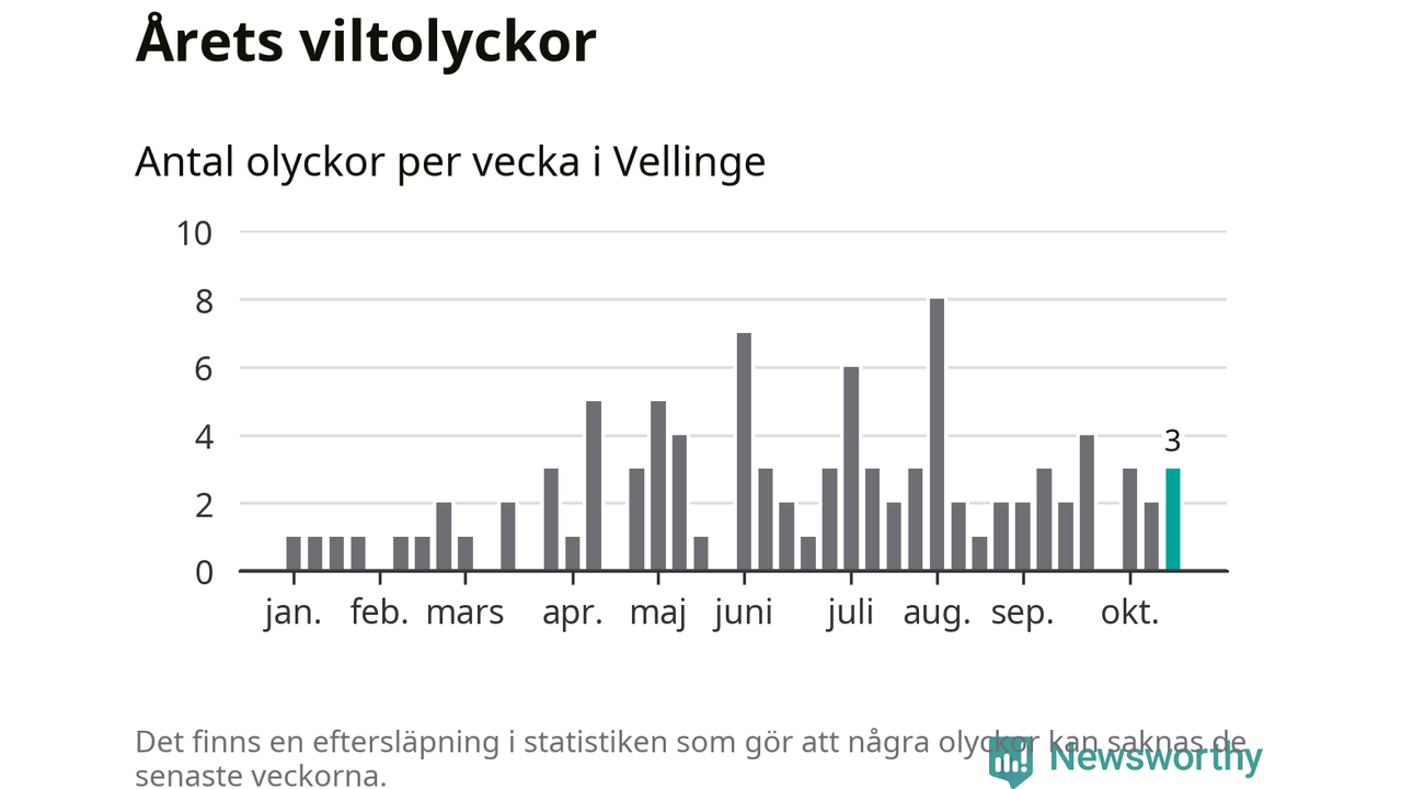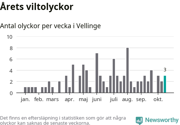 Totalt det här året har det inträffat 95 viltolyckor i kommunen. Det är mer än genomsnittet för motsvarande period (omkring 83) de senaste tio åren.