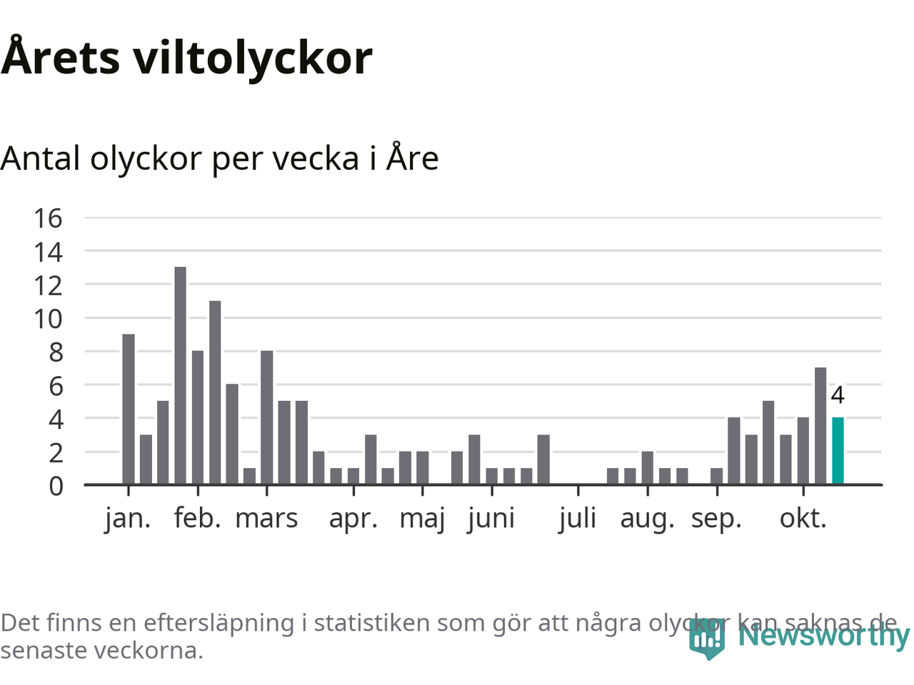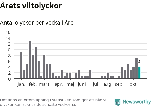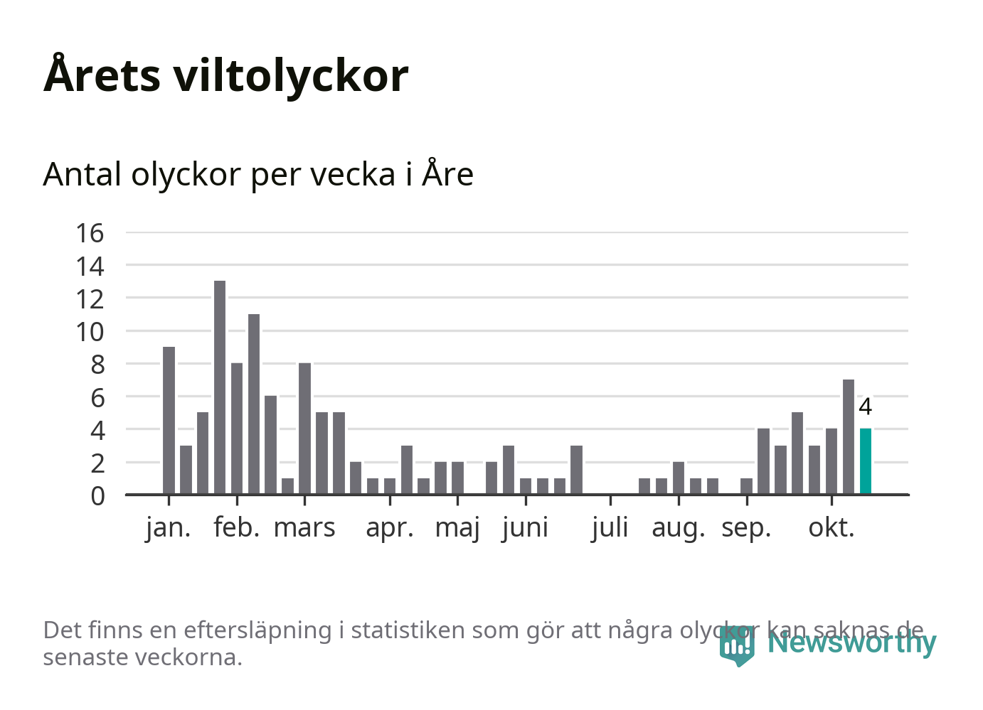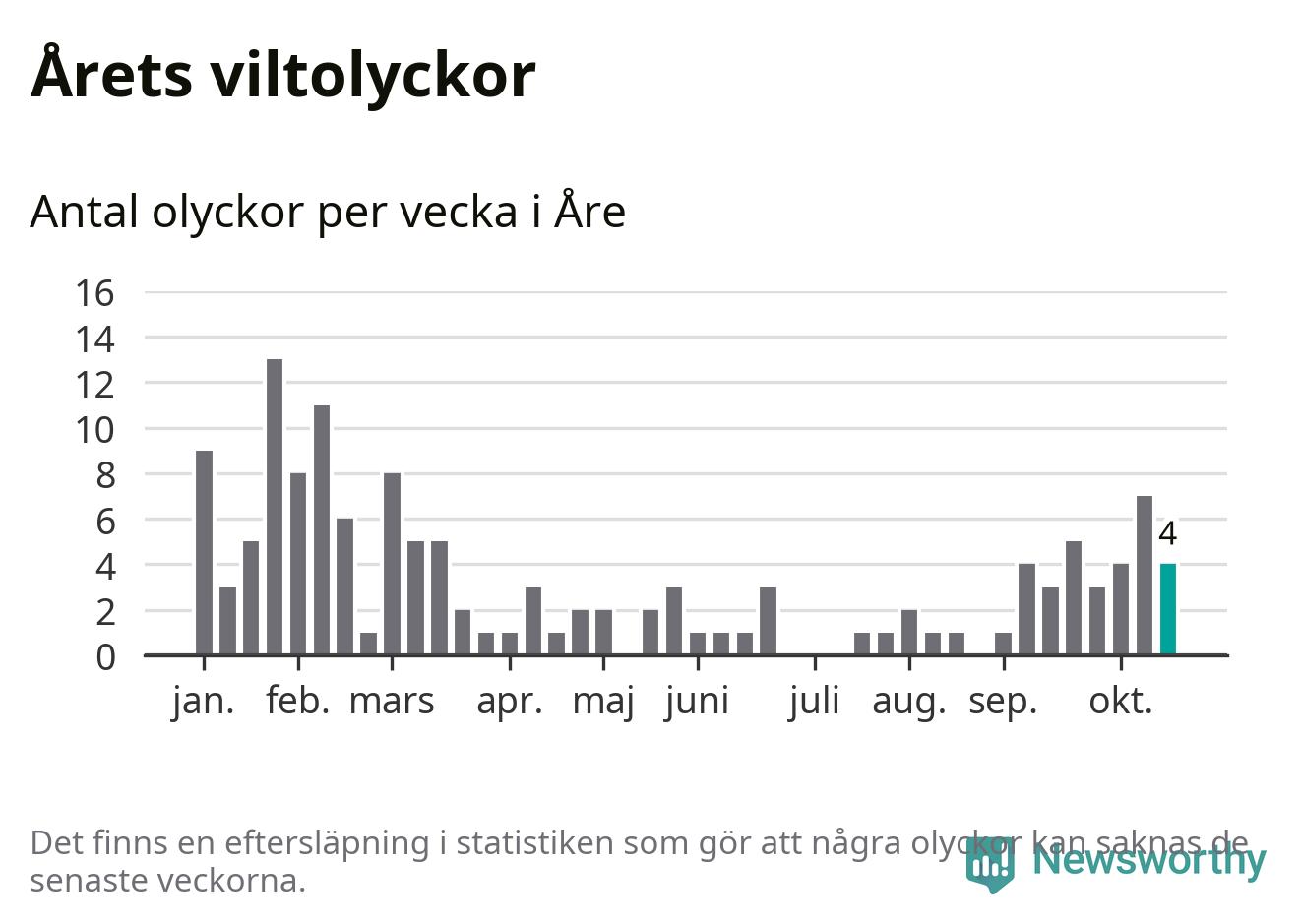 Hittills har fyra viltolyckor rapporterats in i Åre kommun från vecka 43. Se listan här.