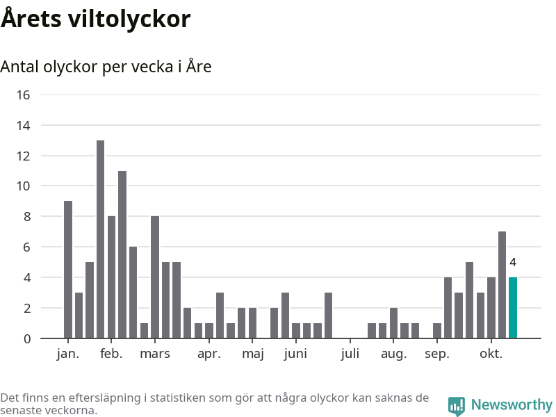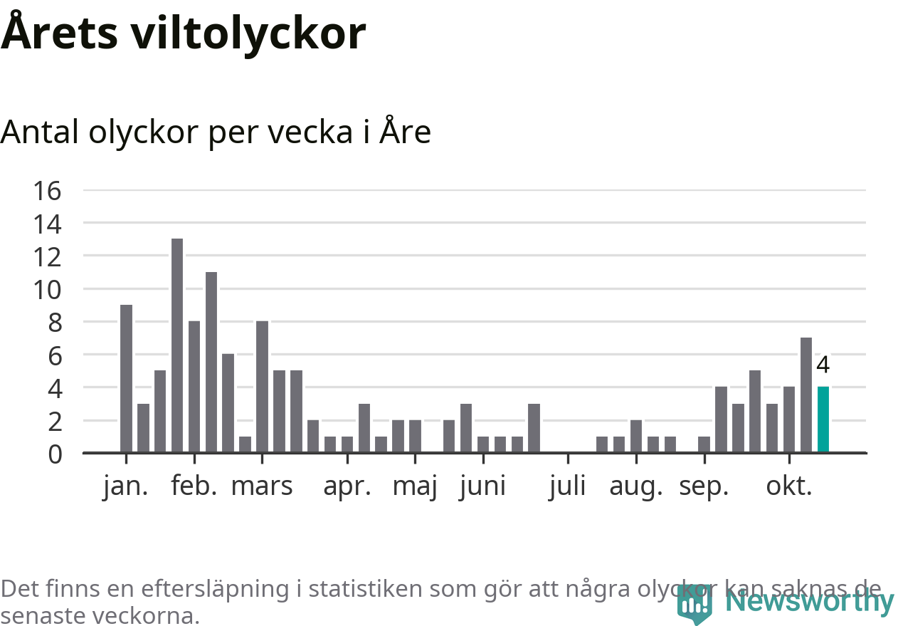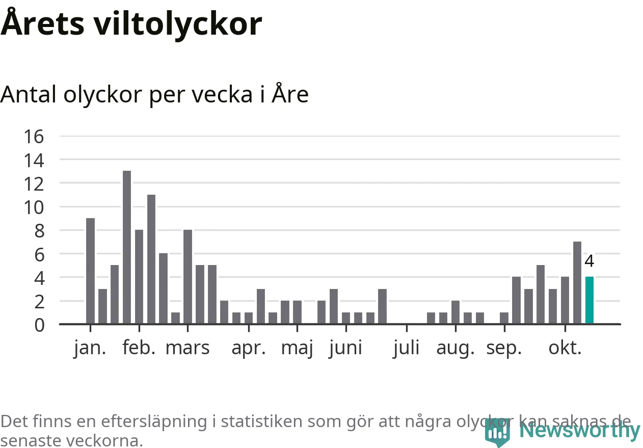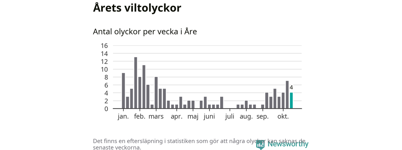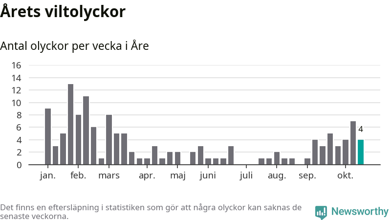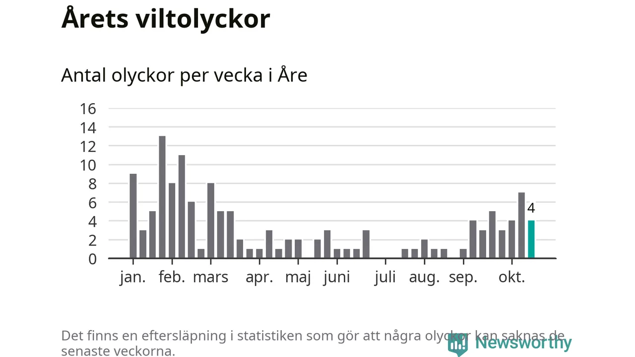 Hittills har fyra viltolyckor rapporterats in i Åre kommun från vecka 43. Se listan här.