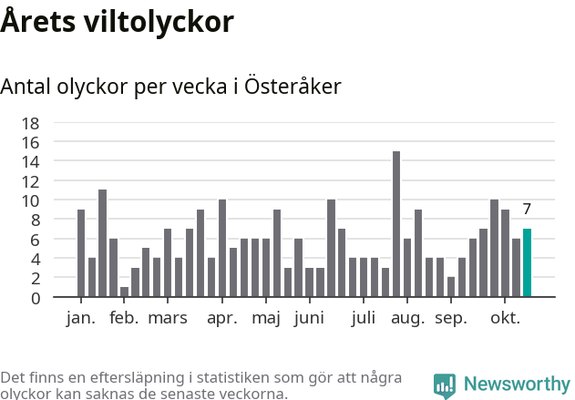 Hittills har sju viltolyckor rapporterats in i Österåkers kommun från vecka 43. Se listan här.