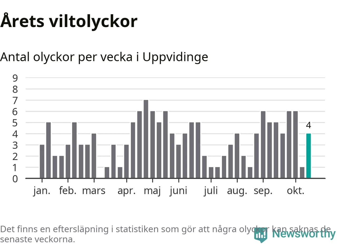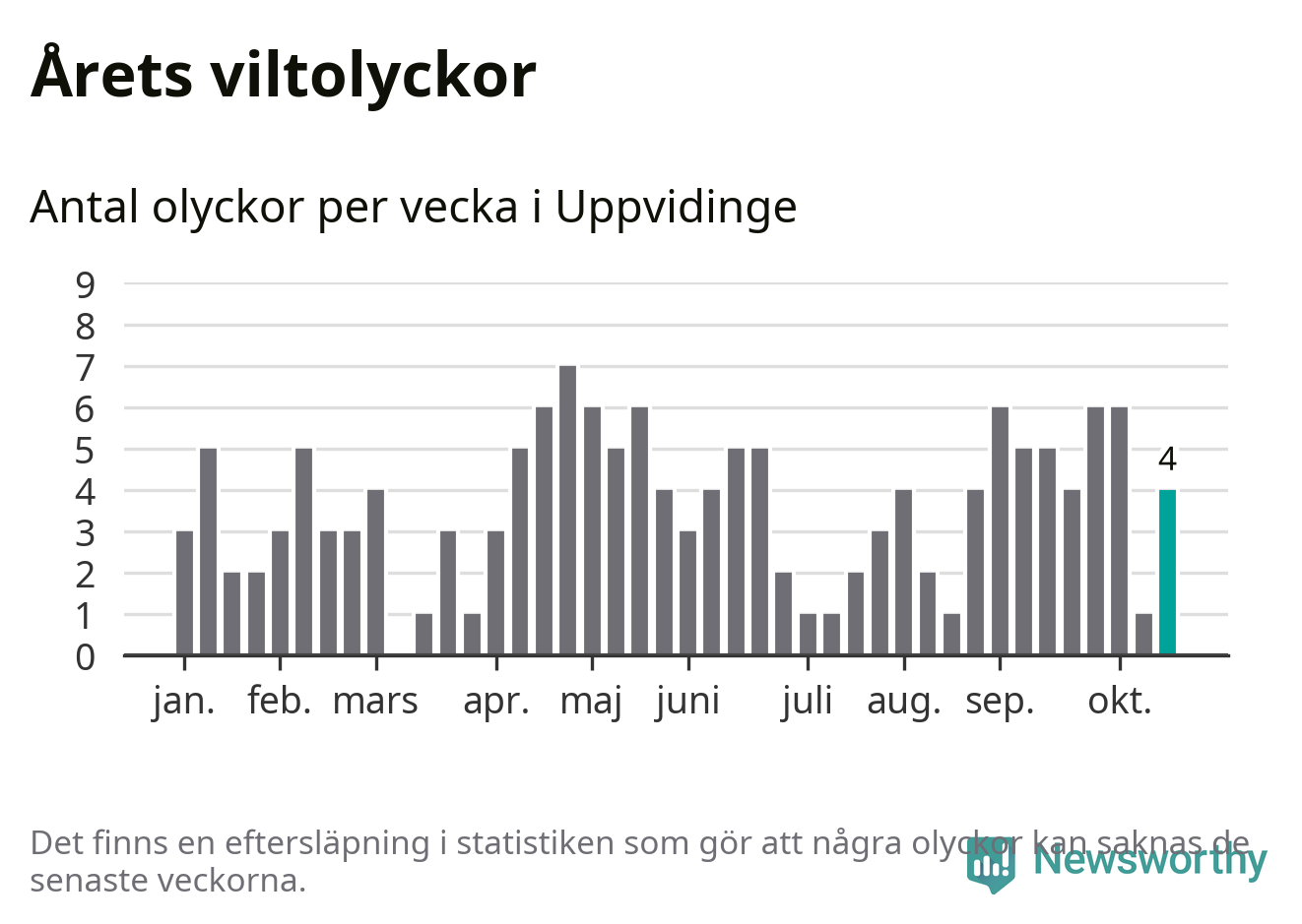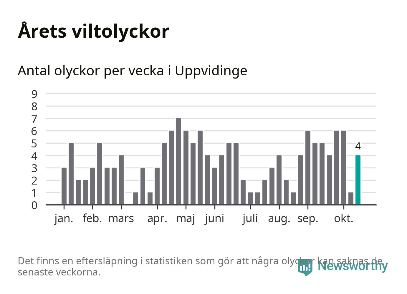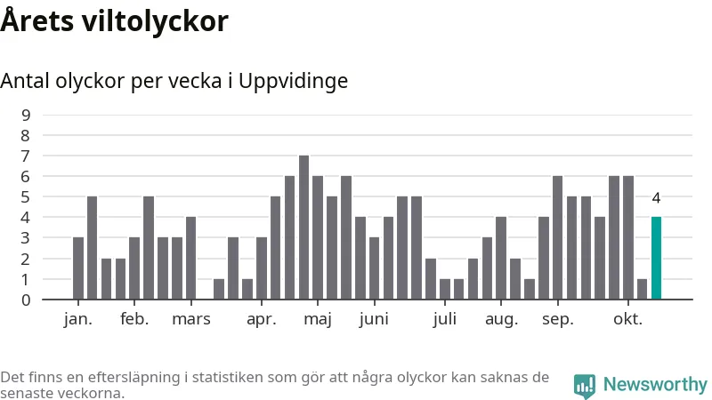 Hittills har fyra viltolyckor rapporterats in i Uppvidinge kommun från vecka 43. Se listan här.
