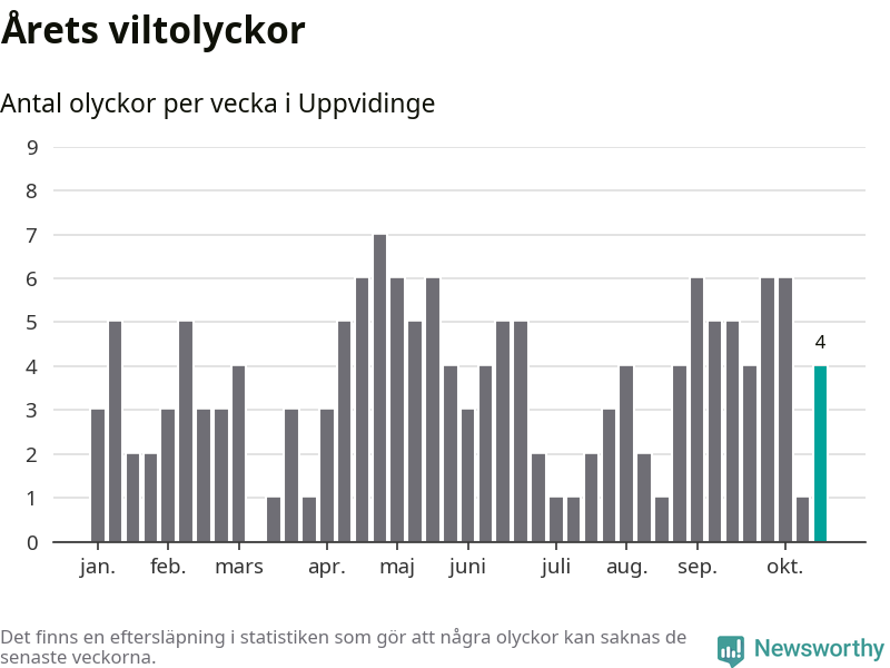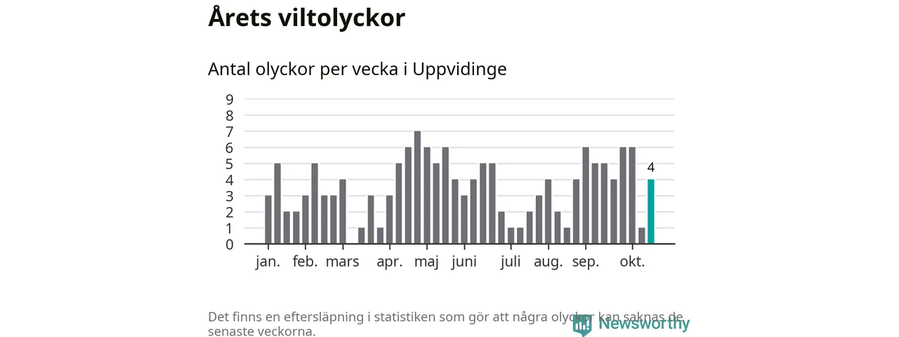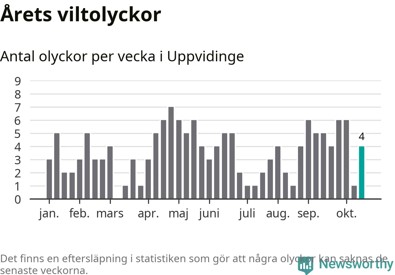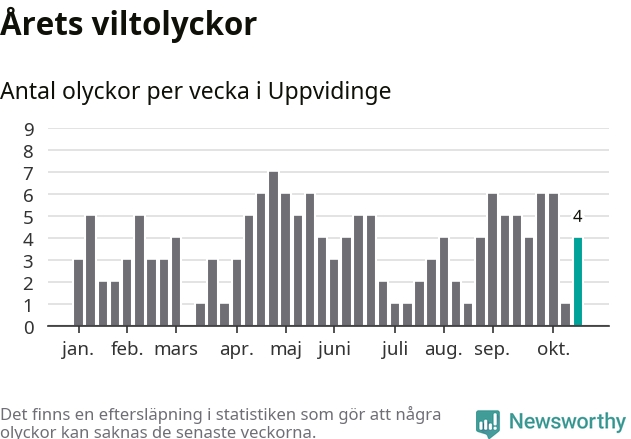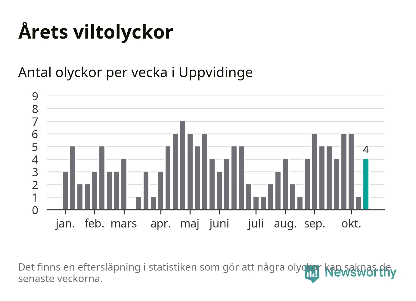 Hittills har fyra viltolyckor rapporterats in i Uppvidinge kommun från vecka 43. Se listan här.