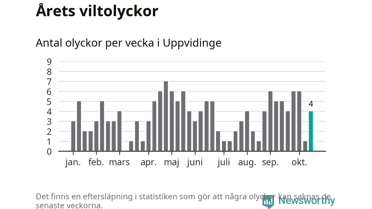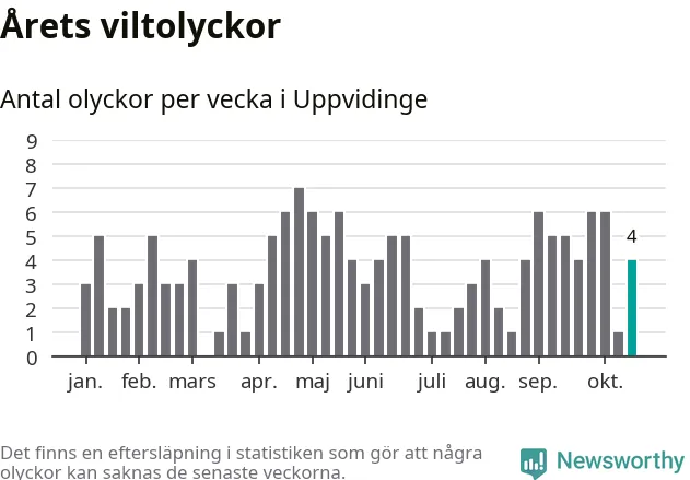 Totalt det här året har det inträffat 153 viltolyckor i kommunen. Det är mindre än genomsnittet för motsvarande period (omkring 191) de senaste tio åren.