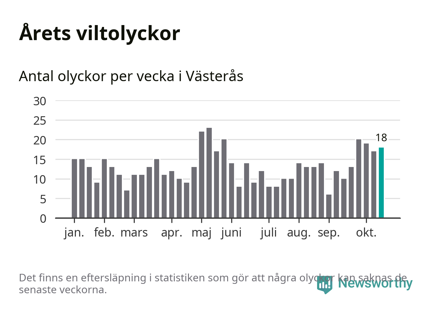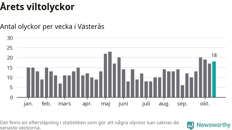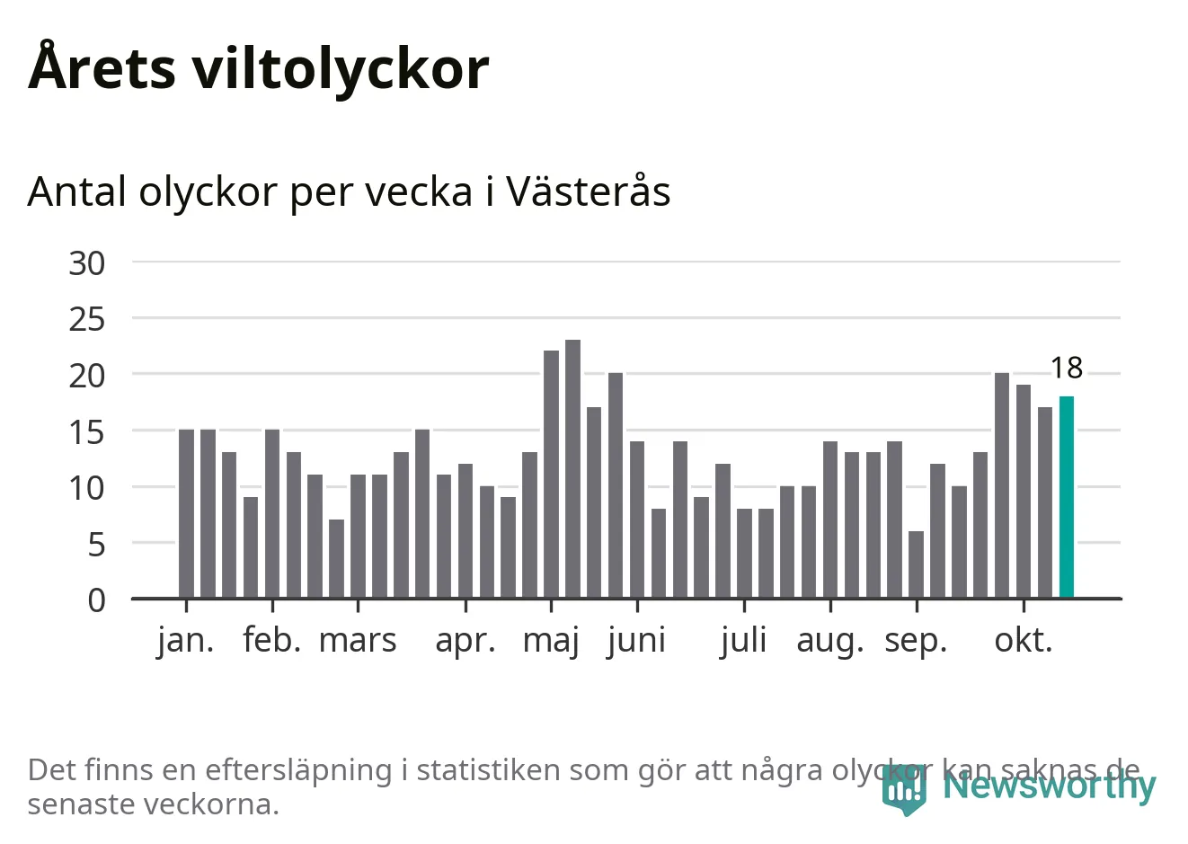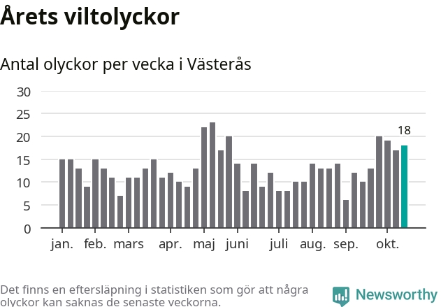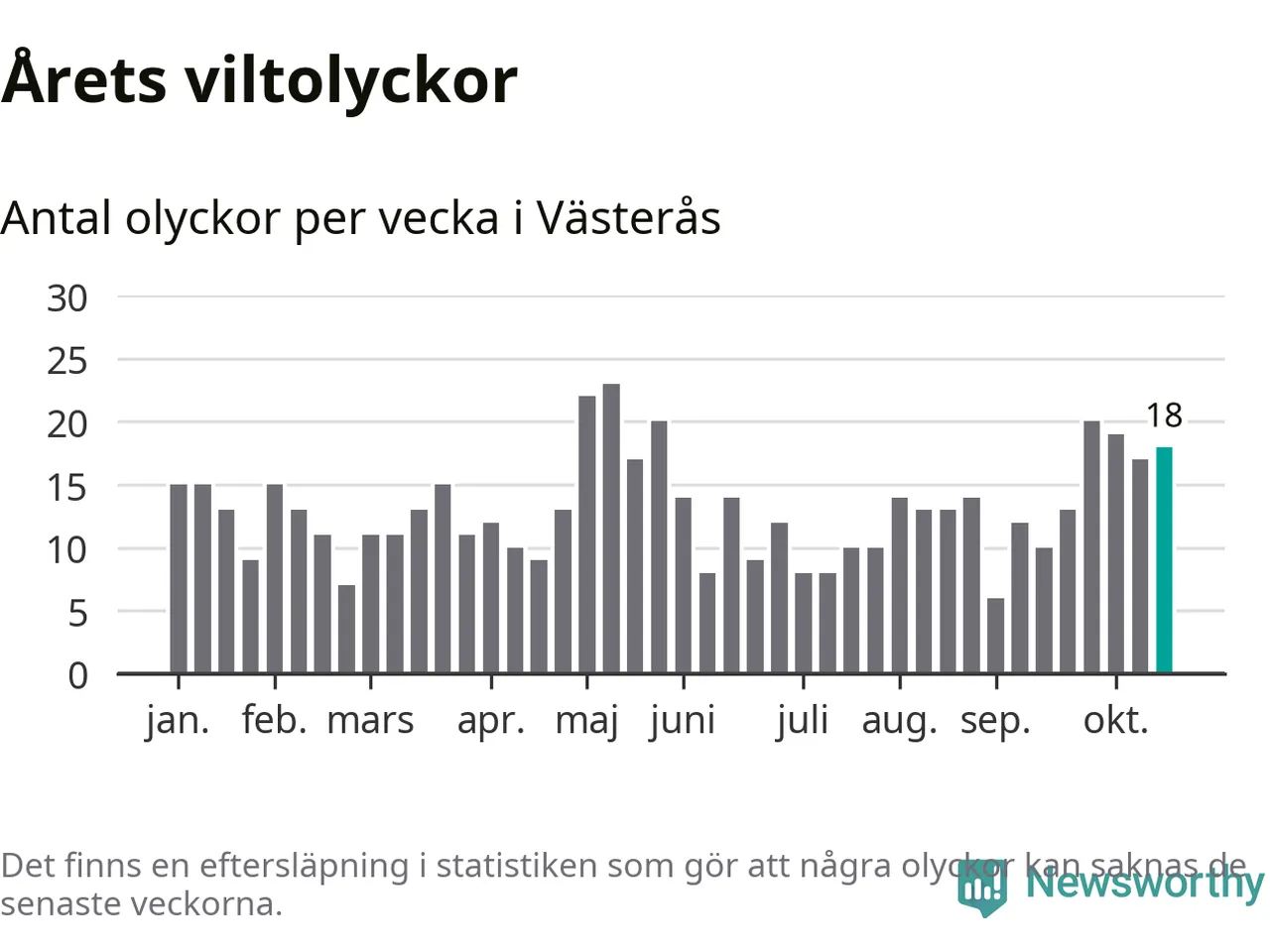 Hittills har 18 viltolyckor rapporterats in i Västerås kommun från vecka 43. Se listan här.