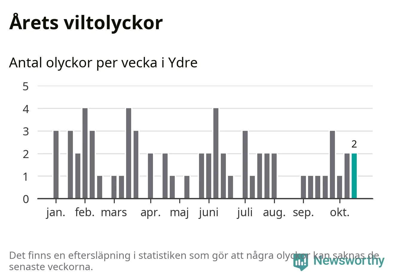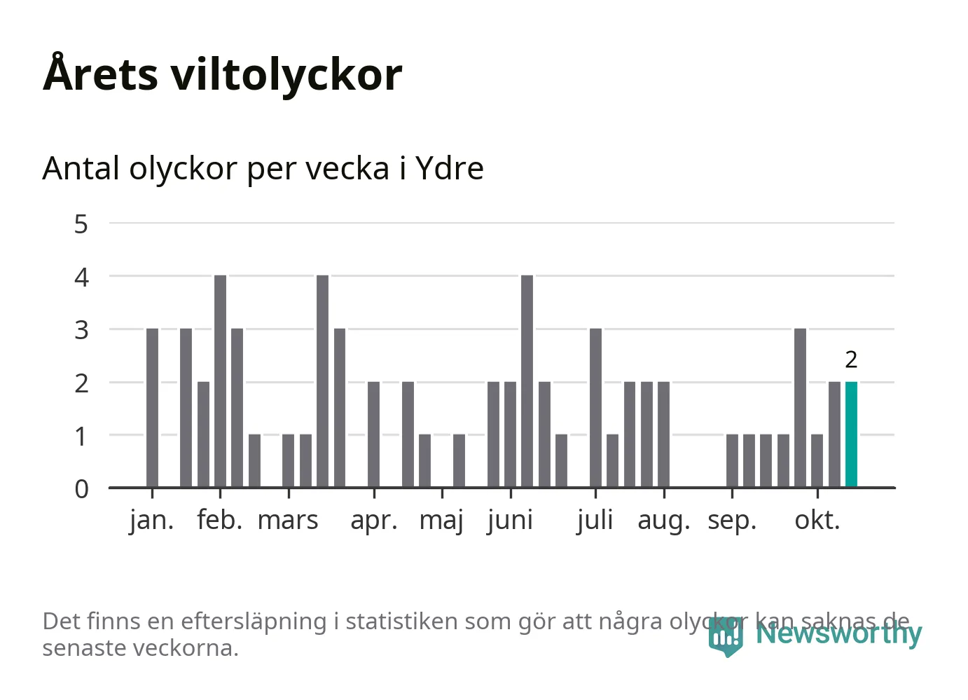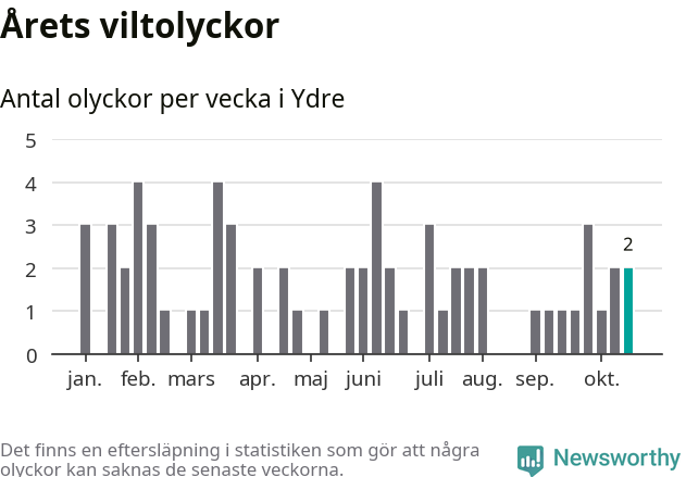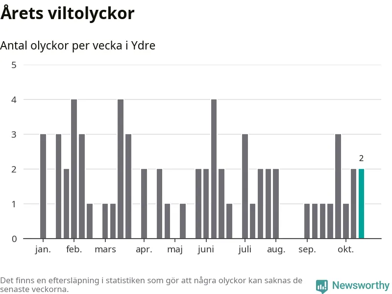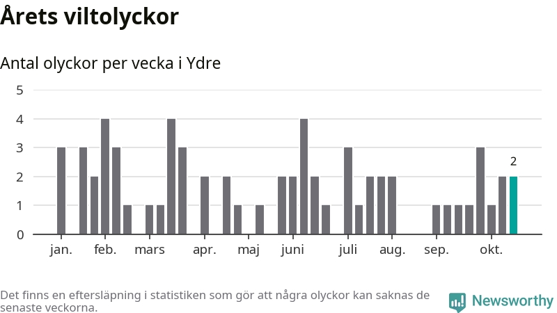 Hittills har två viltolyckor rapporterats in i Ydre kommun från vecka 43. Se listan här.