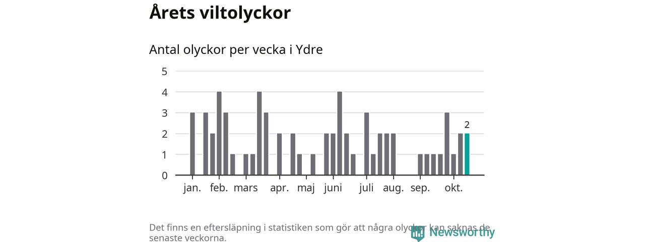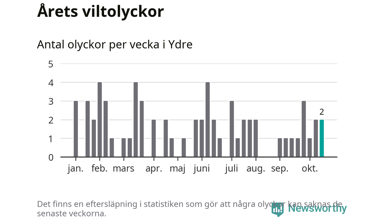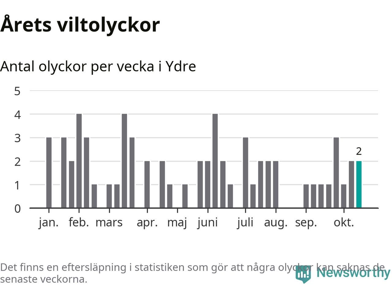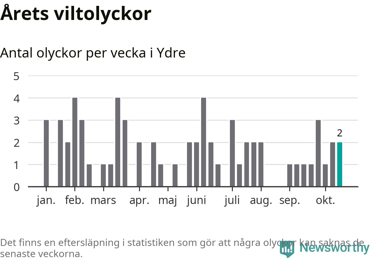 Hittills har två viltolyckor rapporterats in i Ydre kommun från vecka 43. Se listan här.