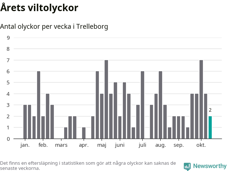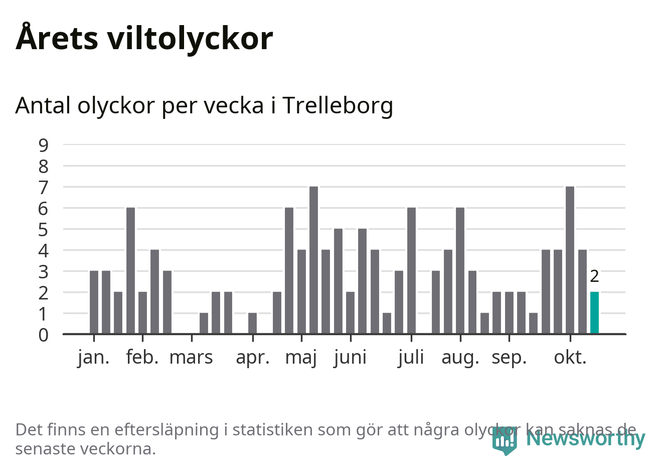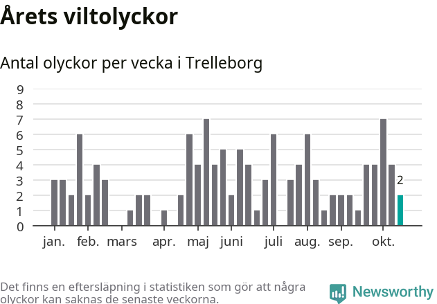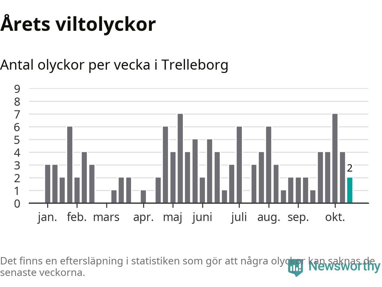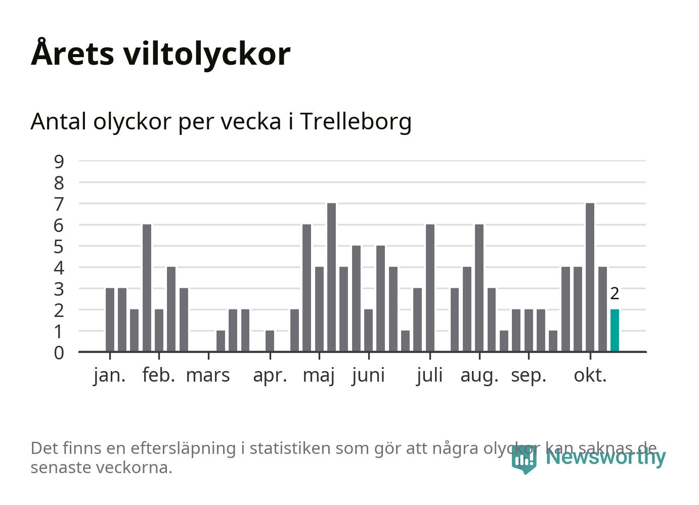 Hittills har två viltolyckor rapporterats in i Trelleborgs kommun från vecka 43. Se listan här.