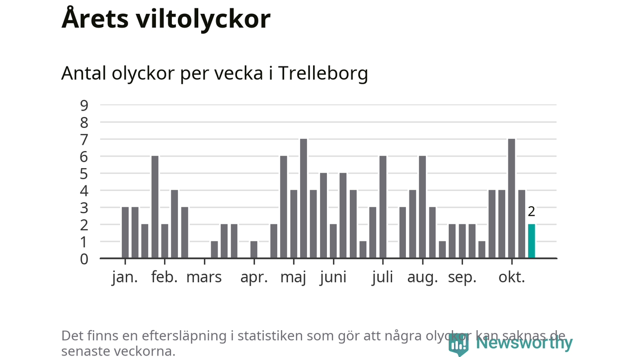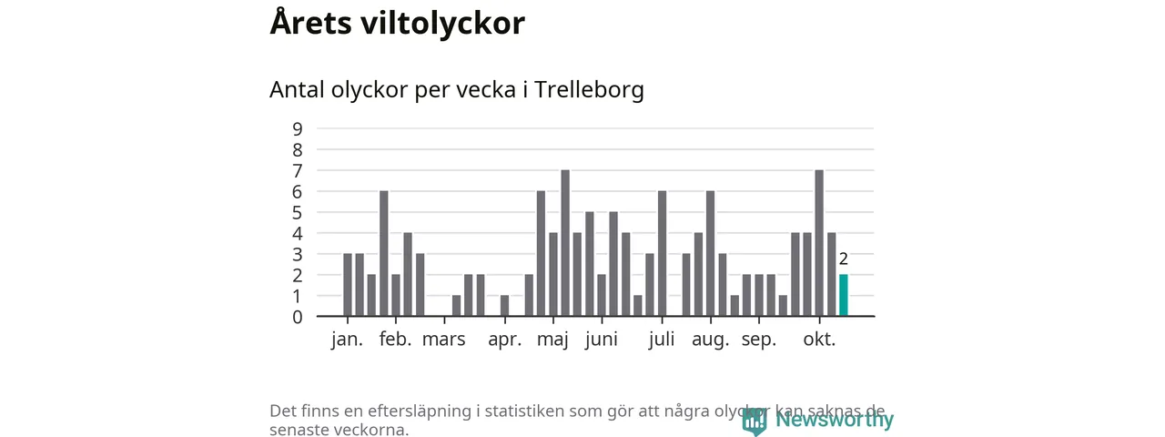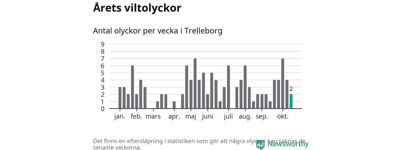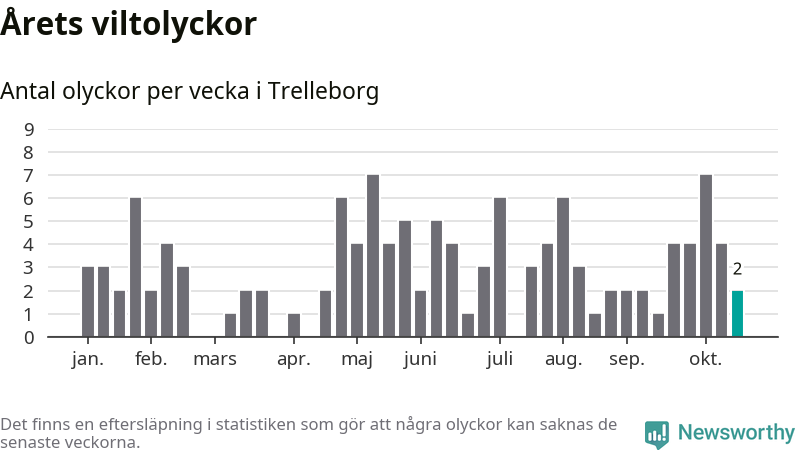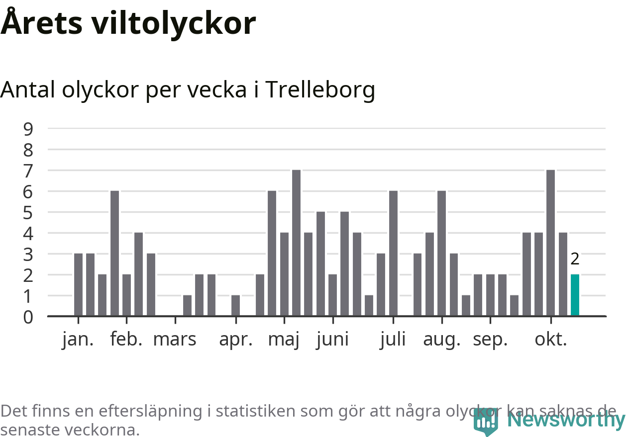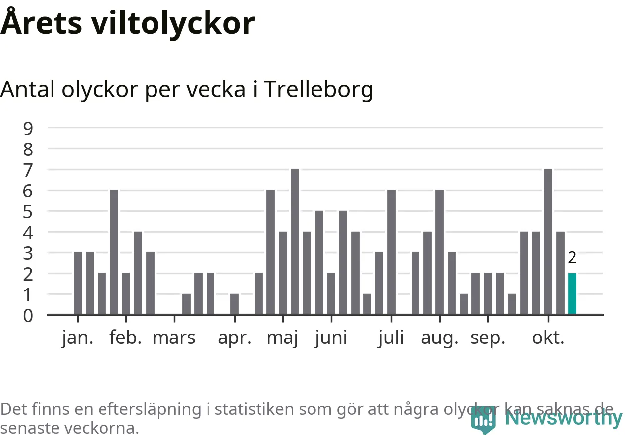 Hittills har två viltolyckor rapporterats in i Trelleborgs kommun från vecka 43. Se listan här.