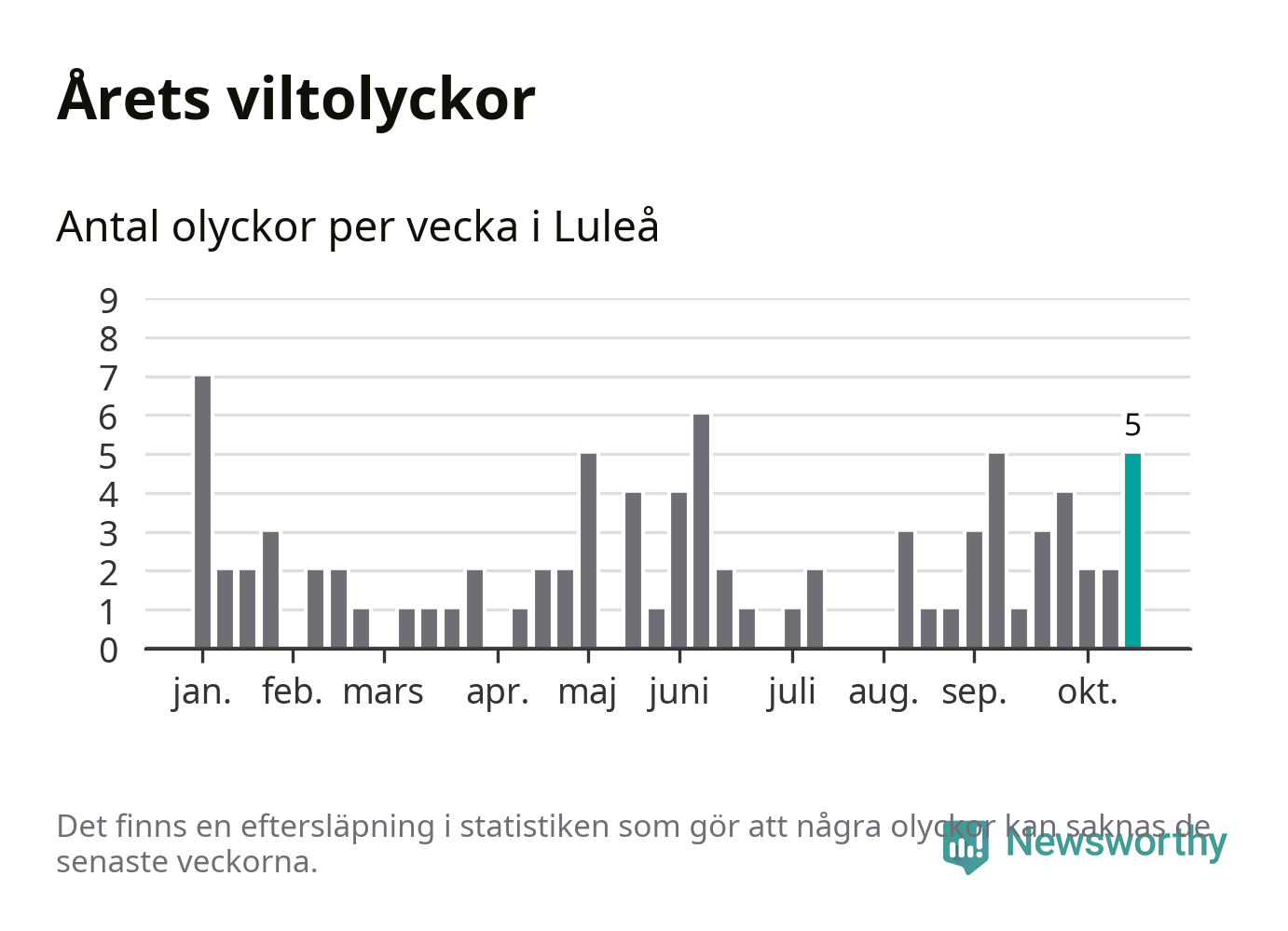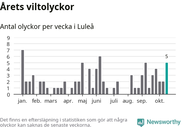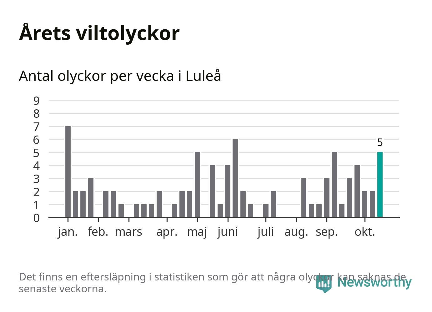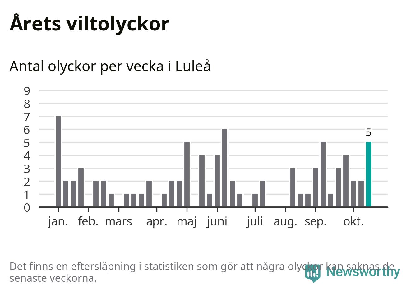 Hittills har fem viltolyckor rapporterats in i Luleå kommun från vecka 43. Se listan här.